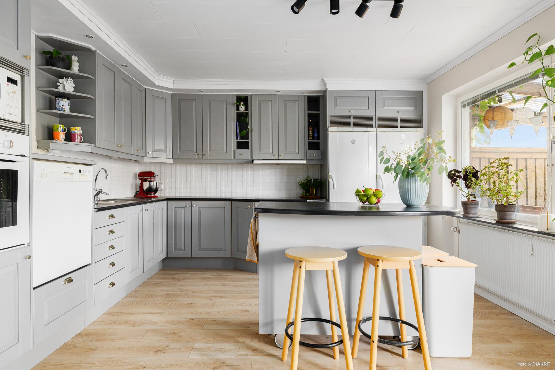 Kök och vardagsrum i öppen planlösning med utgång till altan och baksidan. Gråa köksluckor, köksö, spis, fläkt, kyl/frys och diskmaskin.