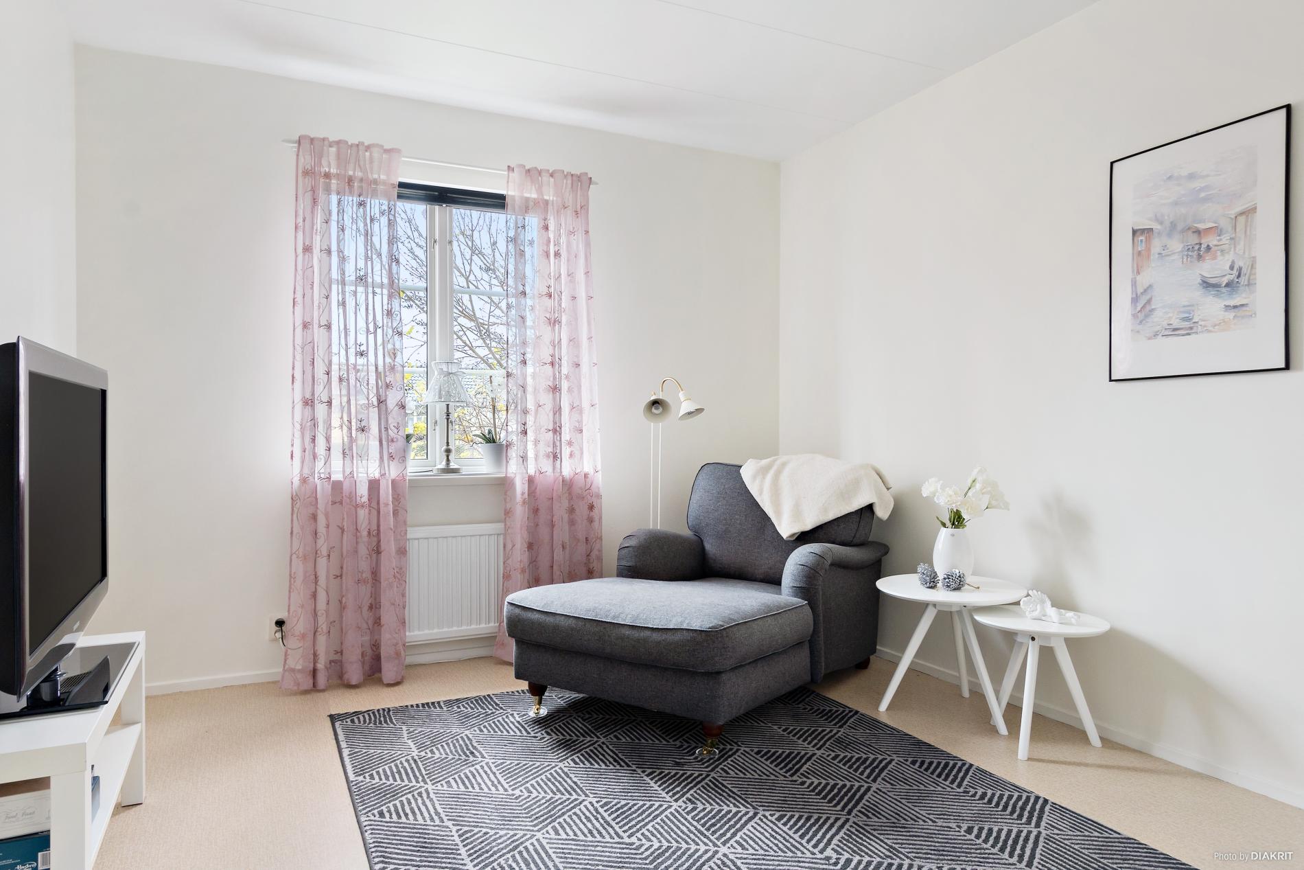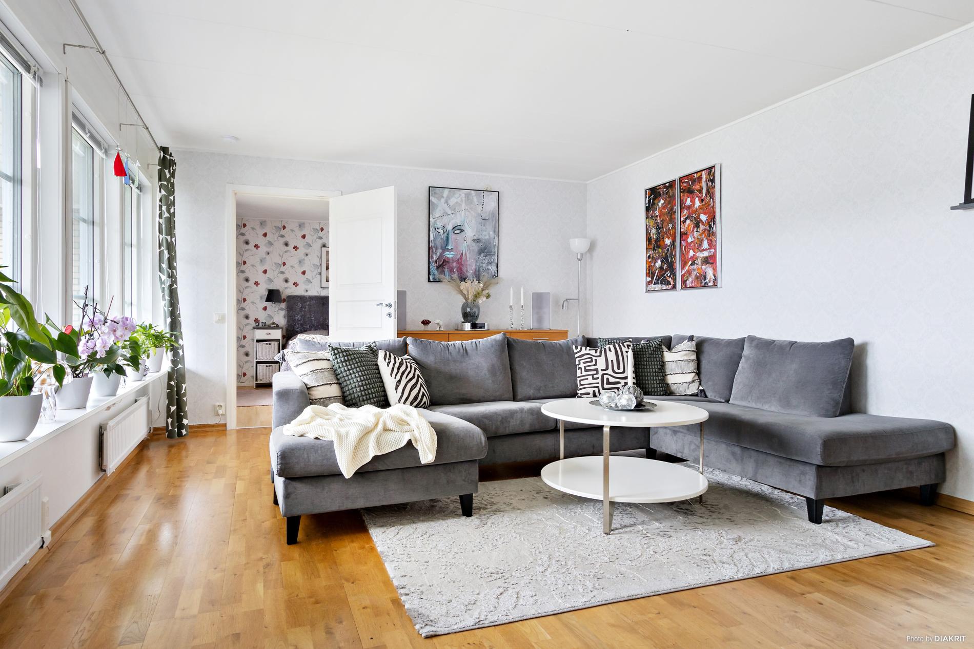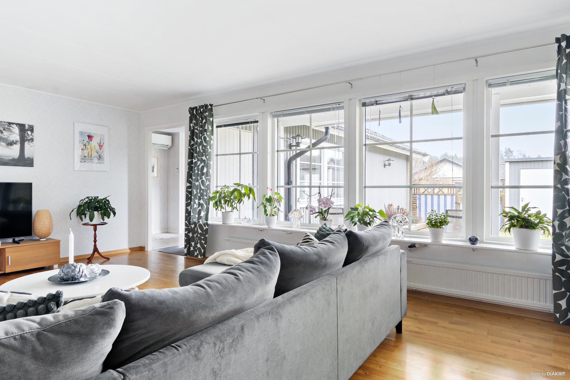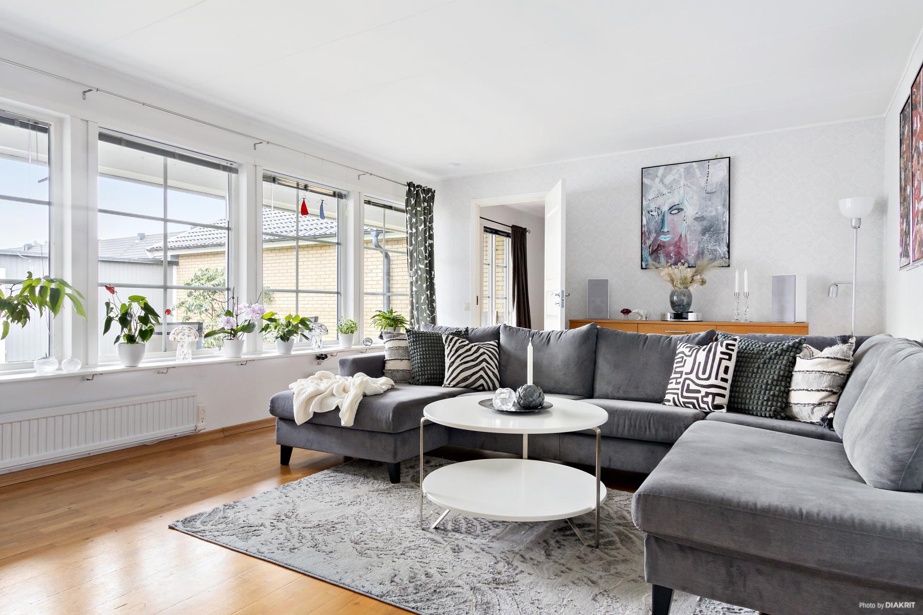 Stort och luftigt vardagsrum med gott om ljusinsläpp. Parkettgolv.