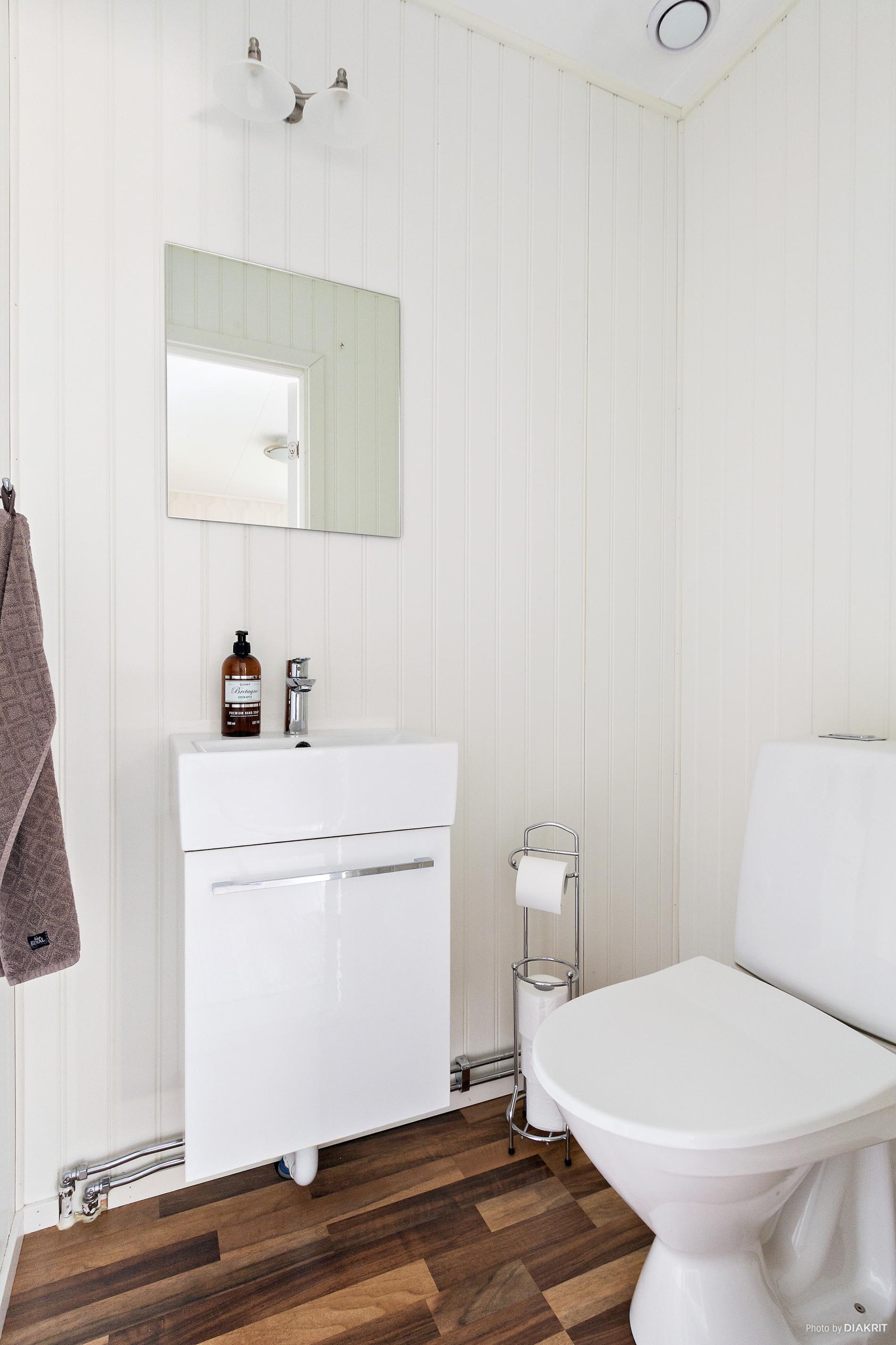 Gästtoalett med handfat och wc.