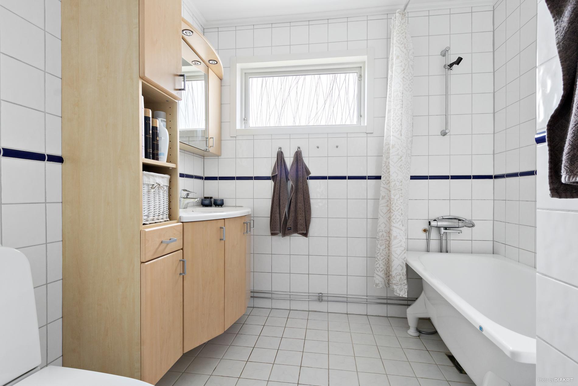 Badrum med klinkers på golv och kakel på väggar. Wc, kommod med tvättställ samt badkar.