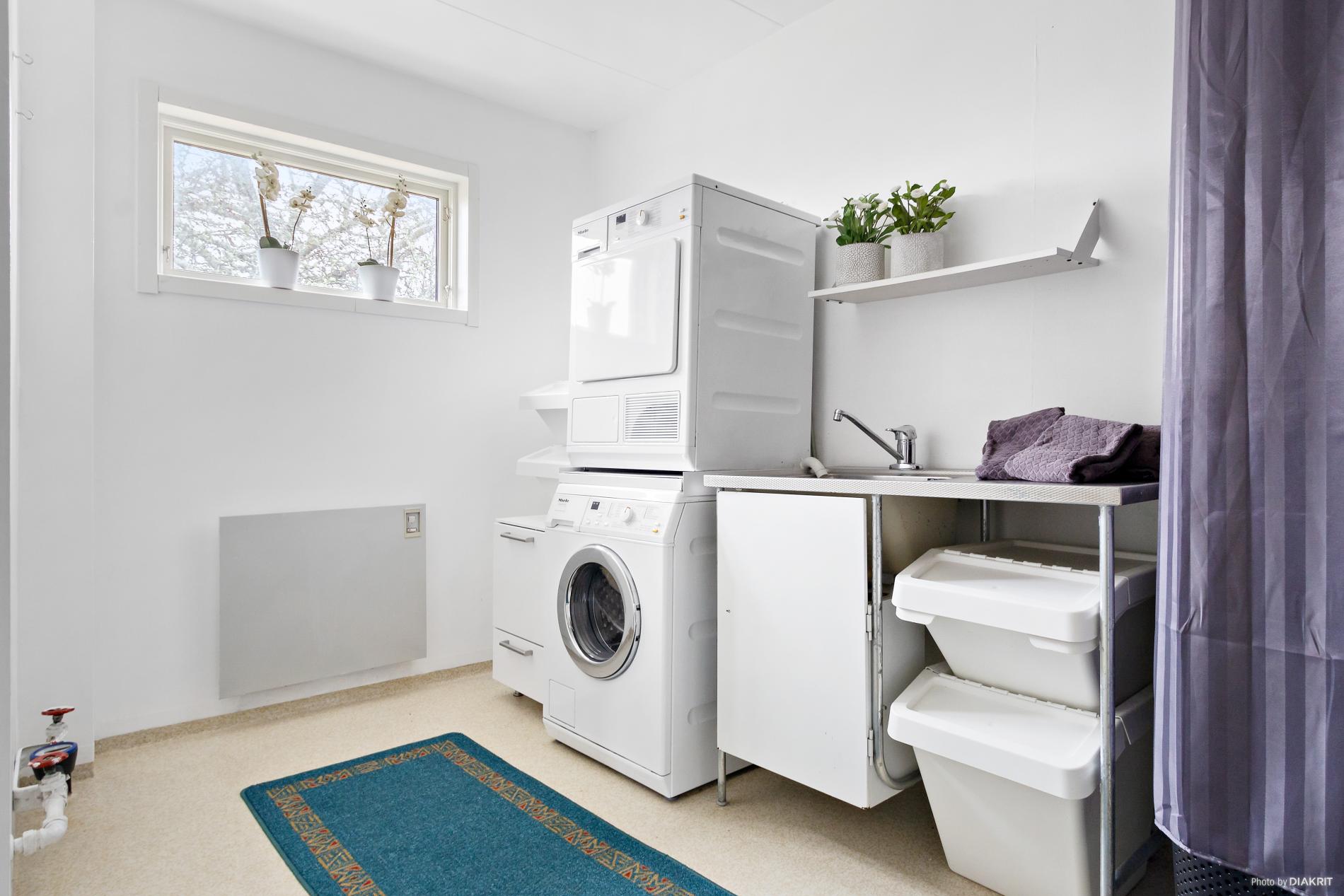 Våtrumsmatta. Tvättmaskin och torktumlare. Tvättho.