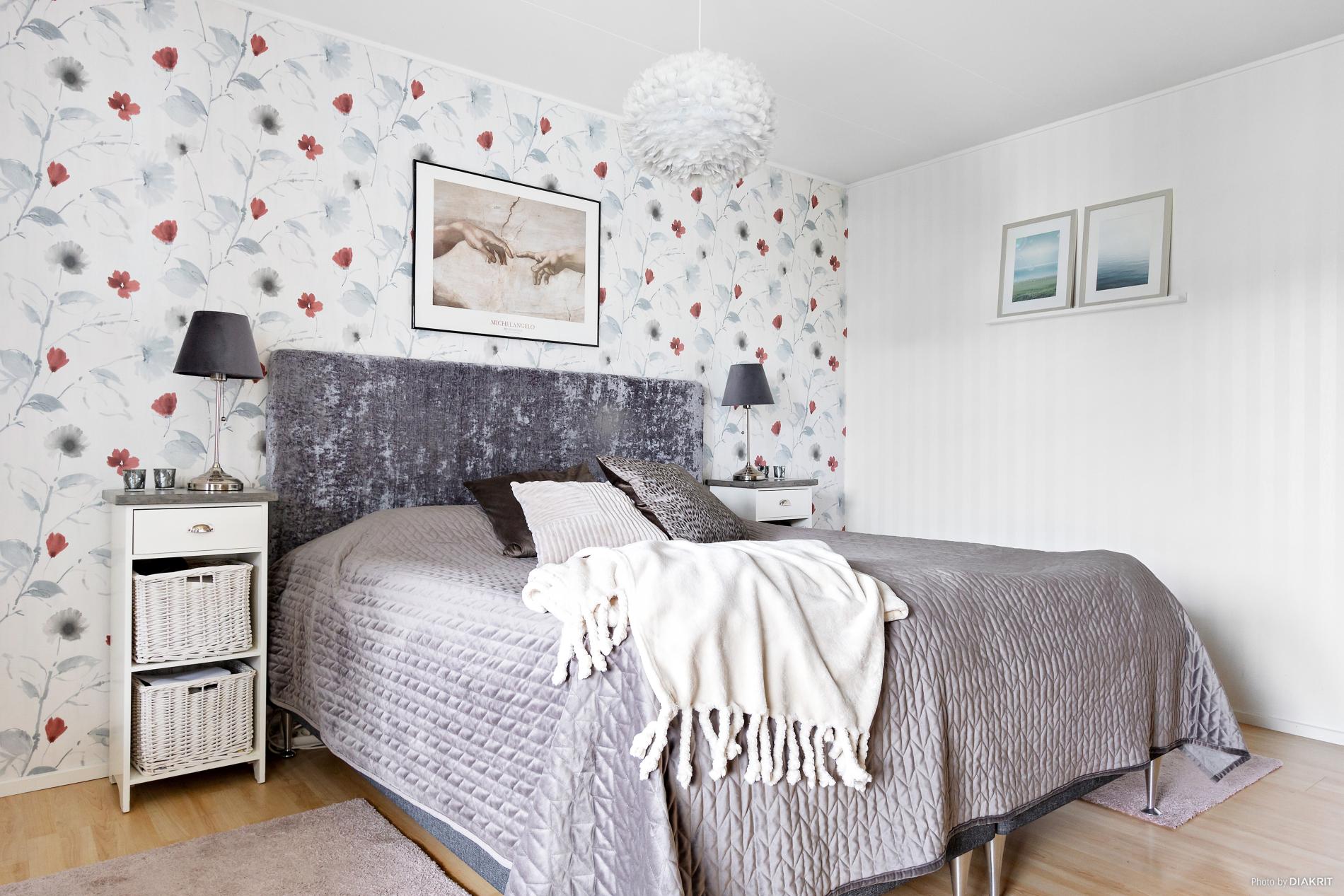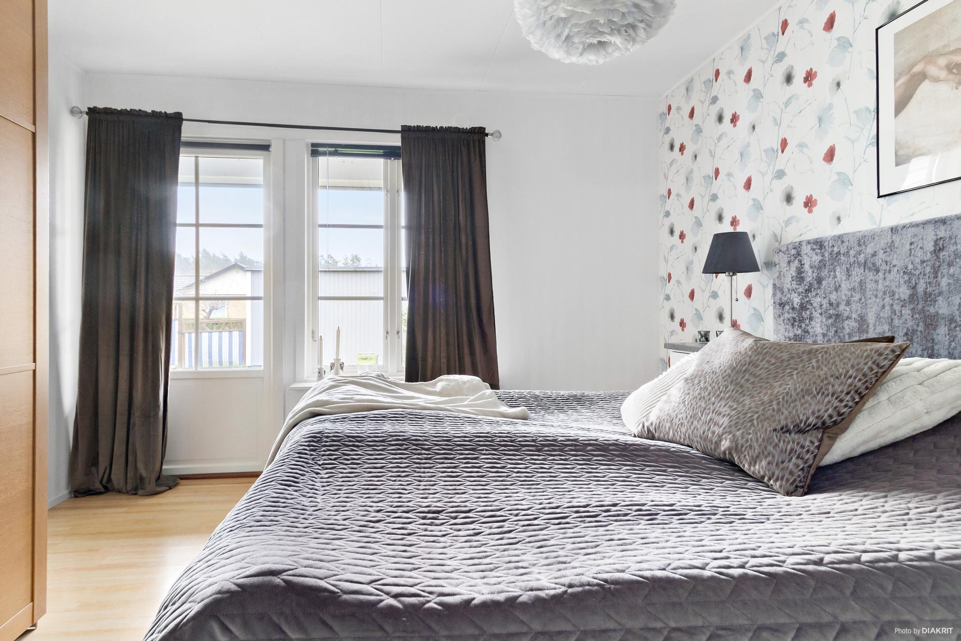 Laminatgolv med tapetserade väggar, stor garderob.