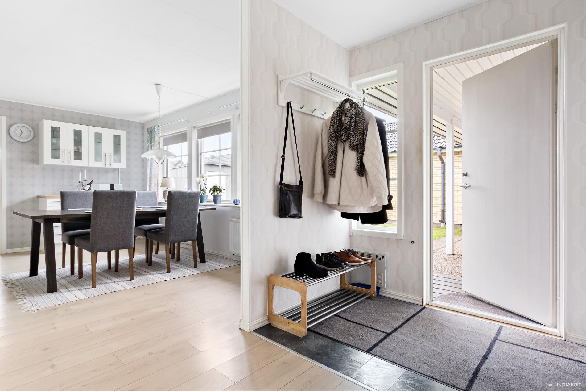 Ljus och rymlig hall med klinkers på golv.