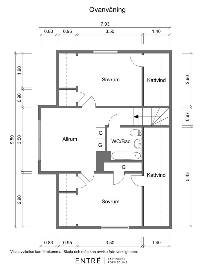 Övre hall med plastmatta på golvet och tapetserade väggar. Här finns tre garderober till förvaring.
