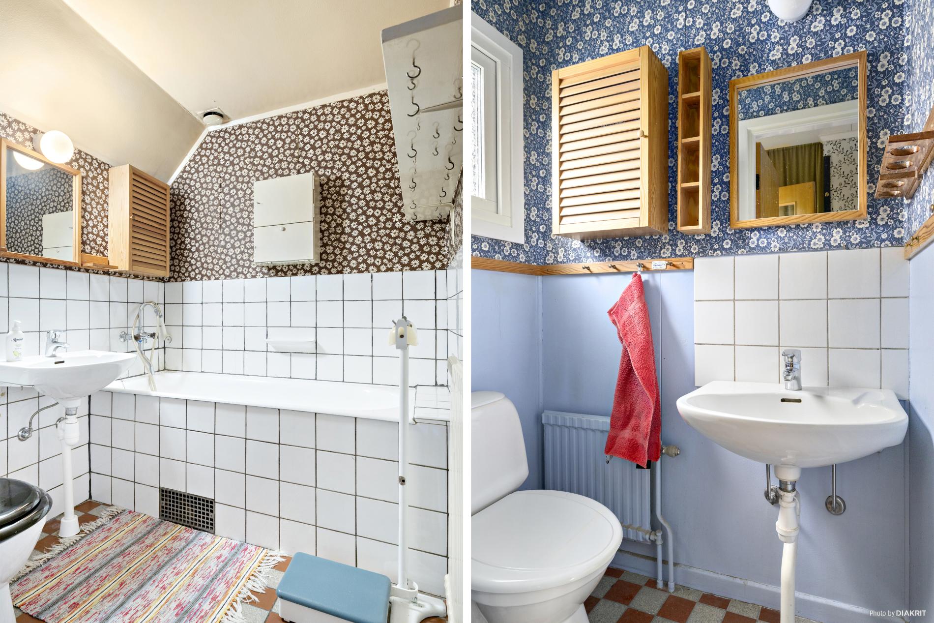 Badrum med klinker på golv och kaklad bröstpanel samt tapetserade väggar. Här är det utrustat med wc-stol, tvättställ och badkar.