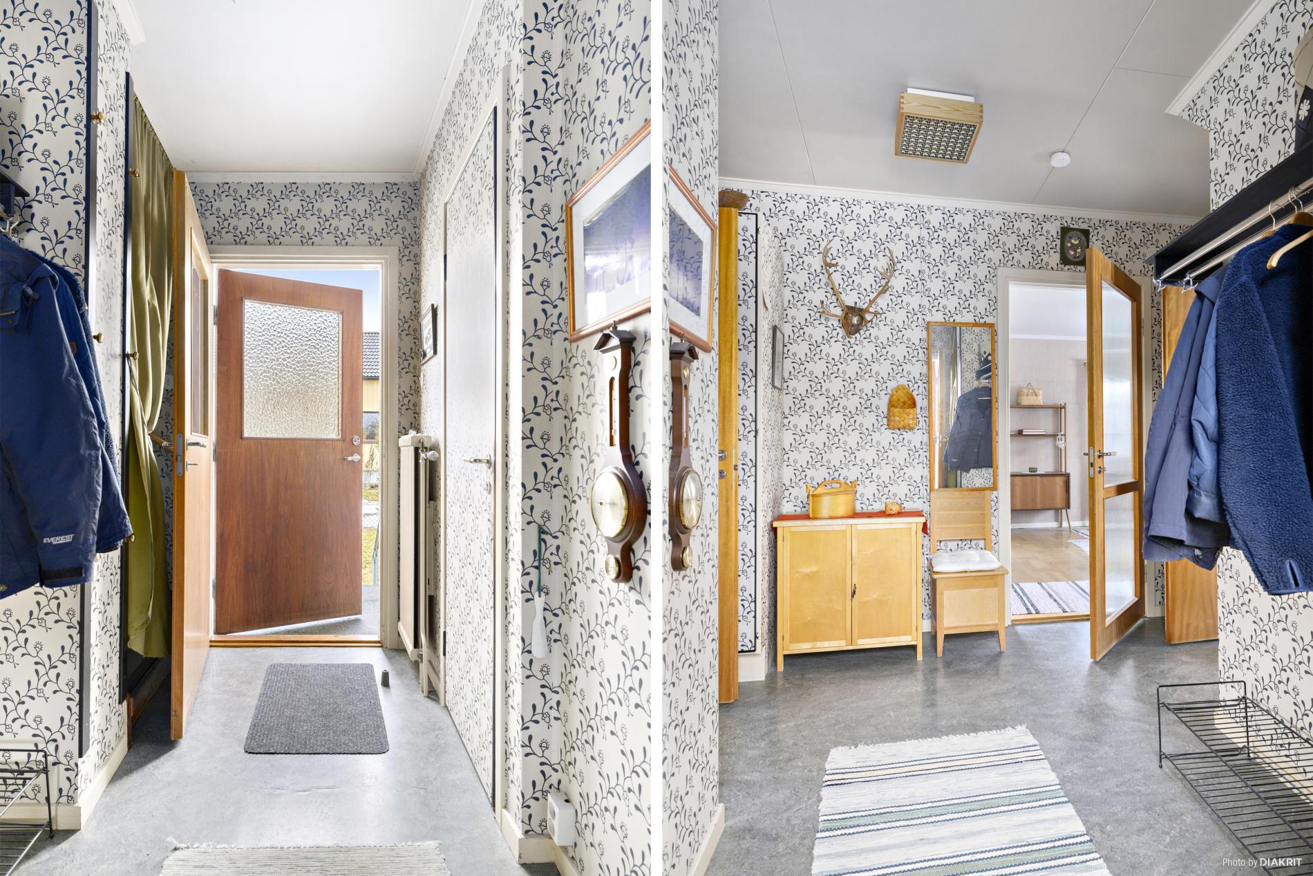 Varmt välkommen in i hallen! Här har du avhängningsyta och två garderober. I hallen är det plastmatta på golvet och tapetserade väggar.