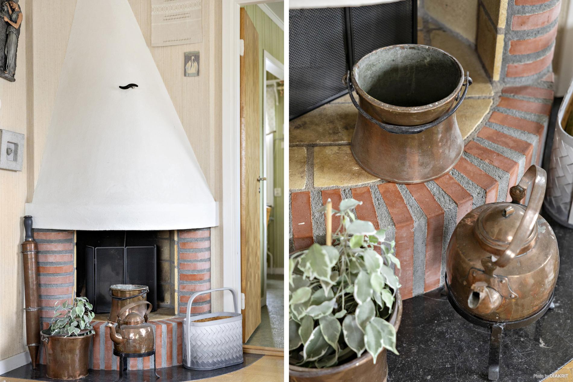 Ej använt öppna spisen på många år så den är ej i bruk, det krävs en kontroll för att användas. Skorstenen övre del är om-murad och ny plåt 2007.