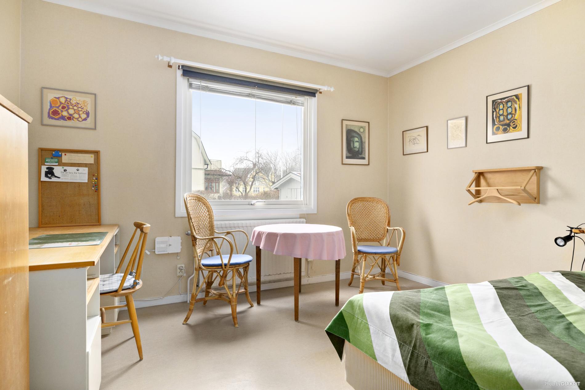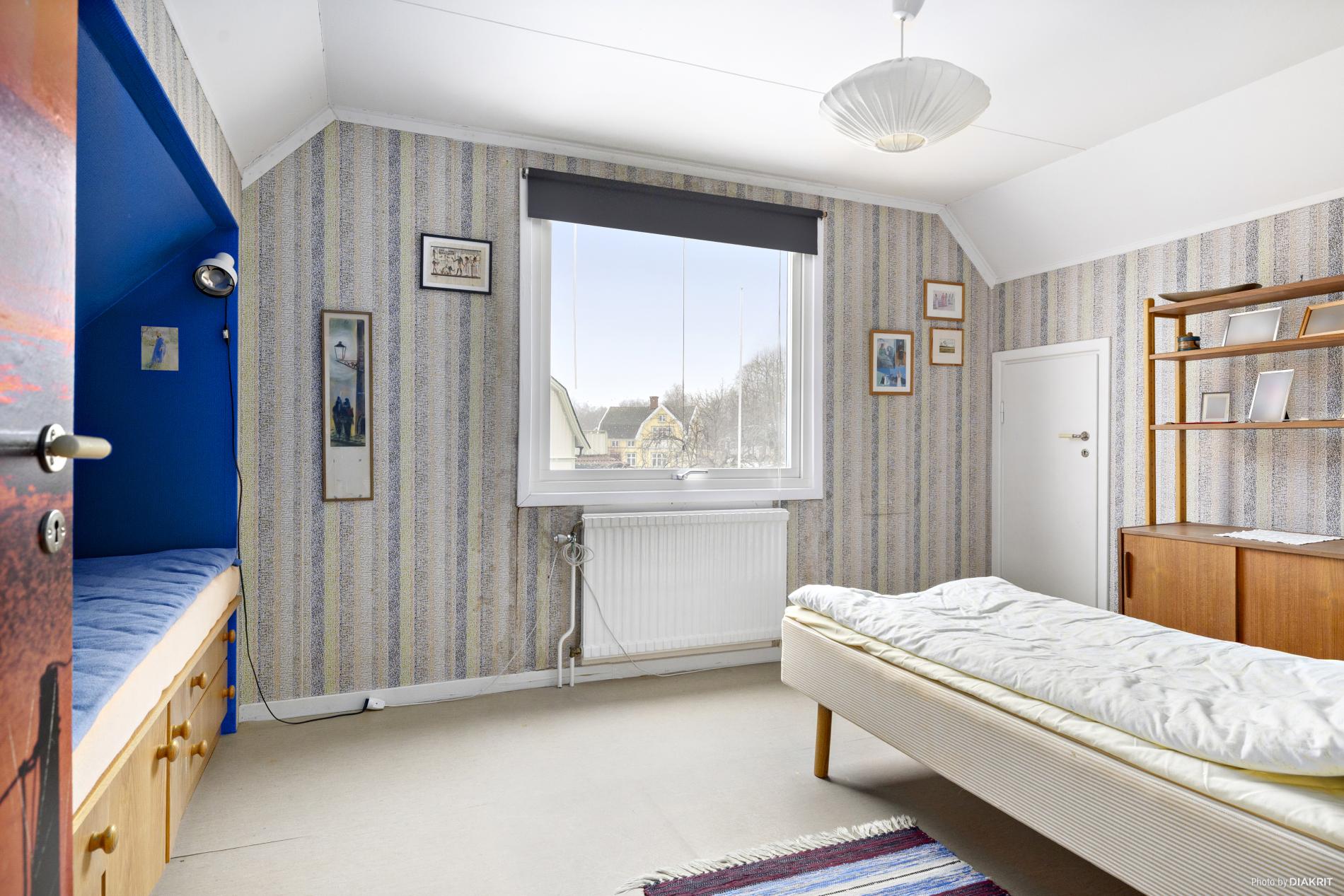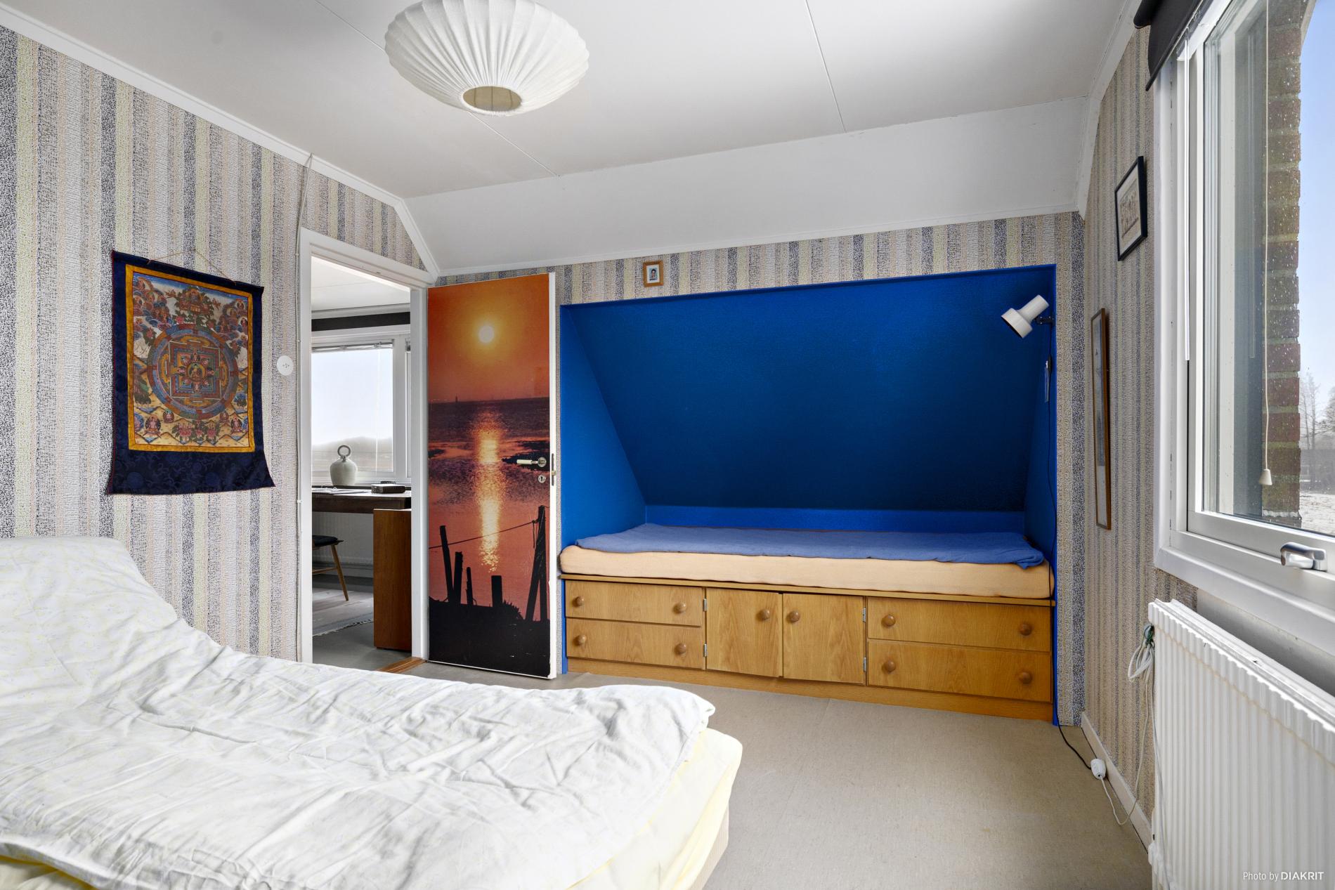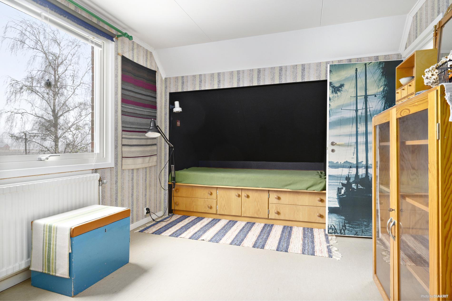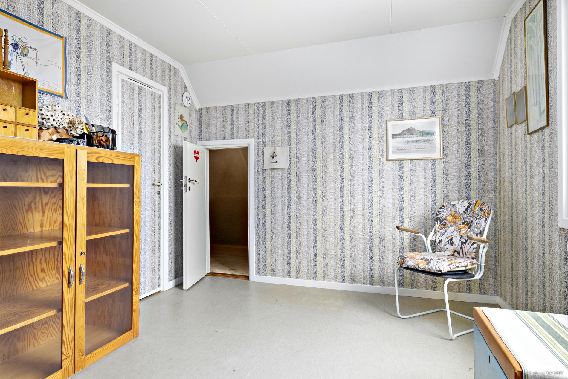 Sovrum med plastmatta på golvet och tapetserade väggar. Här finns kattvind och garderob till förvaring.
