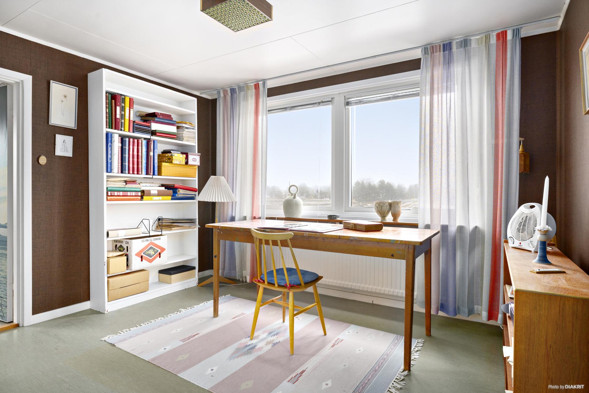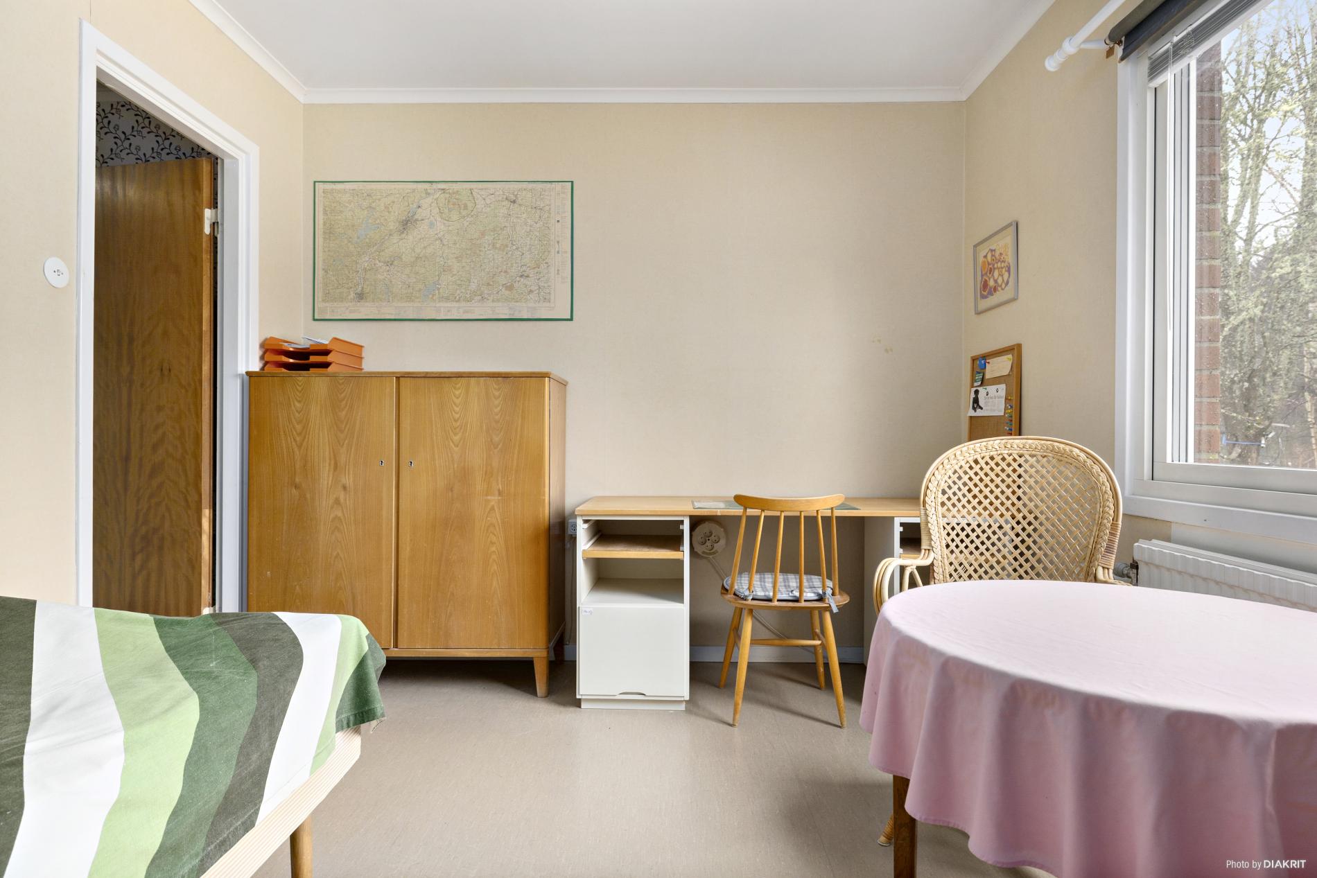 Sovrum eller hemmakontor med plastmatta på golvet och tapetserade väggar.