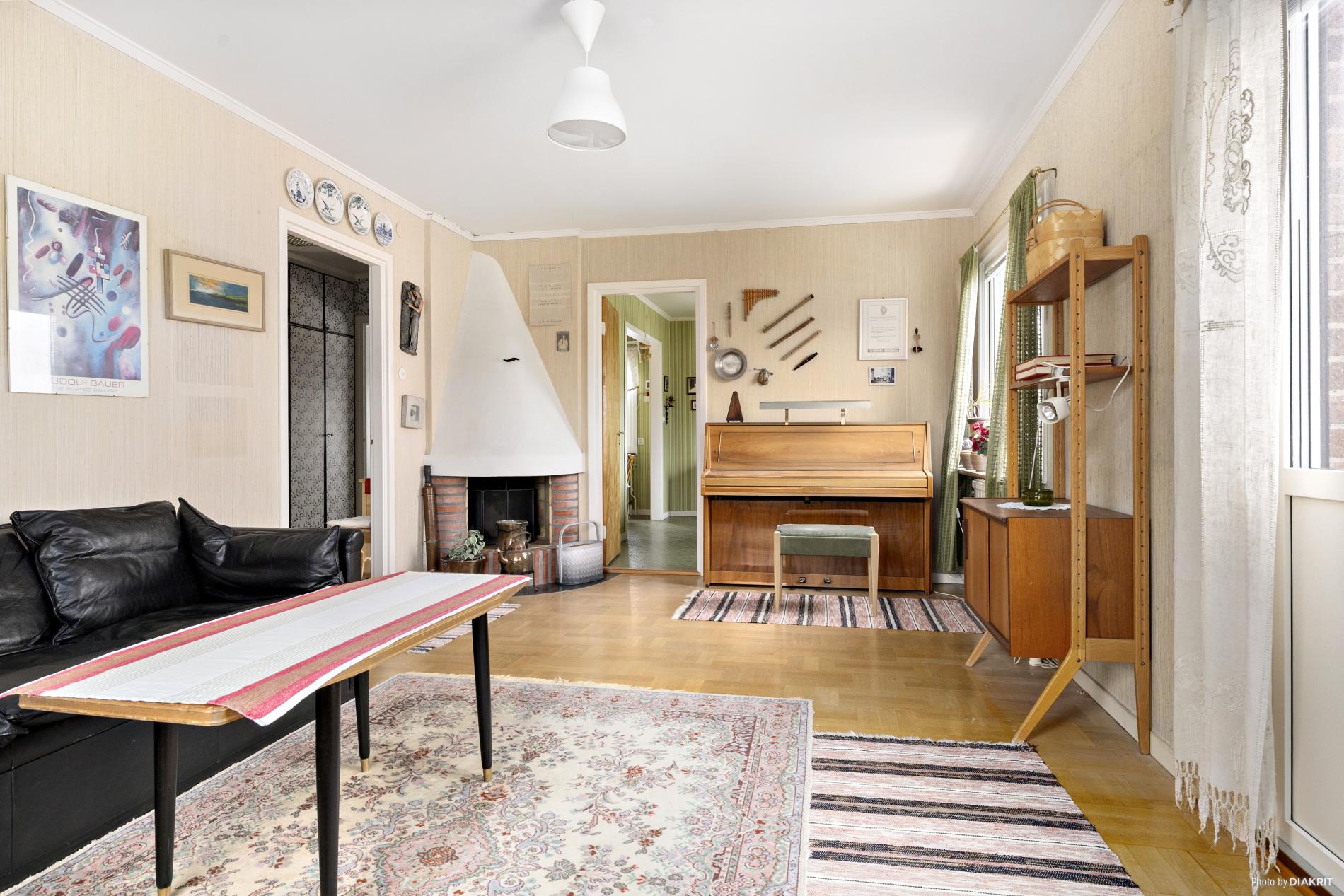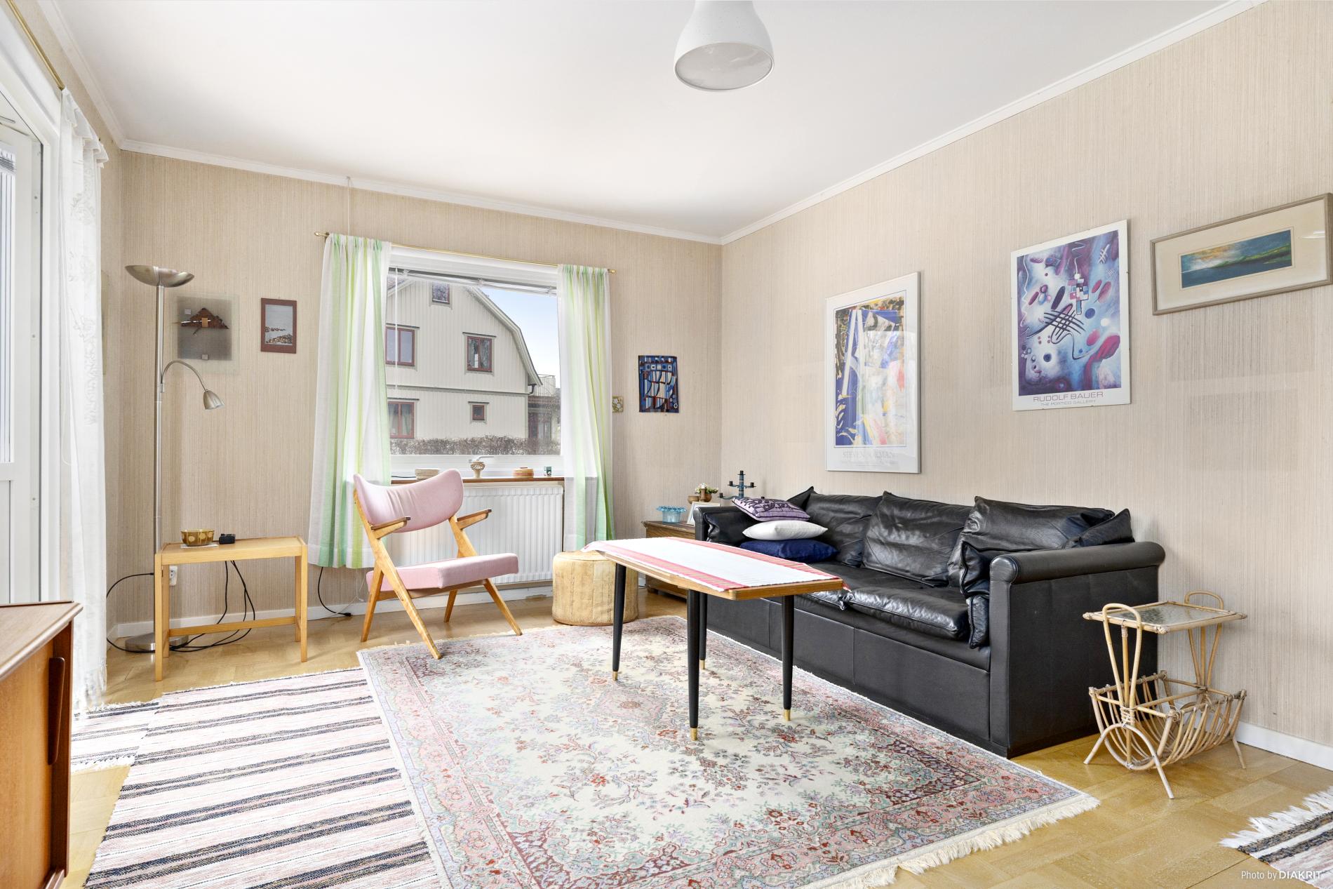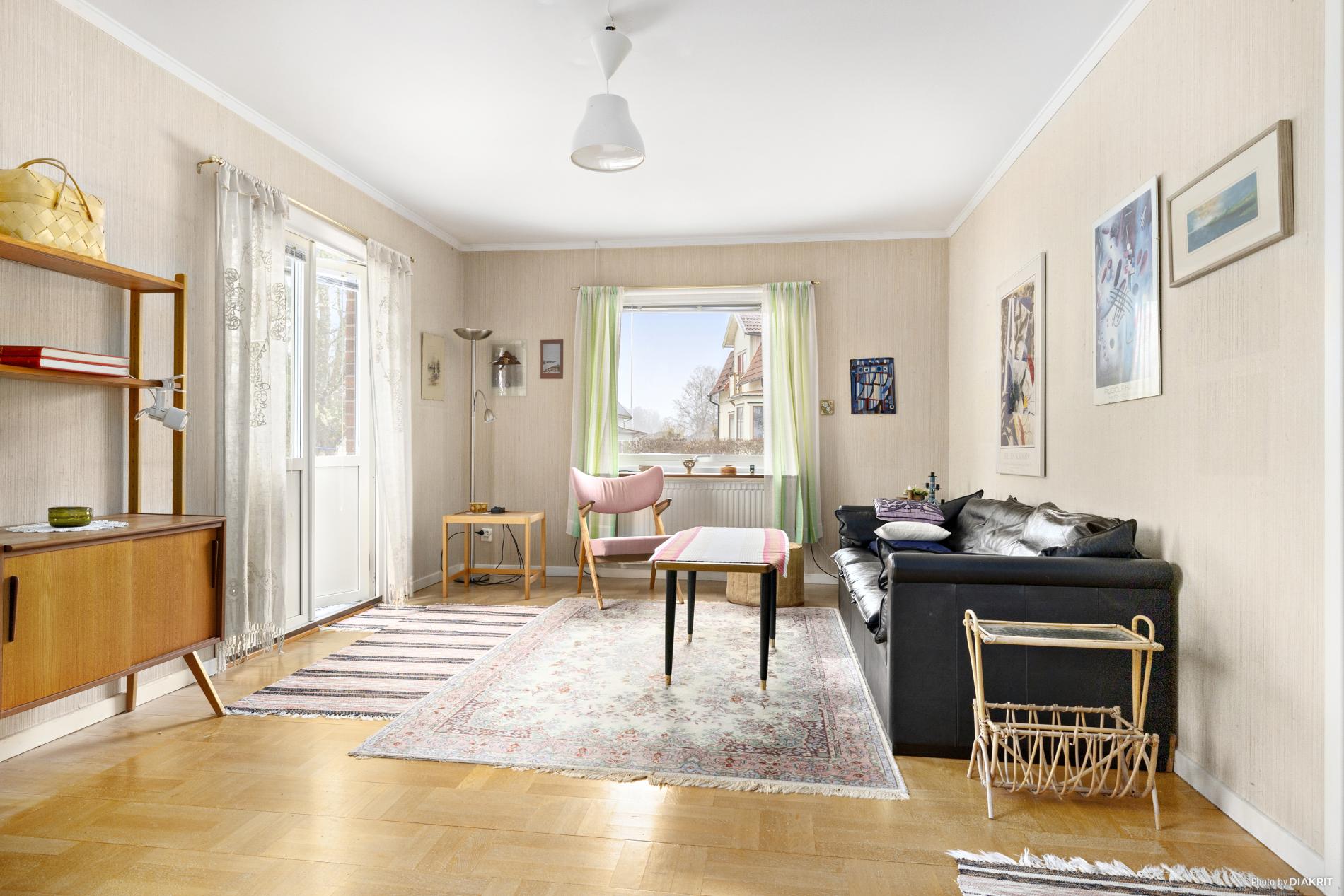 Vardagsrum med parkettgolv och tapetserade väggar.