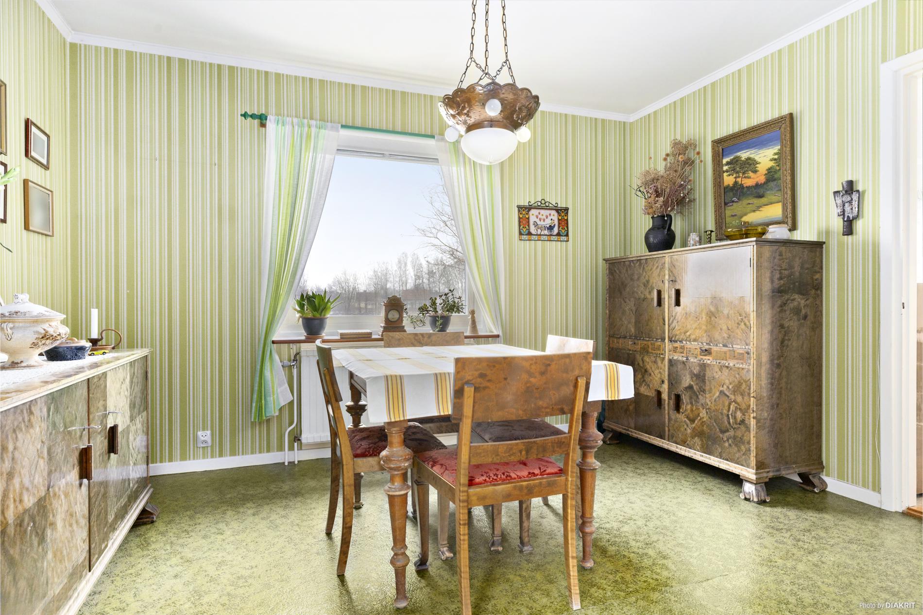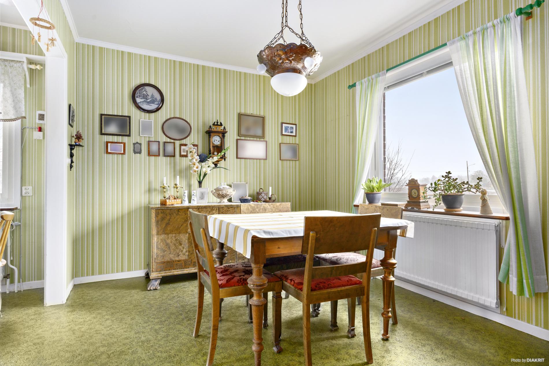 Matsal med plastmatta på golvet och tapetserade väggar.