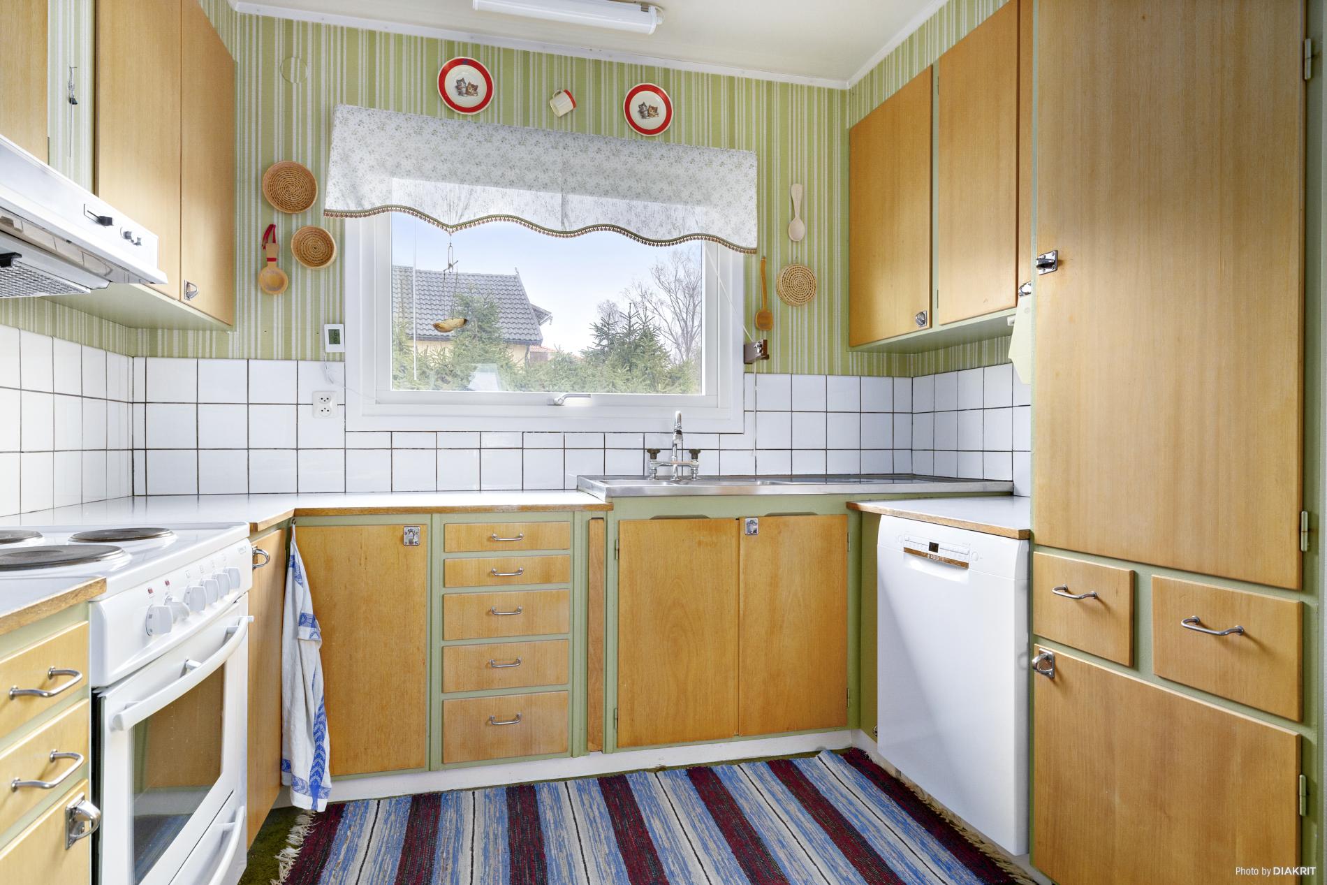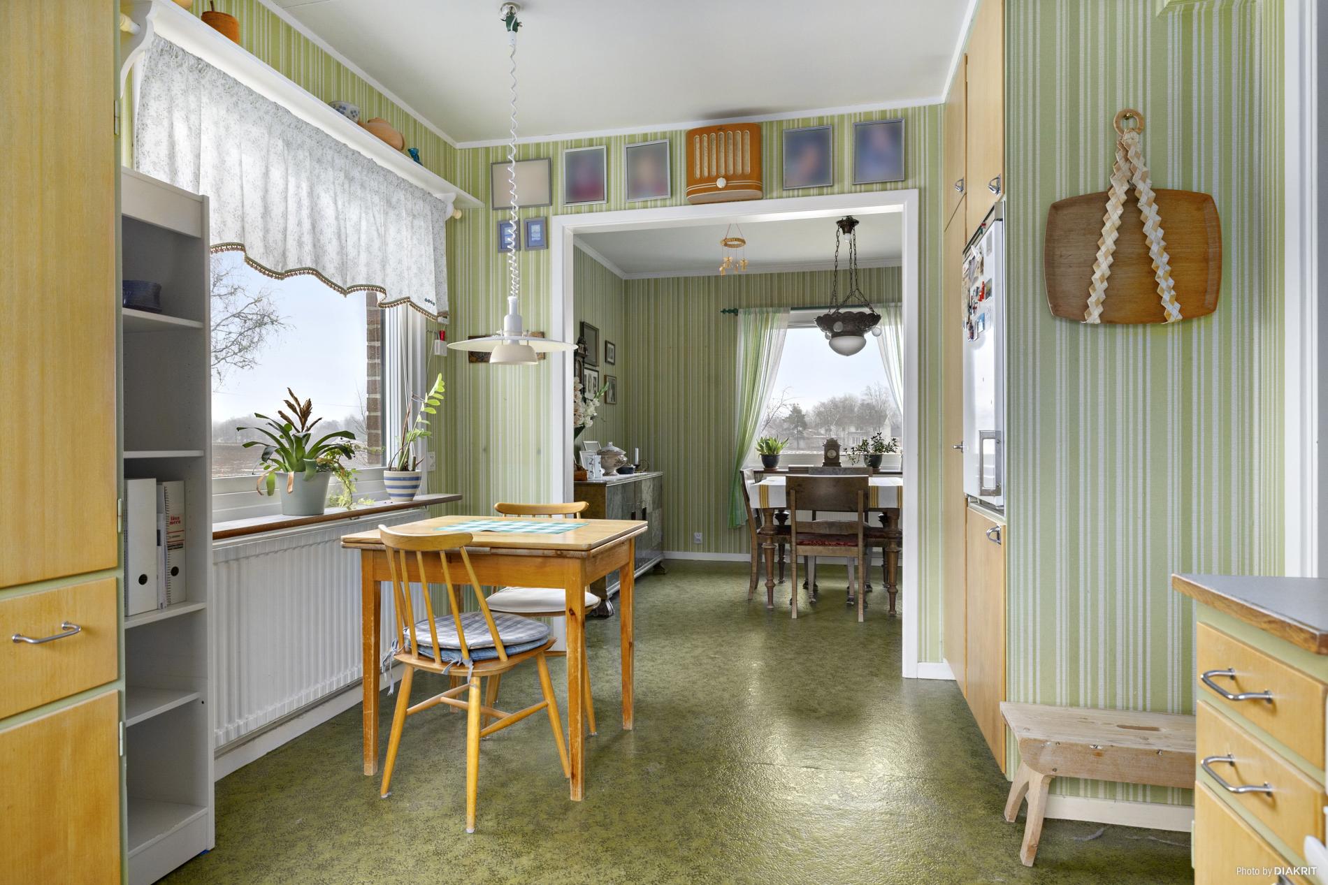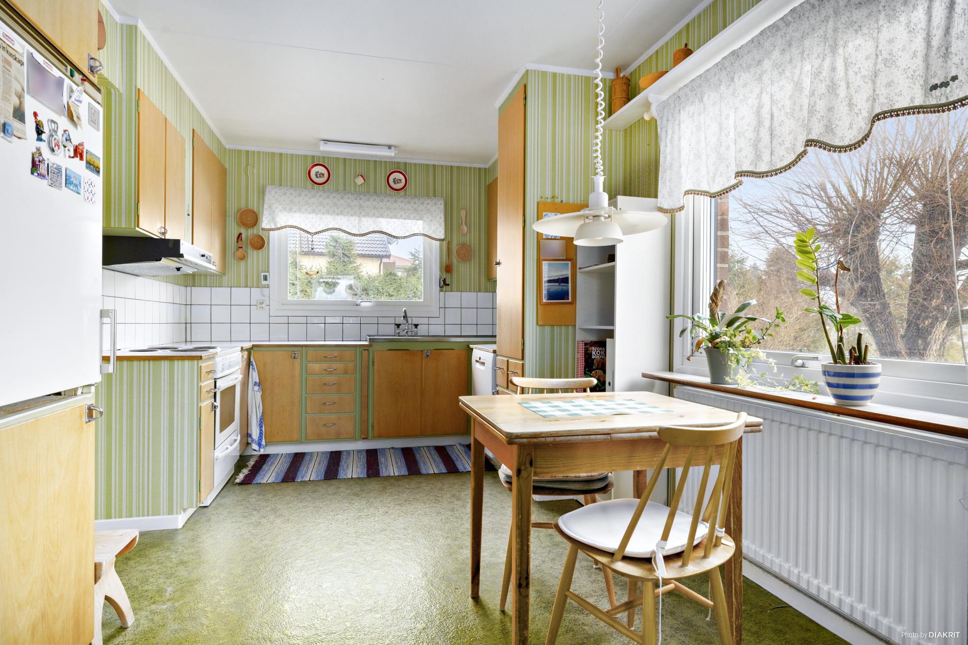 Kök med plats för köksbord. Köket har omlackade luckor och är utrustat med diskbänk, spis, diskmaskin och kylskåp. Här i köket är det plastmatta på golvet och tapetserade väggar.