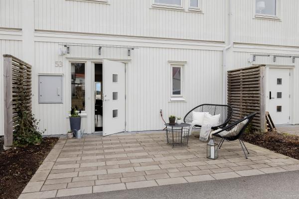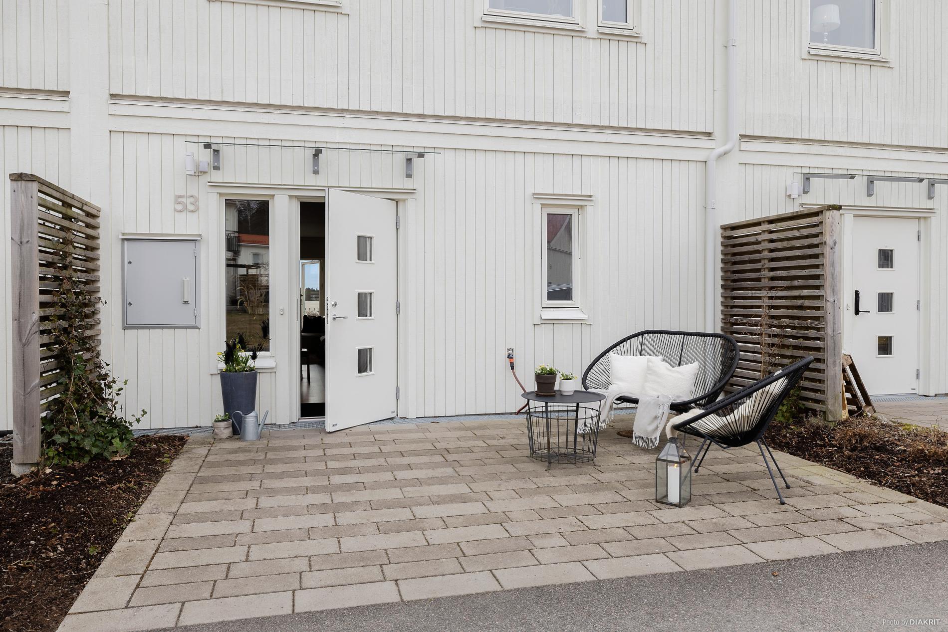 Stenlagd uteplats intill bostadens entré med morgonsol.