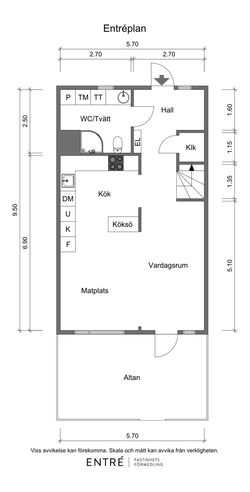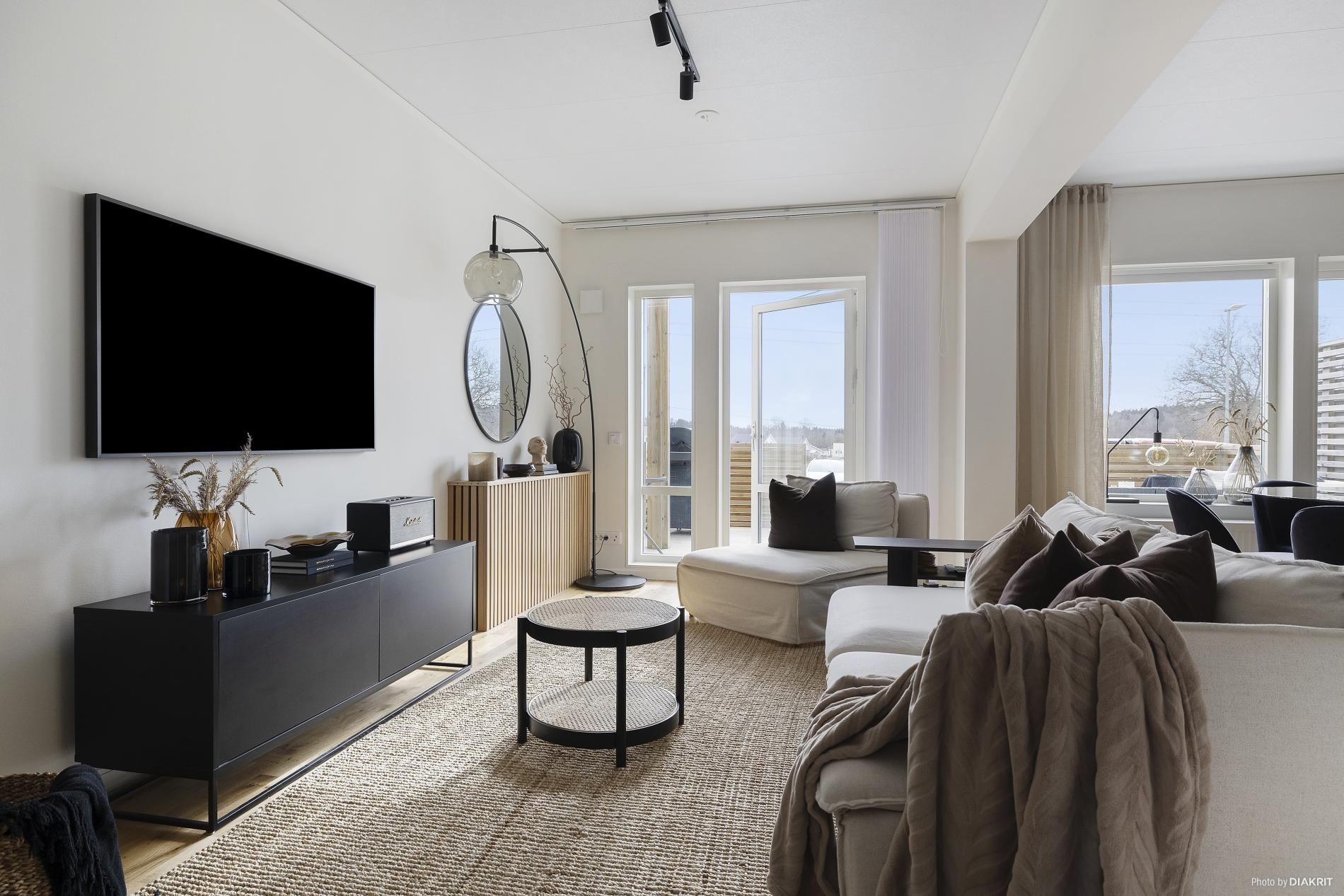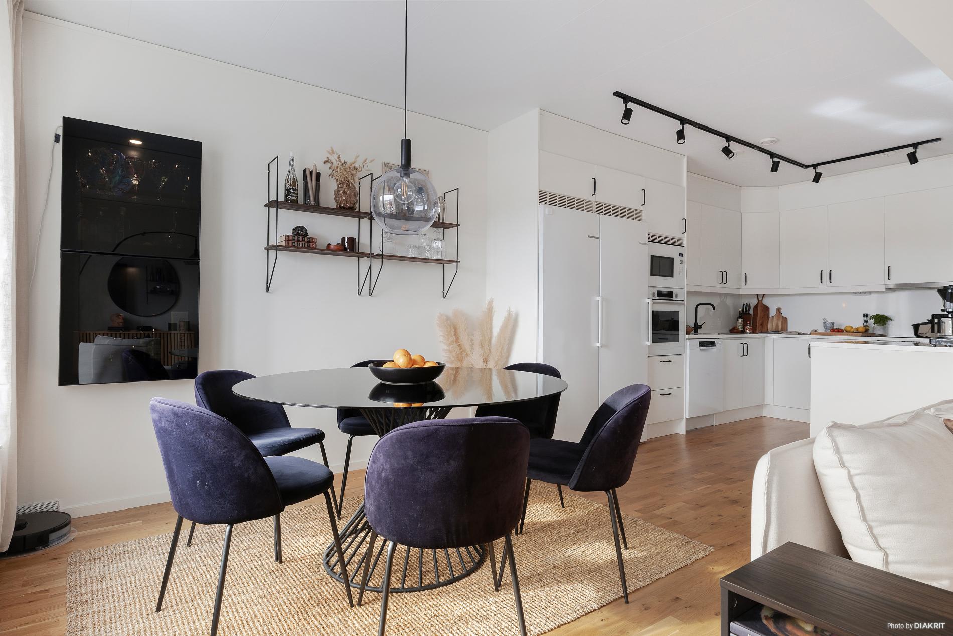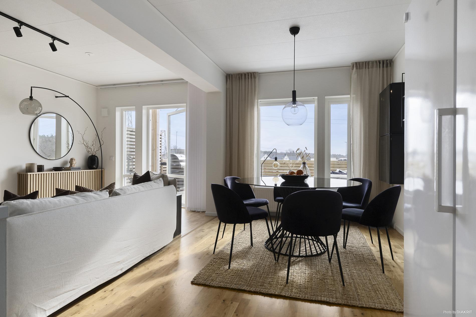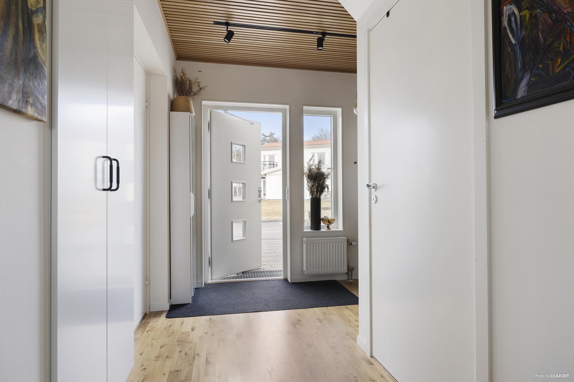 På entréplan möts du av hemmets sociala ytor i en öppen och inbjudande planlösning där kök och vardagsrum samspelar på ett naturligt sätt. Här finns gott om plats för både matgrupp och soffgrupp, samt en naturlig tv-hörna som skapar en trivsam samlingspunkt. På samma plan finns även ett badrum utrustat med tvättmaskin och torktumlare, vilket underlättar vardagen. Från vardagsrummet nås den generösa altanen – en härlig uteplats med gott om utrymme för både loungegrupp och grill, perfekt för sommarens alla tillfällen.