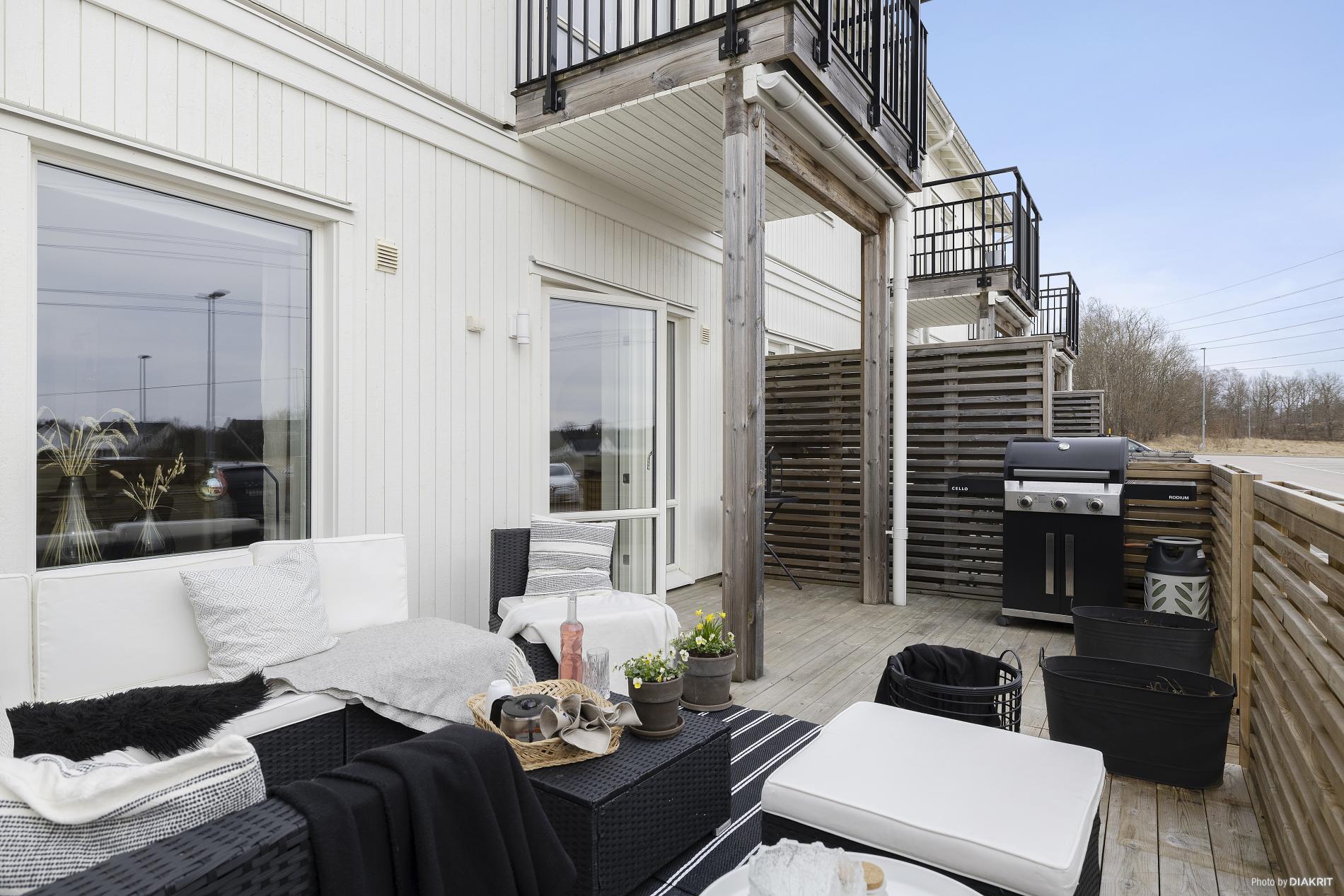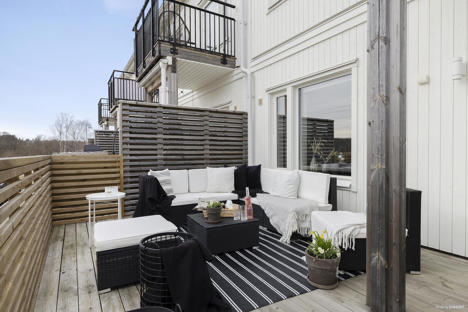 Stor och trevlig altan i bästa solläge. Öppet läge mot parkering och natur