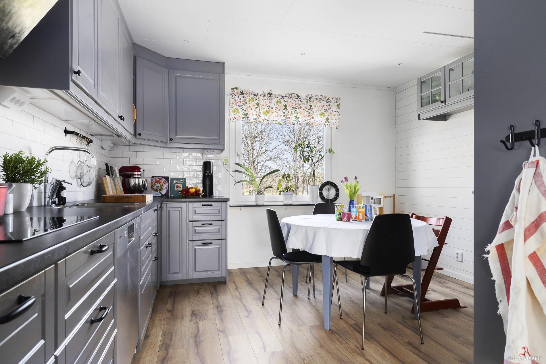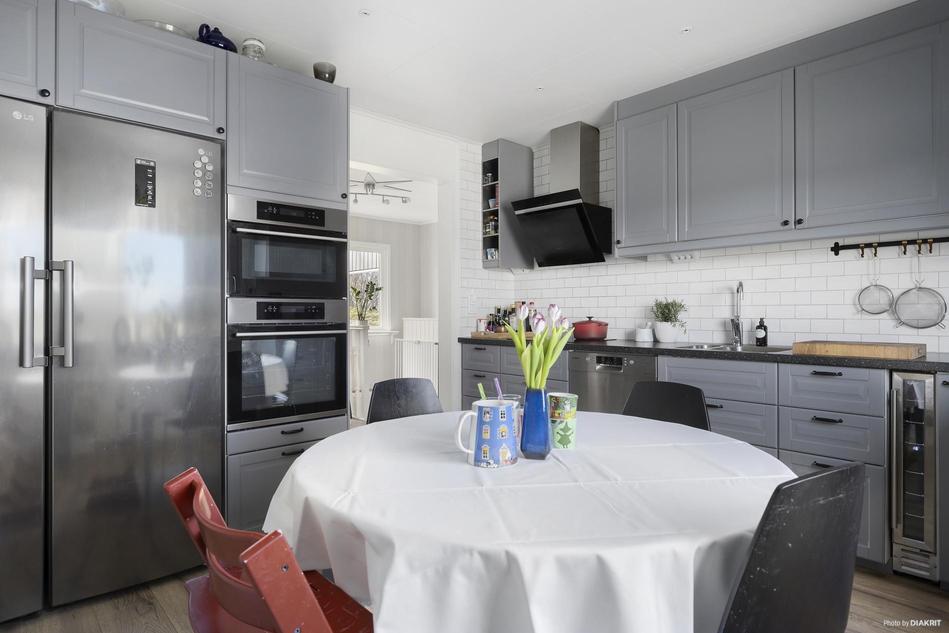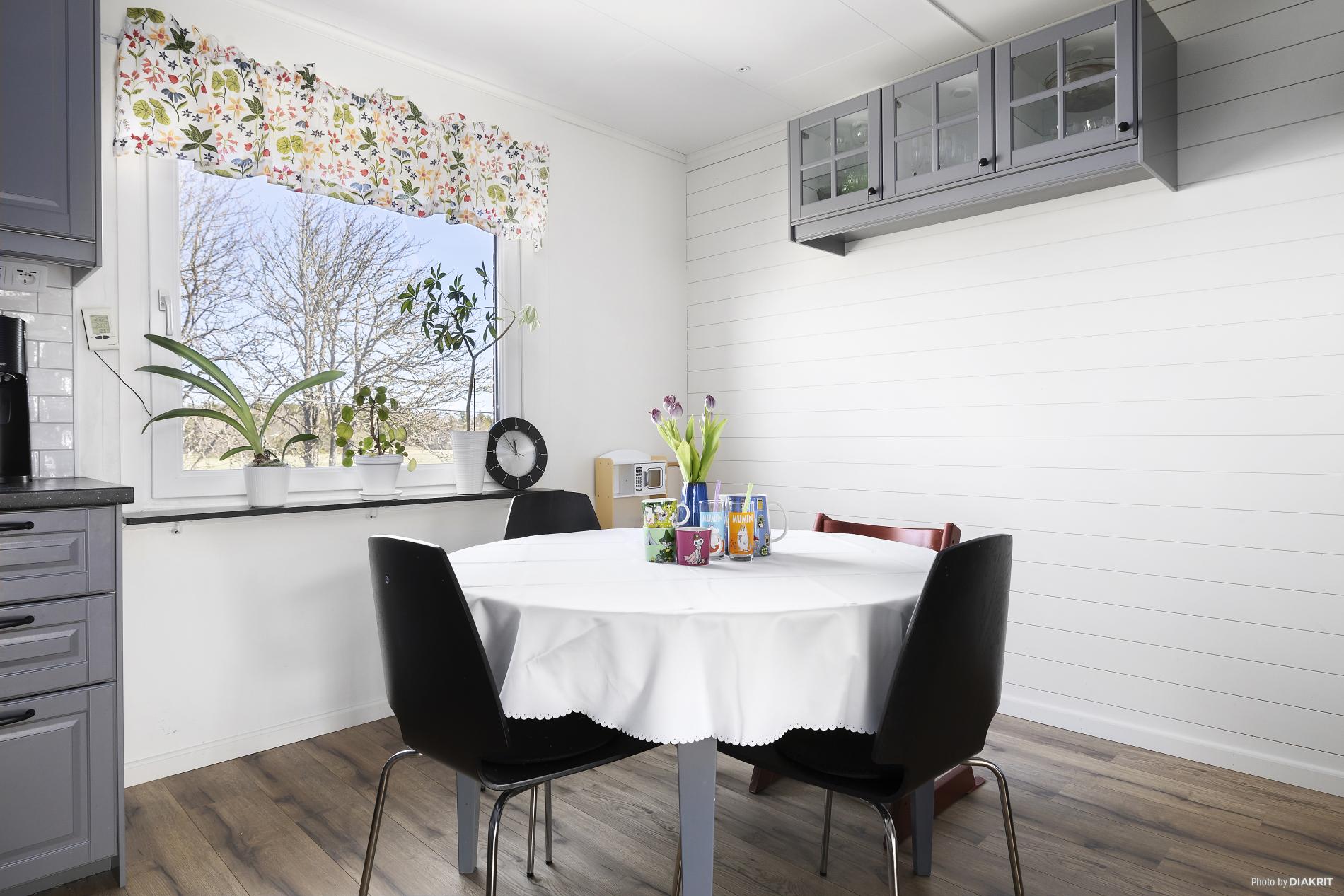 Renoverat lantligt kök med matplats. Här är det laminatgolv och målade väggar samt bröstpanel. Köket är utrustat med diskmaskin, fullhöjdskyl och frys, vin-kyl, inbyggnadsugn och mikro samt häll med spisfläkt.