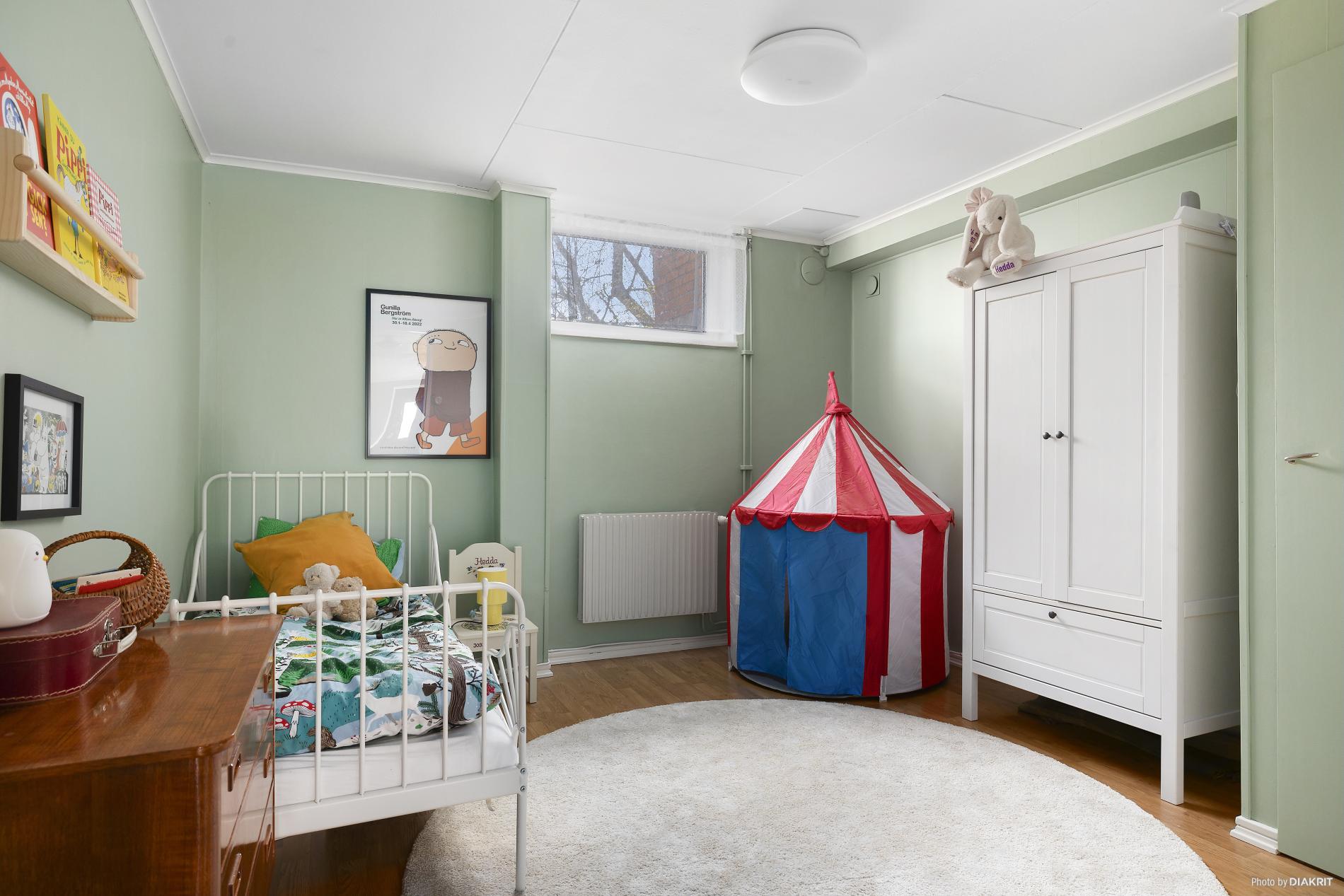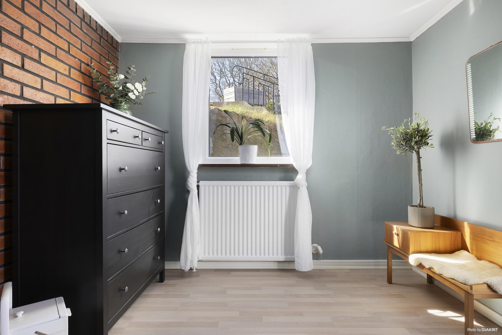 Sovrum med laminatgolv och målade väggar. Här i sovrummet finns en klädkammare där hydropressen står och en garderob till förvaring där golvvärmecentralen till badrummet sitter.