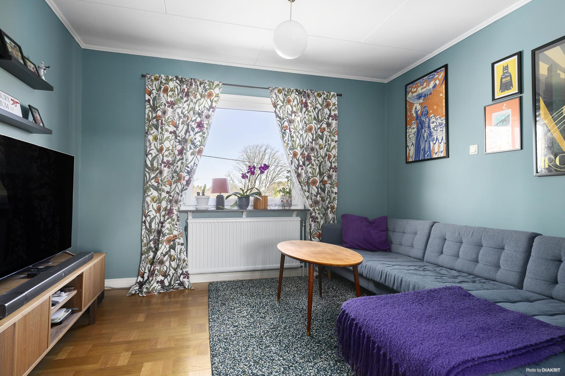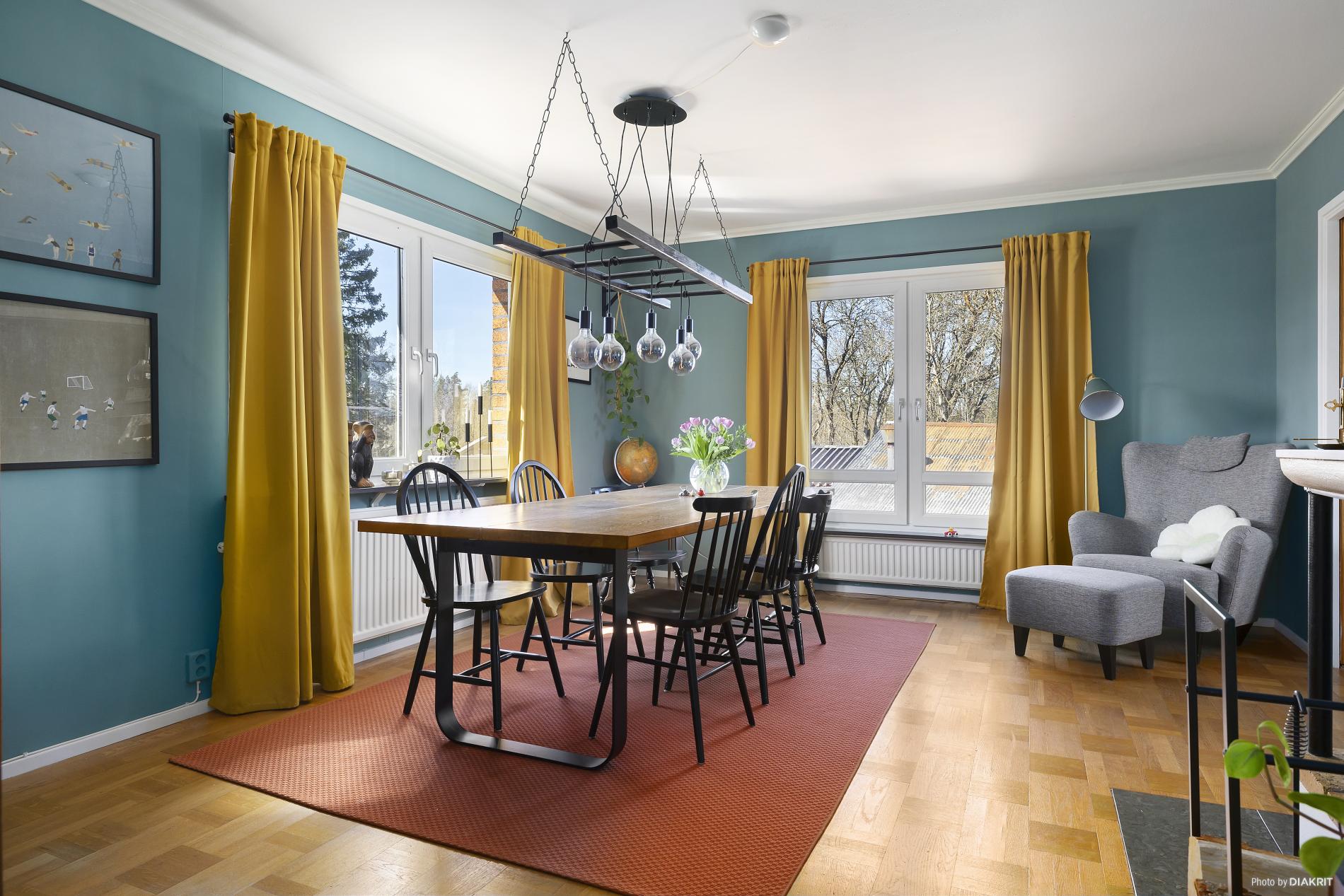 Vardagsrum med parkettgolv och tapetserade väggar. Här finns trevliga skjutdörrar in till matsalen. Detta rum kan även användas som ytterligare sovrum.