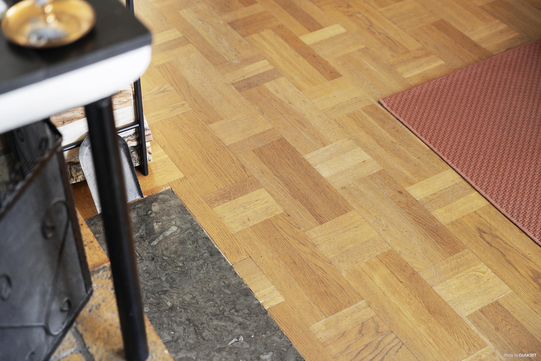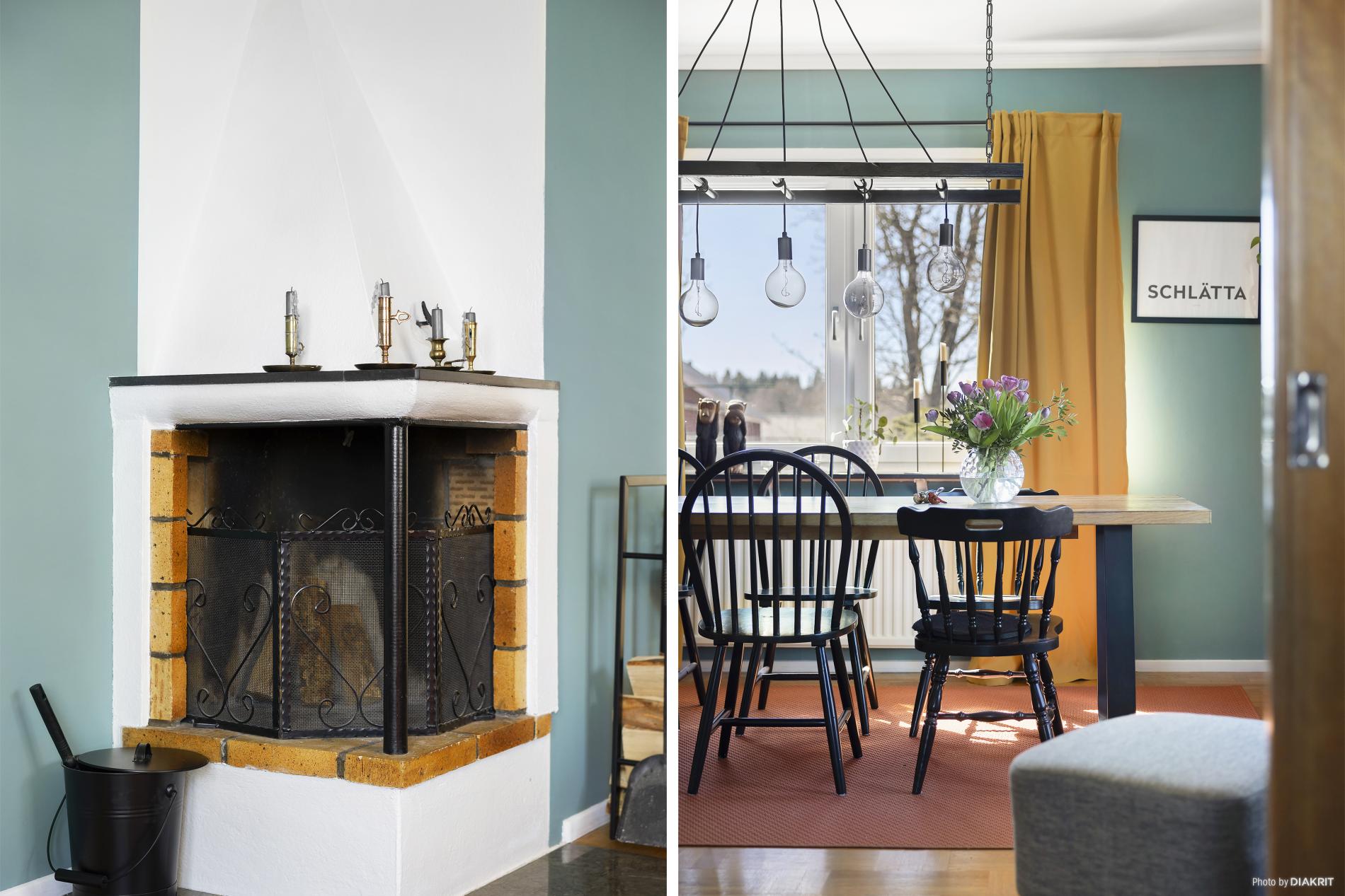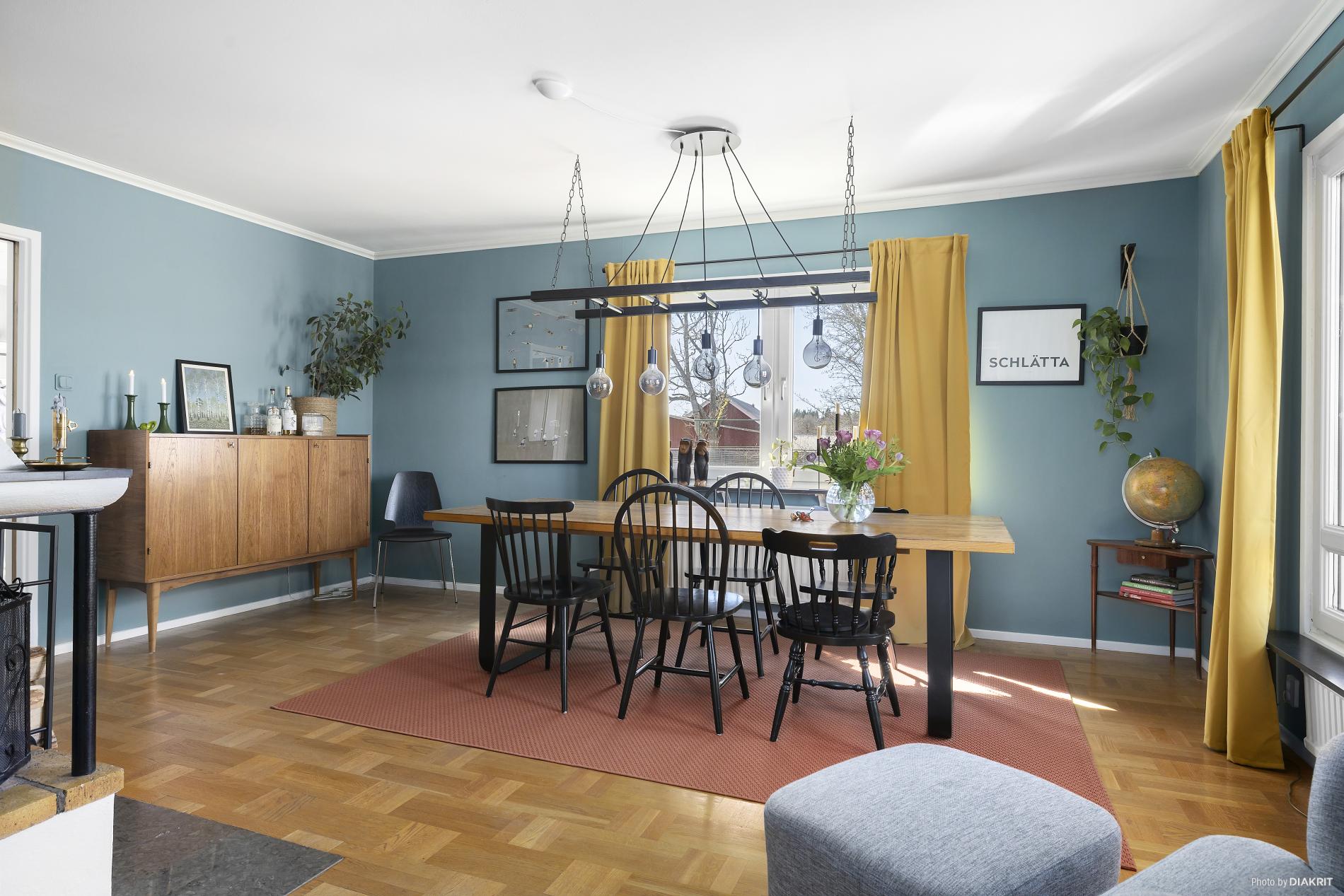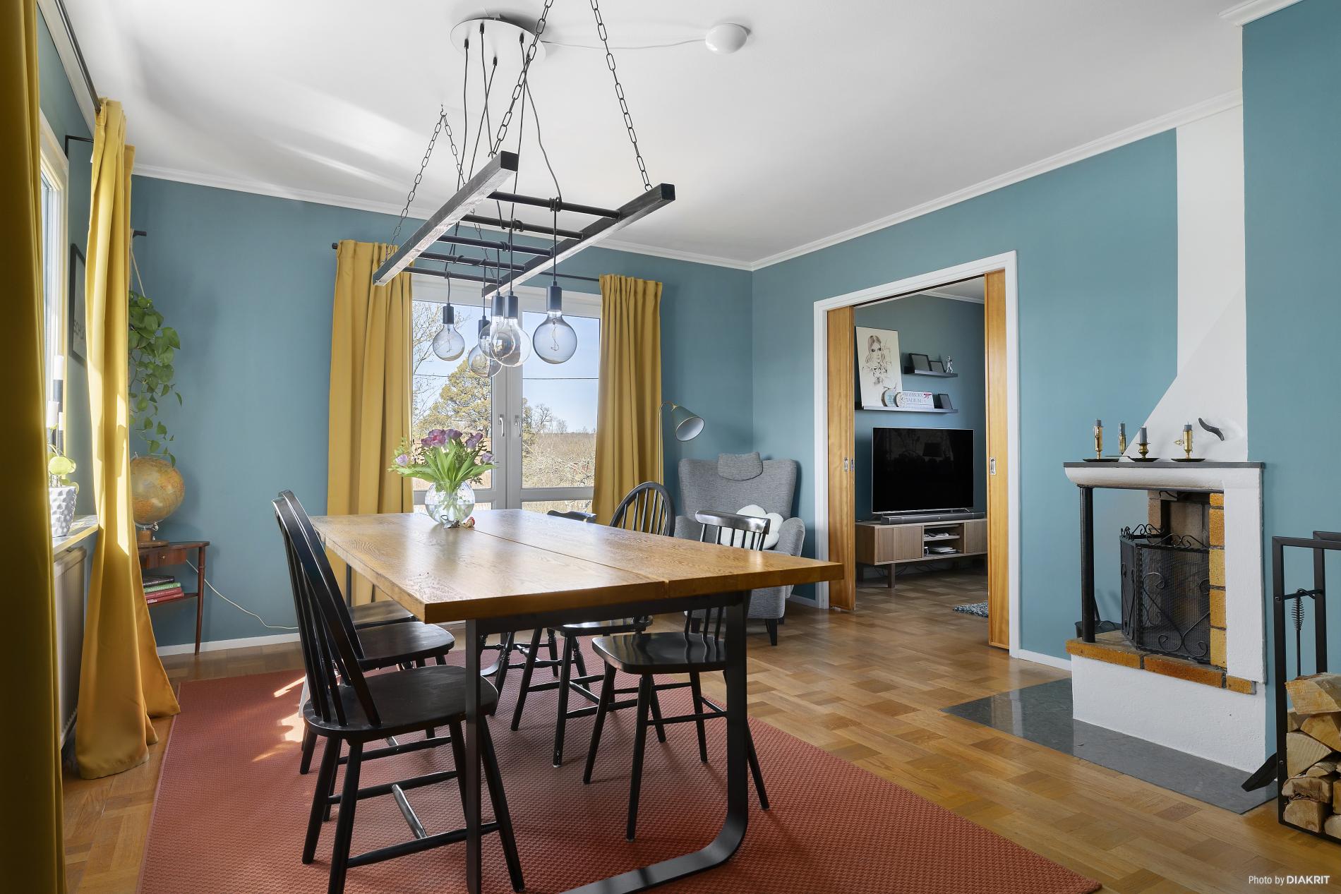 Ljust och luftigt rum i vinkel till vardagsrummet. Här är det parkettgolv, tapetserade väggar och trevlig kamin.