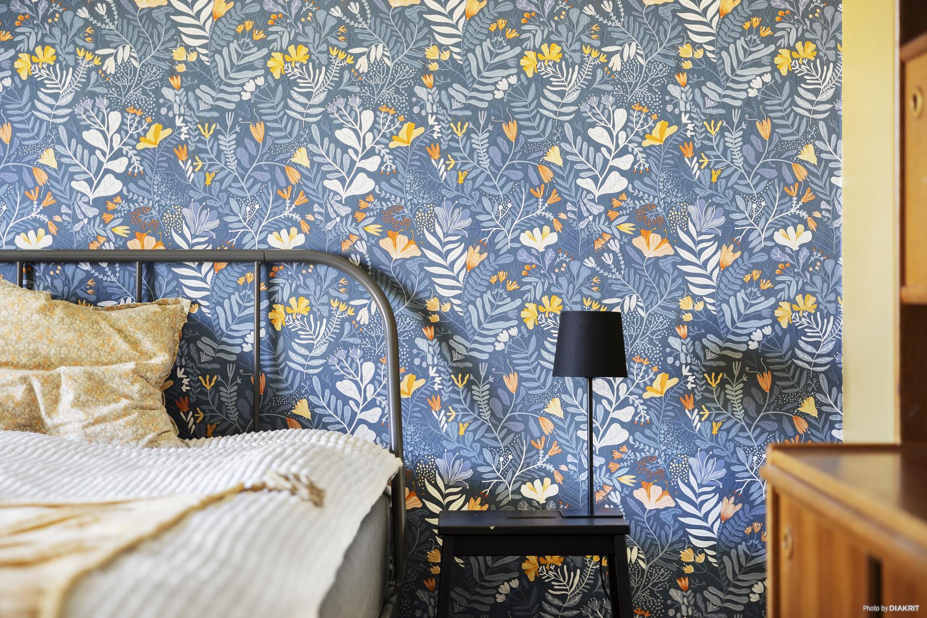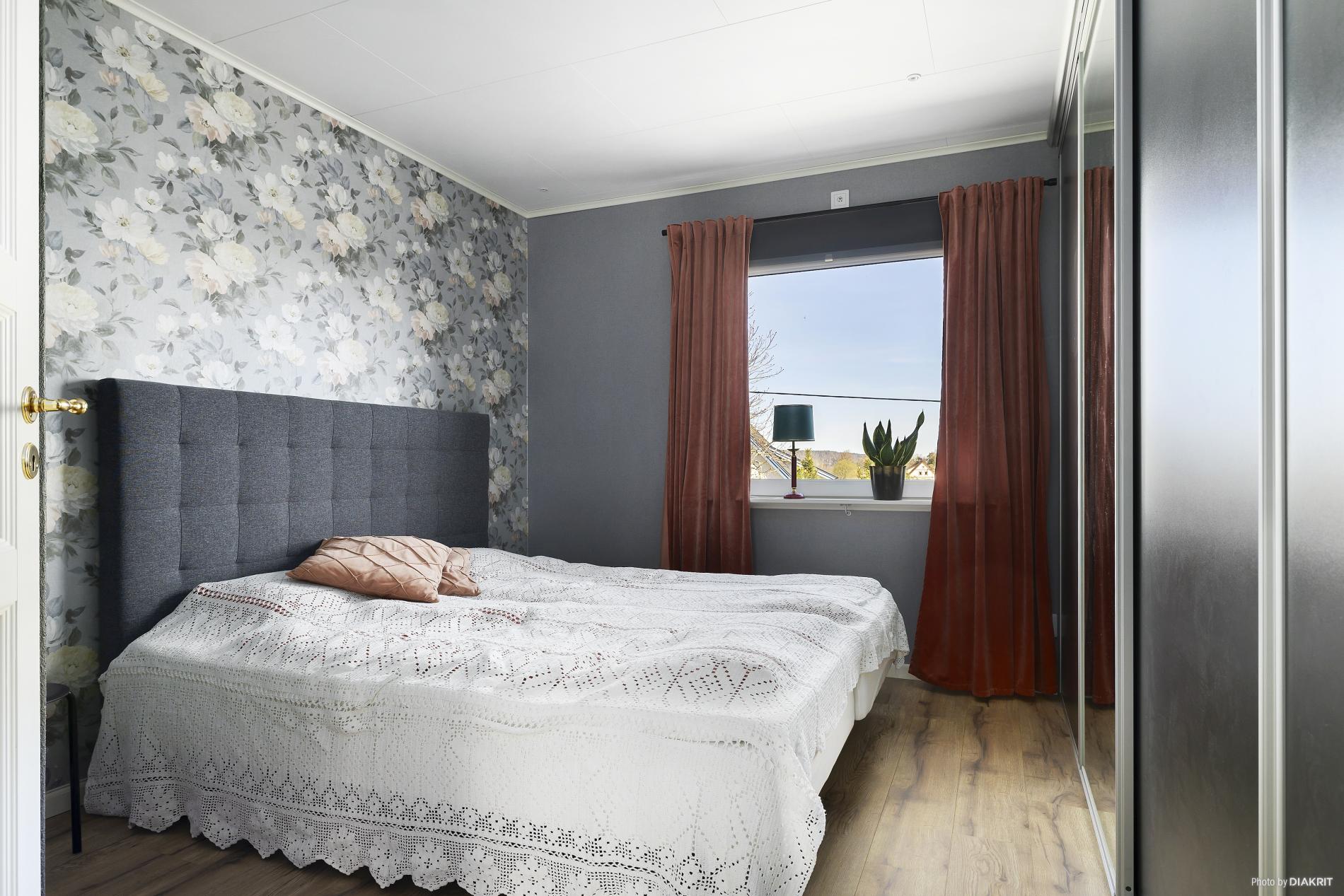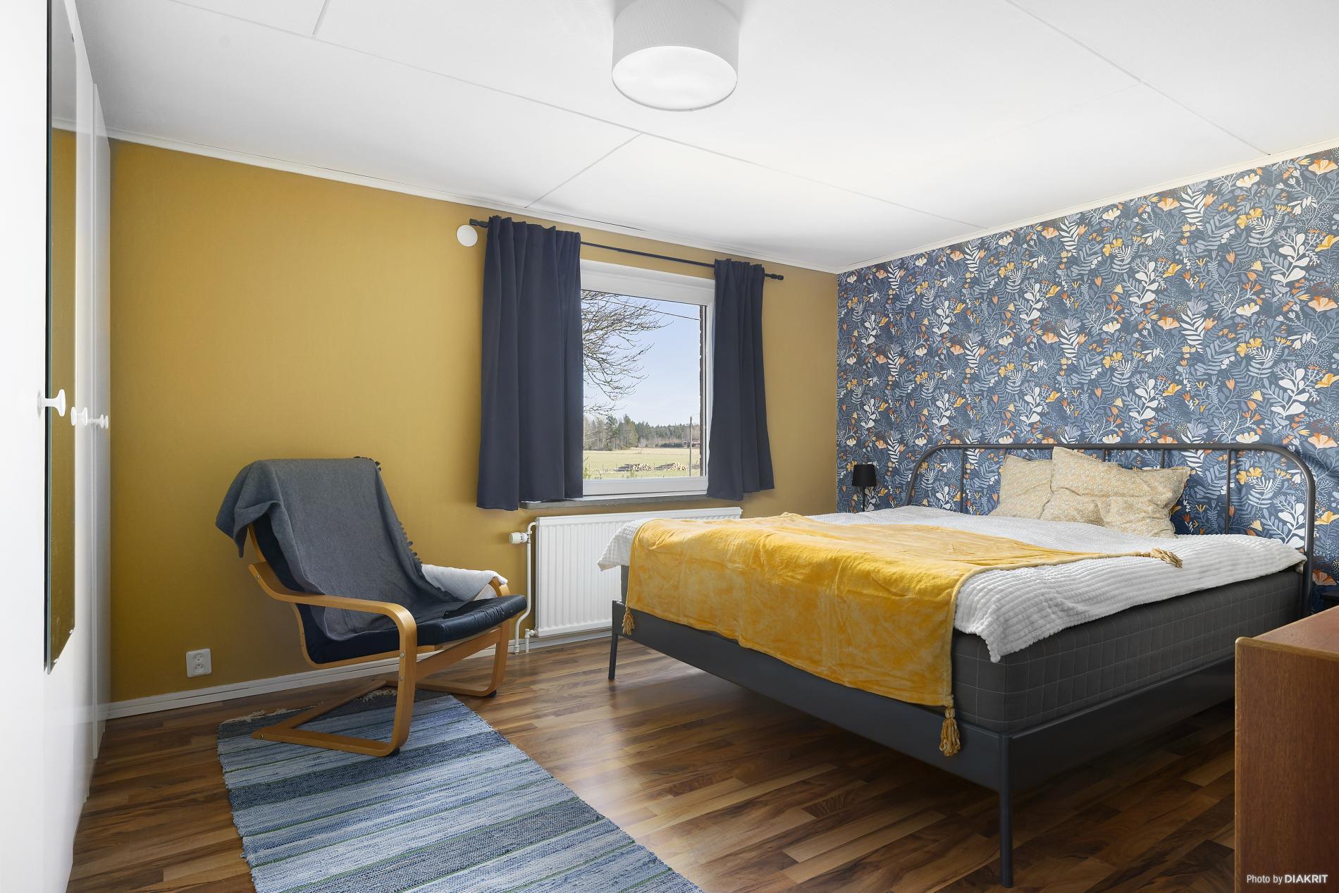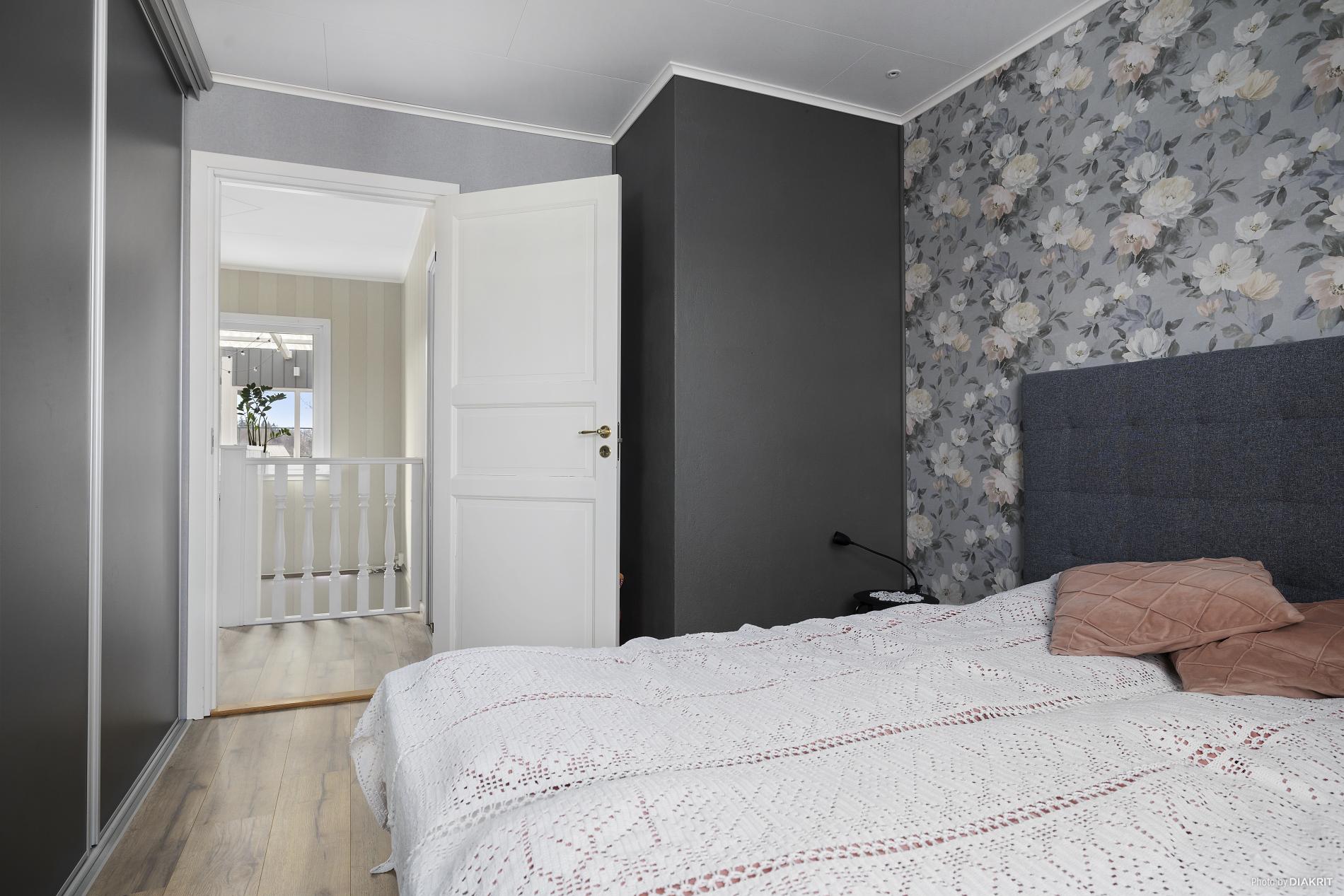 Större sovrum med laminatgolv och målade väggar med fondvägg i tapet.