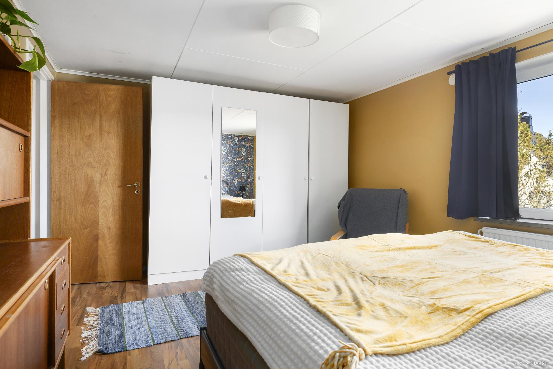 Sovrum med laminatgolv och tapetserade väggar. Här finns en garderobsvägg till förvaring.