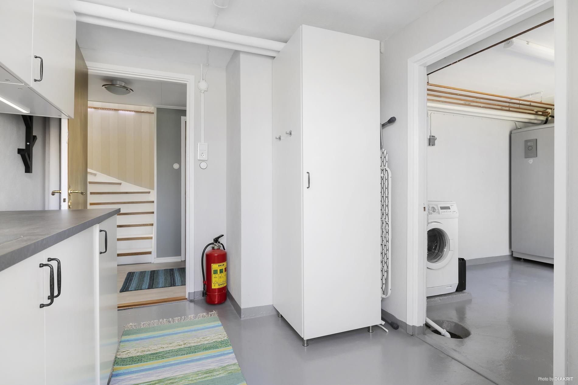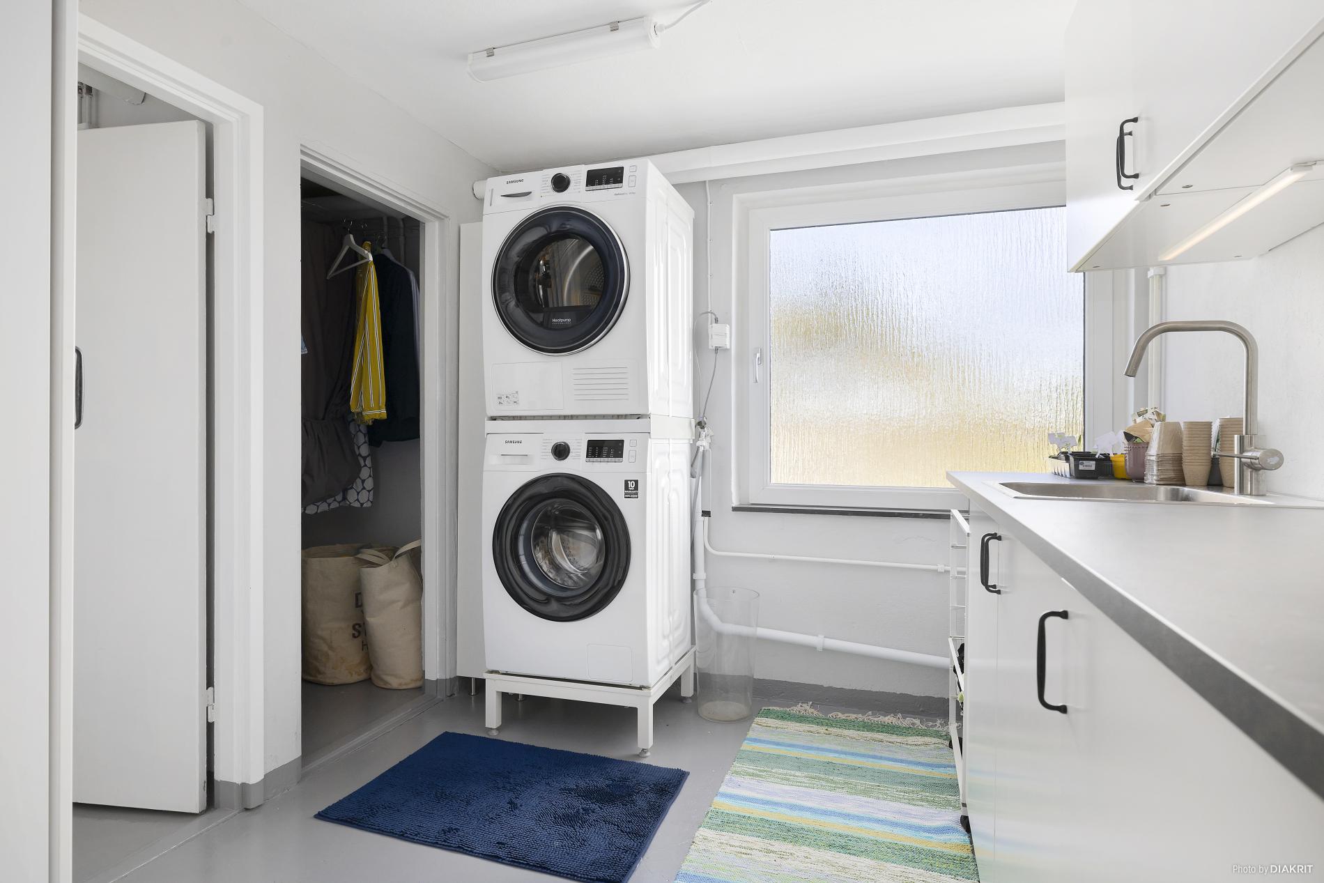 Tvättstuga med målade betongytskikt. Här är det utrustat med förvaringsskåp, tvättmaskin, torktumlare, arbetsbänk med skåp samt tvättho. Här finns även ett mindre förvaringsrum.