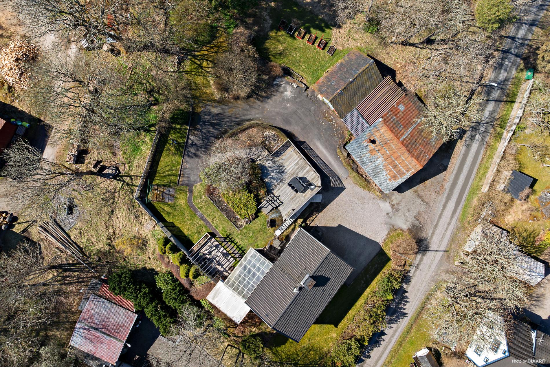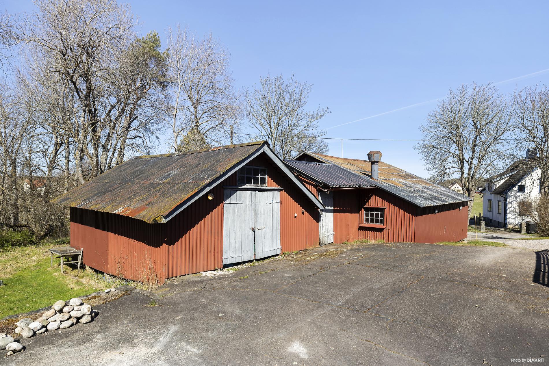 På tomten finns två garageplatser och flera sammanbyggda förrådsbyggnader och en praktisk jordkällare.