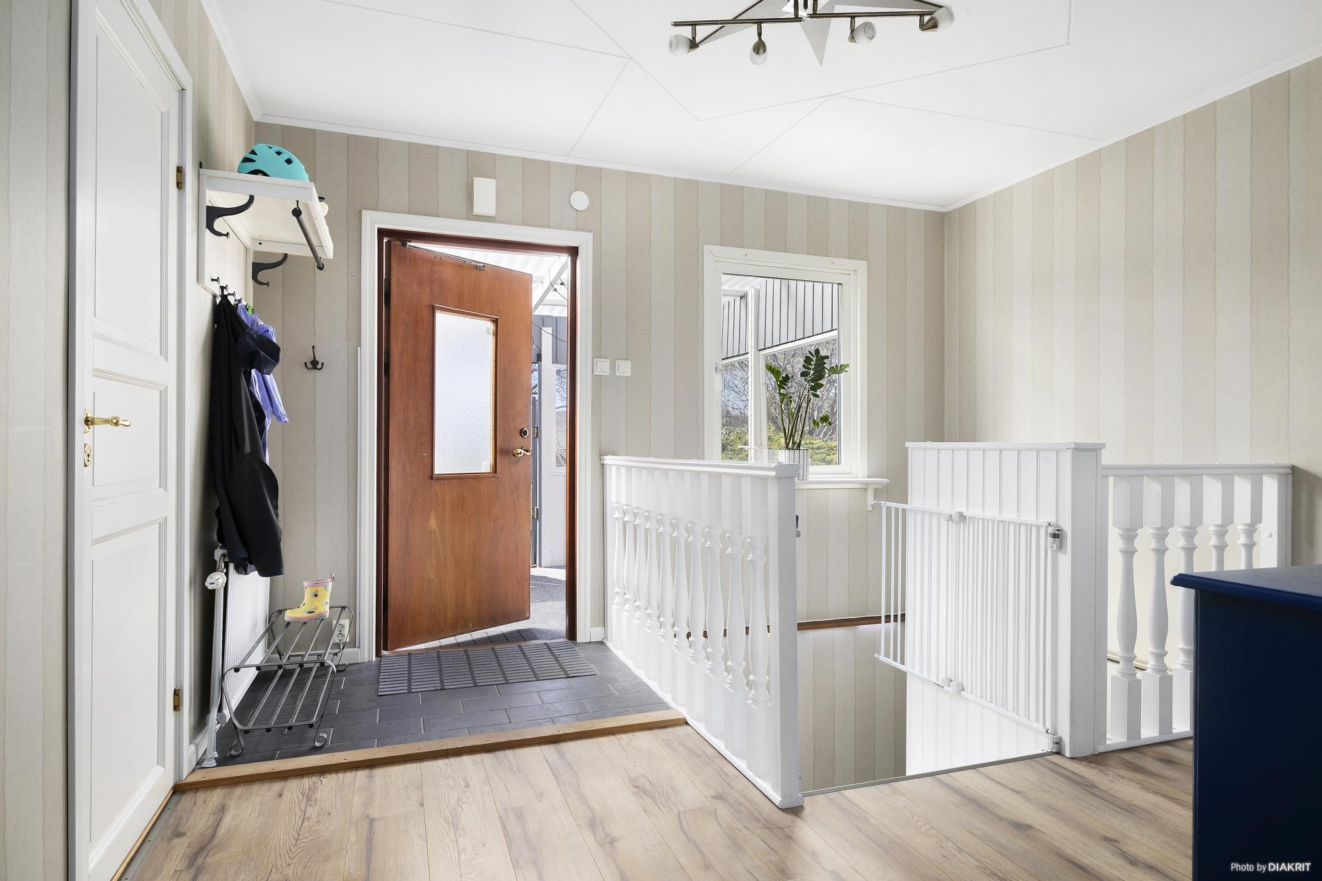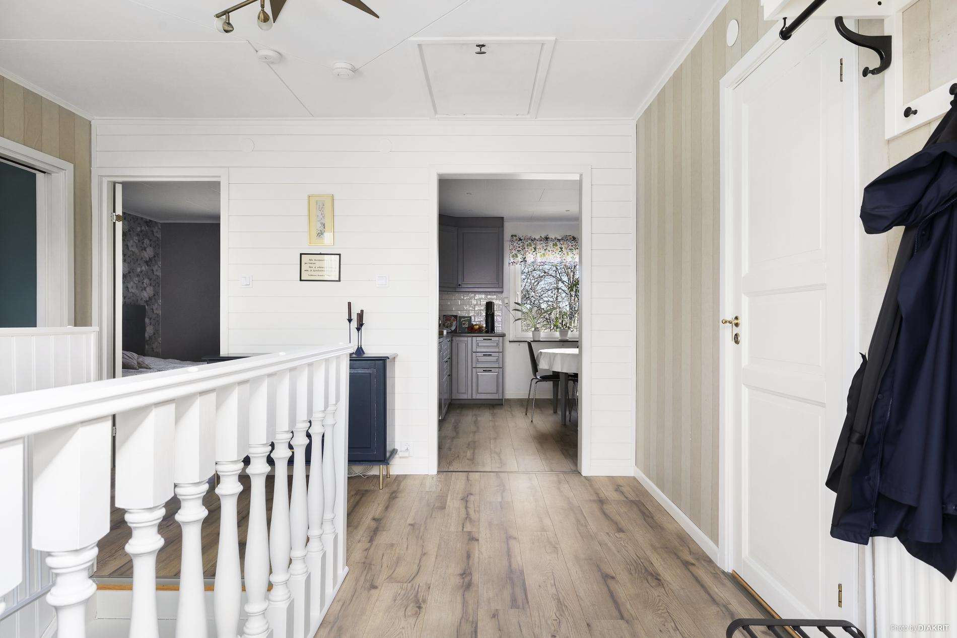 Övre hall och utgång till uterummet på husets baksida. Här är det laminatgolv och målade väggar. I hallen finns även lucka till vindsutrymmet.