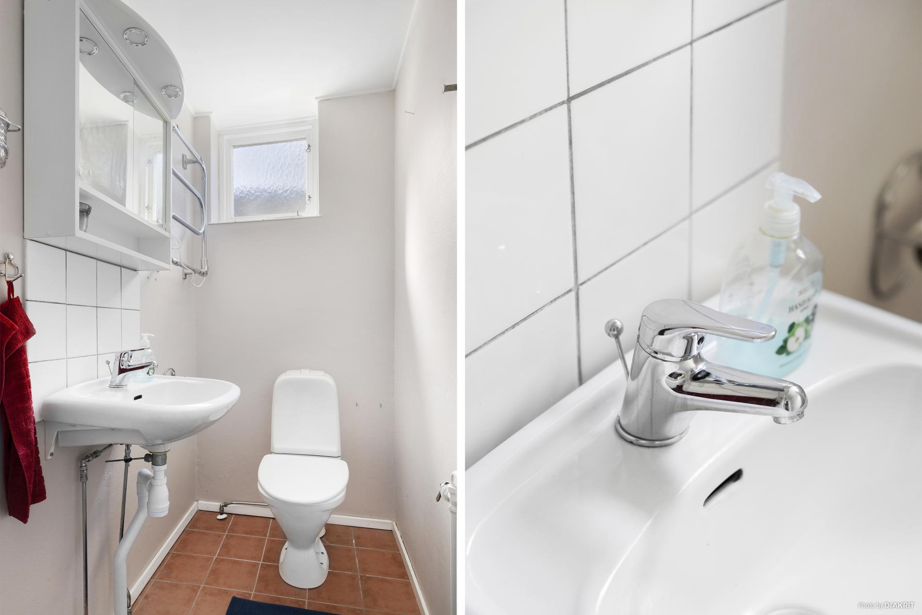 Gästtoalett med klinkergolv, målade väggar samt kakel ovan kommoden. Här är det utrustat med wc-stol och tvättställskommod.