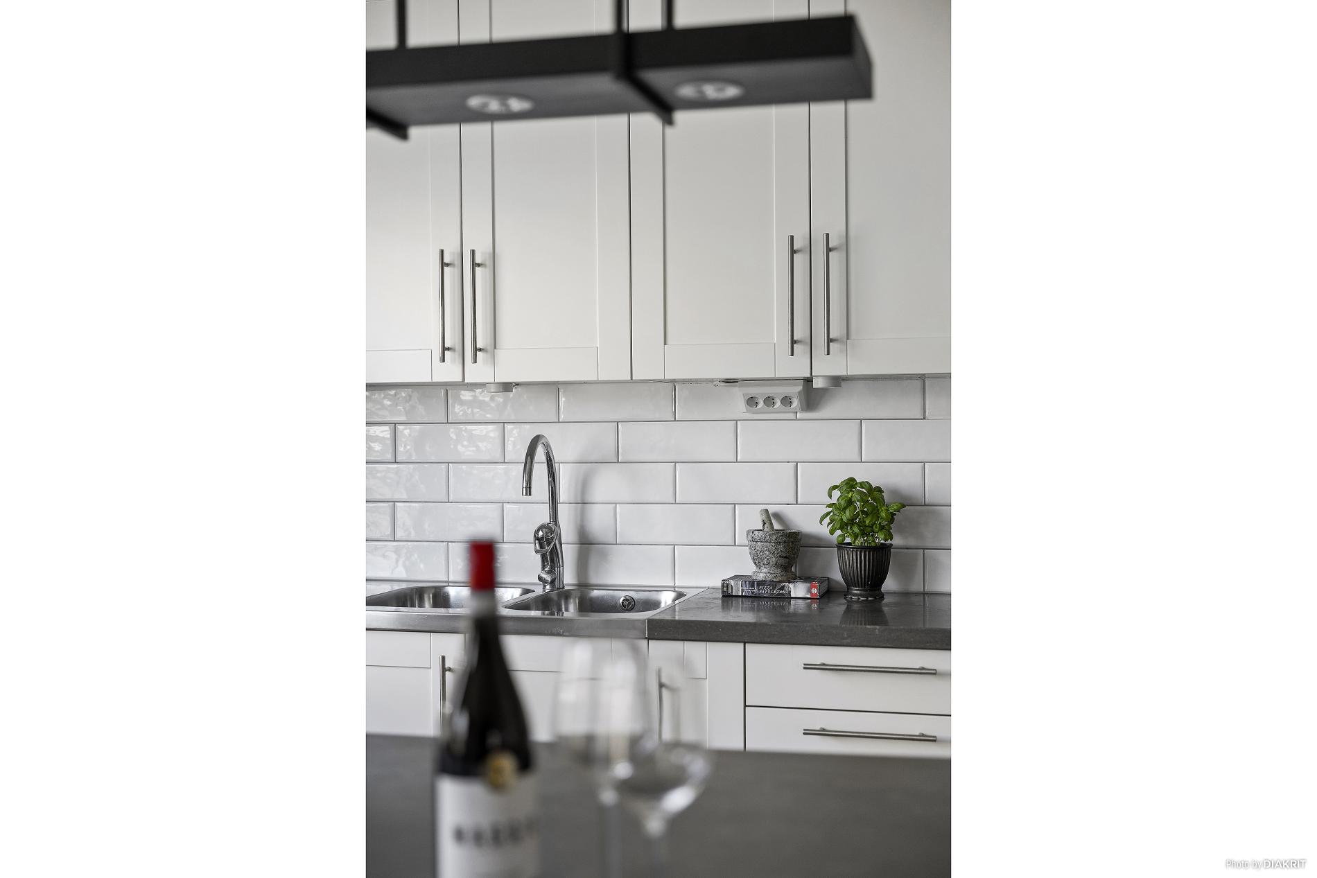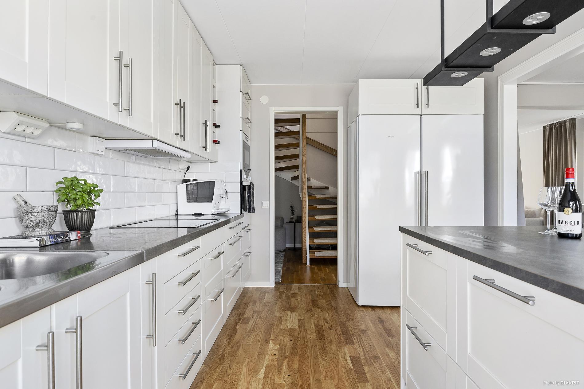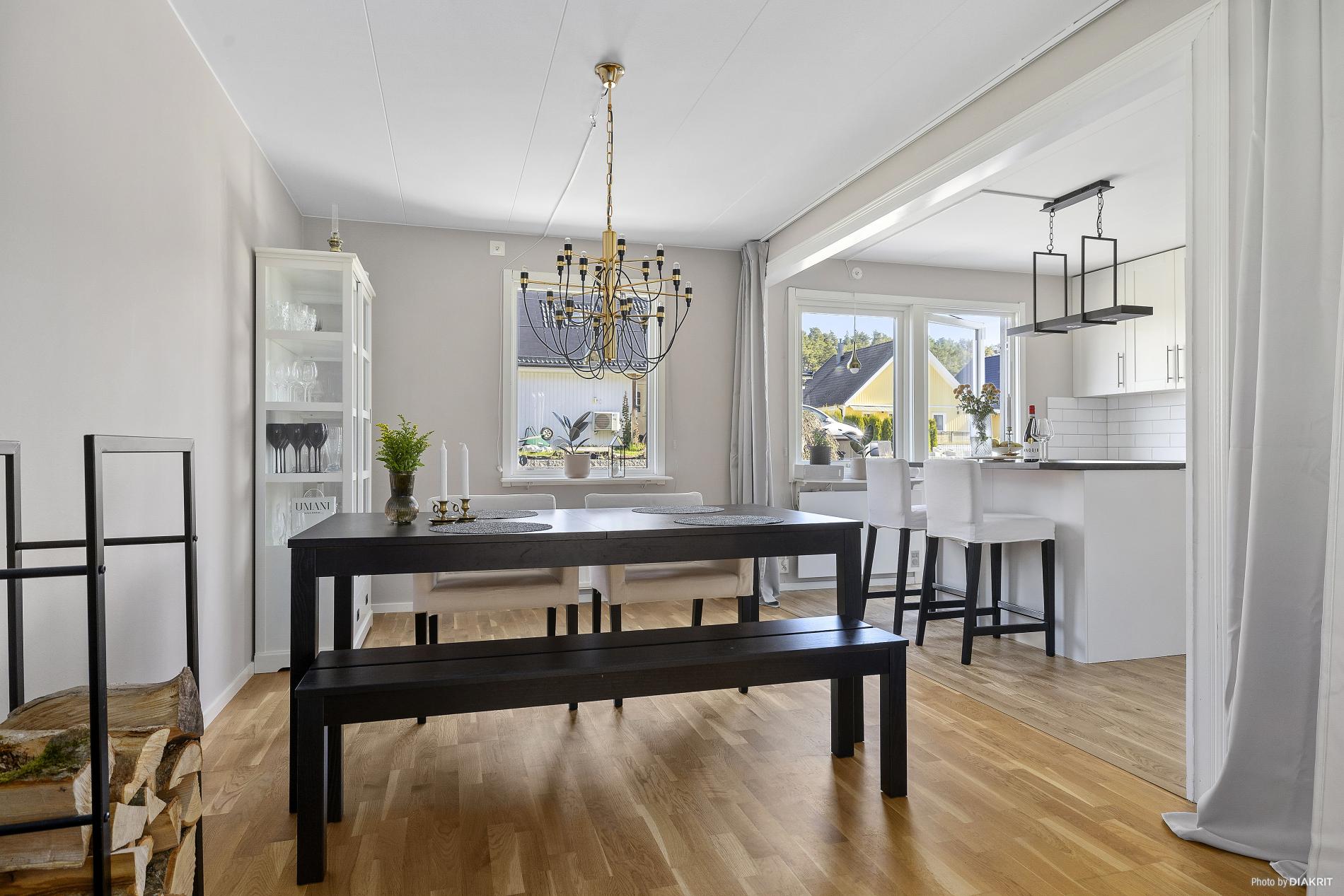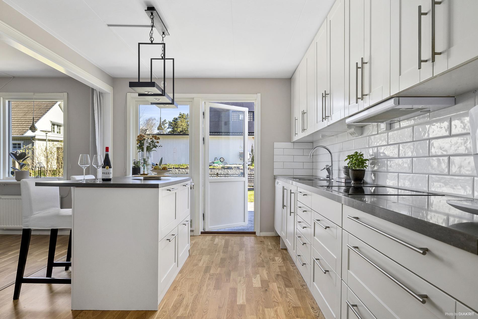 Härligt öppet Marbodalkök med köksö och matplats i anslutning till vardagsrummet. Inbyggnads mikro och ugn, häll, diskmaskin kyl och frys.