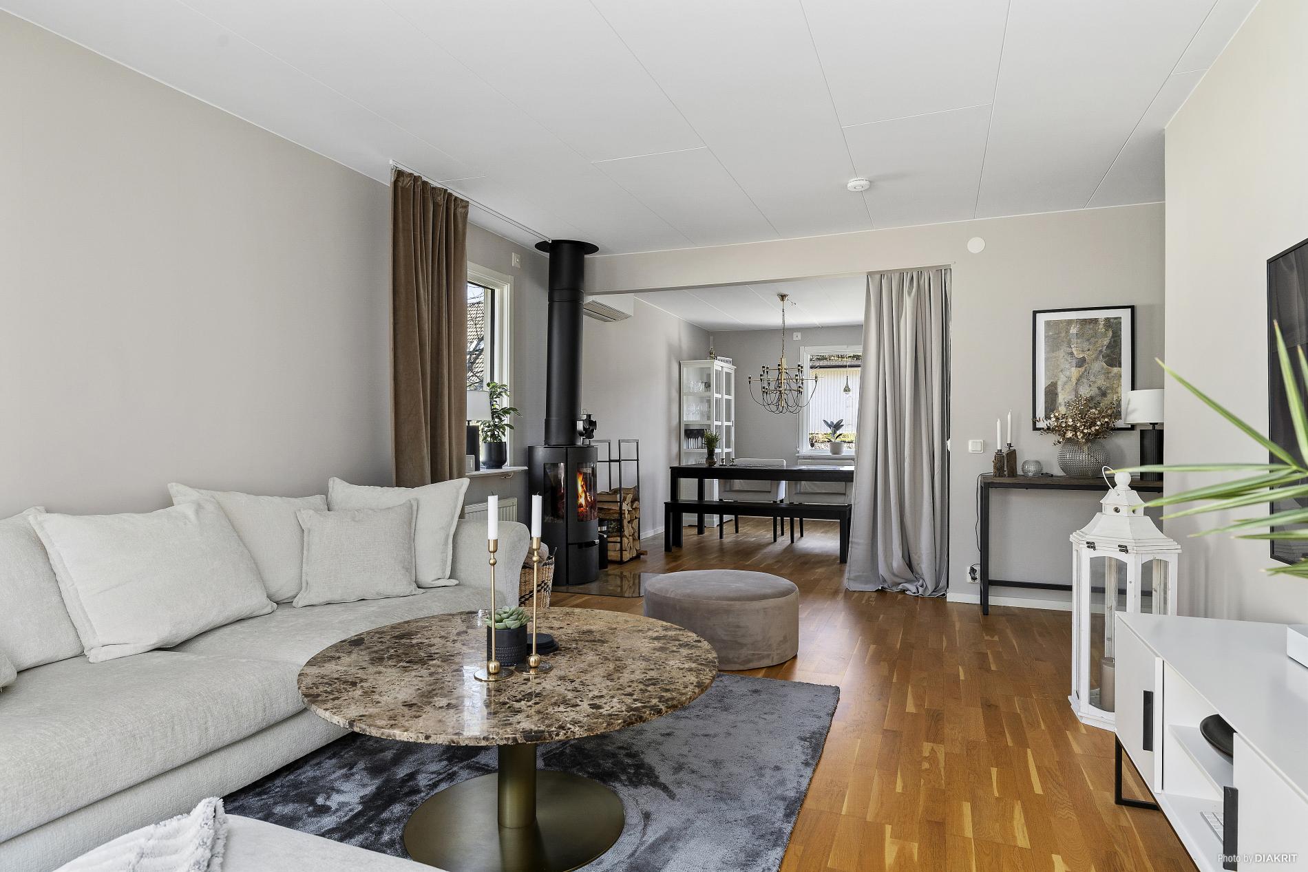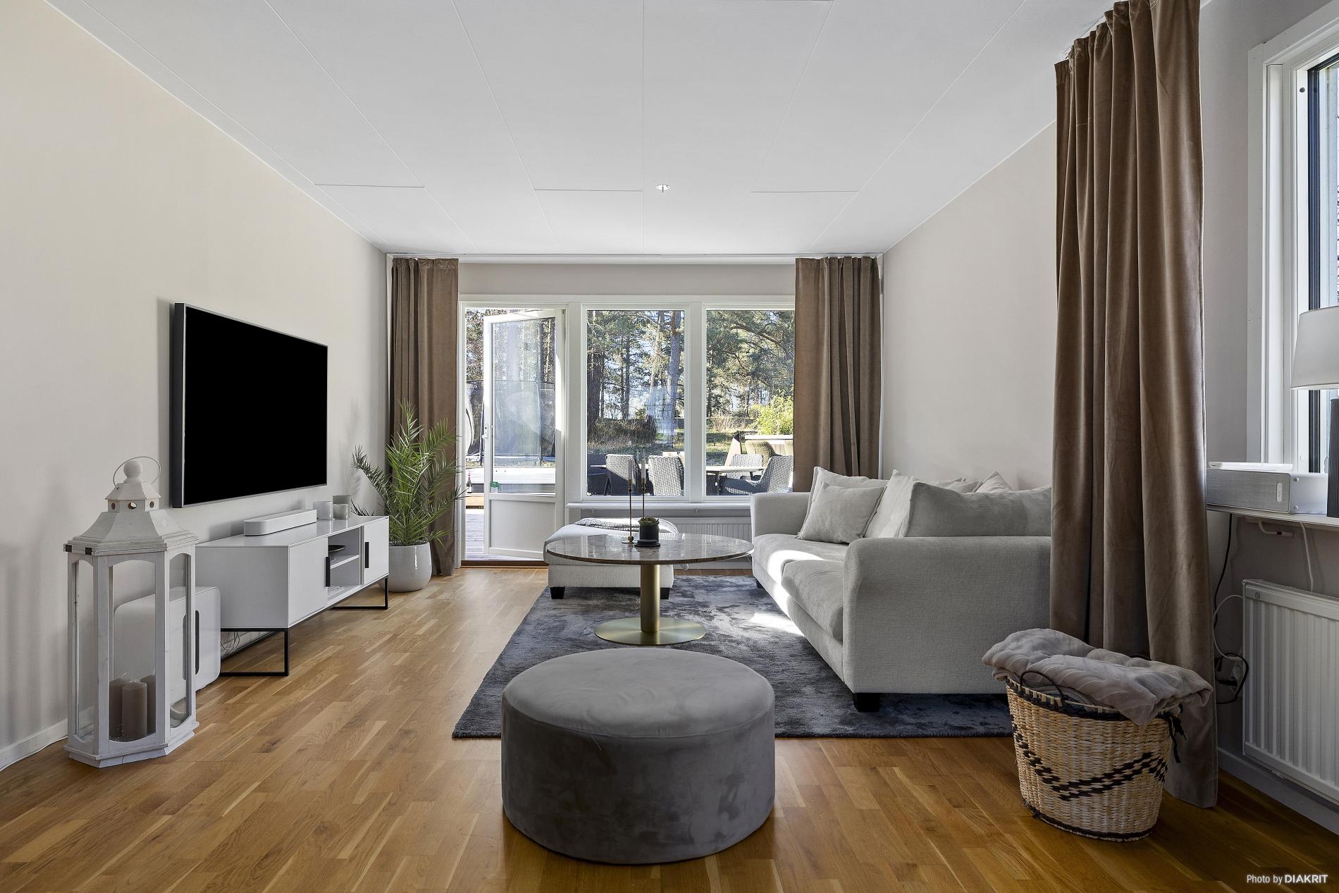Vardagsrum med kamin och plats för större soffgrupp samt utgång till stor altan med plats för matbord, loungegrupp, solsängar och med spabad och utedusch. Här finns också mycket plats för både grill och pizzaugn. Baksidan med sol hela dagen ligger mot mindre skogsparti med härliga möjligheter för lek.