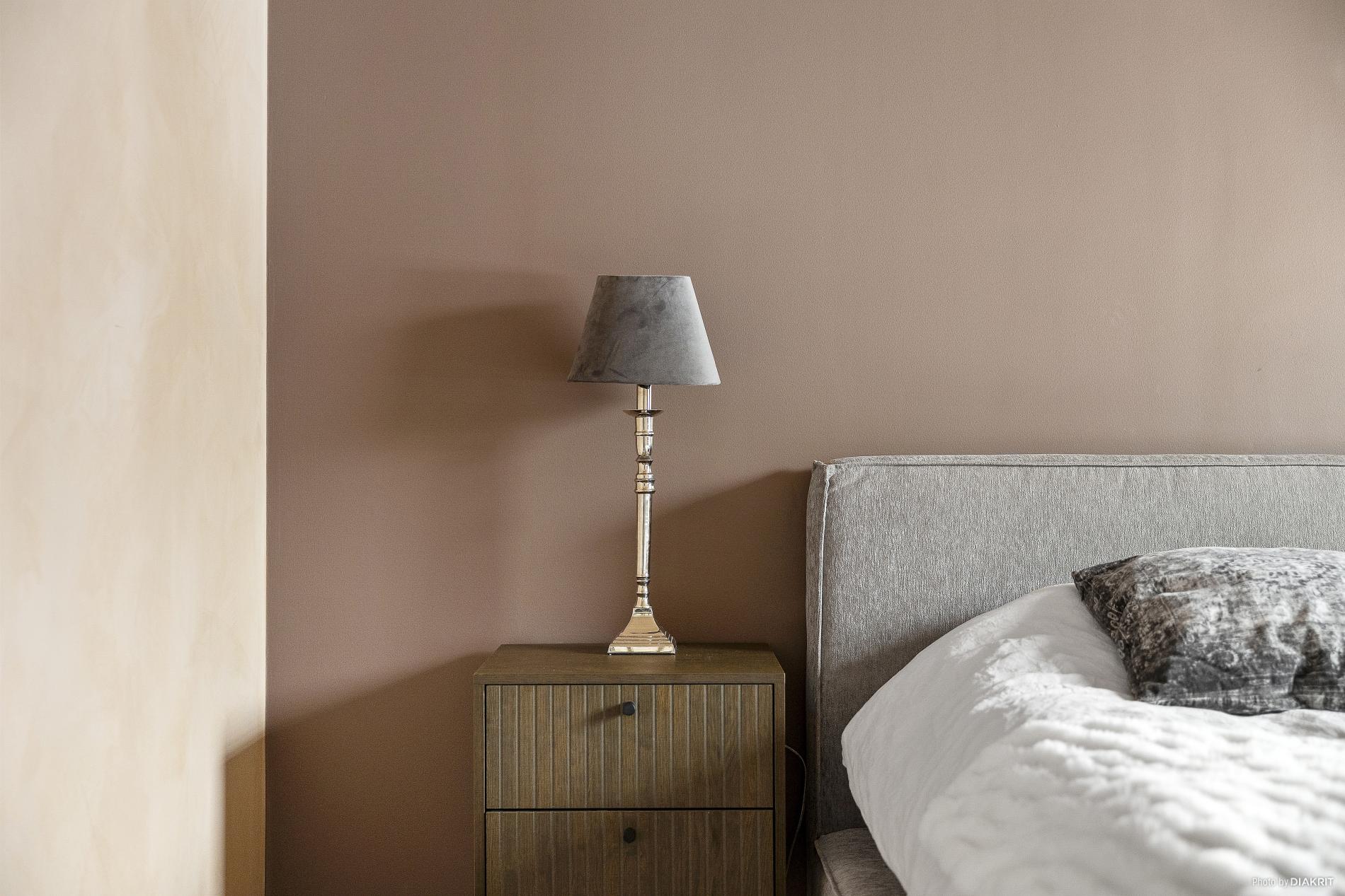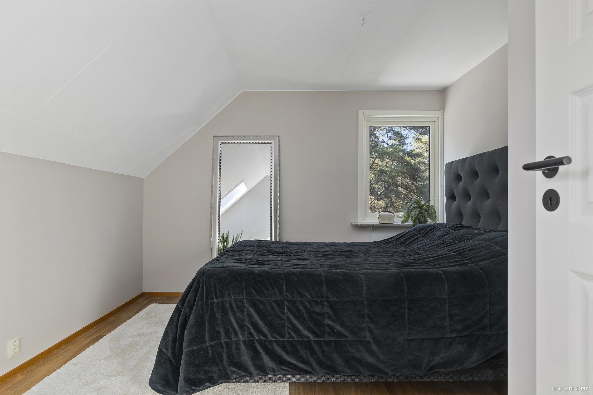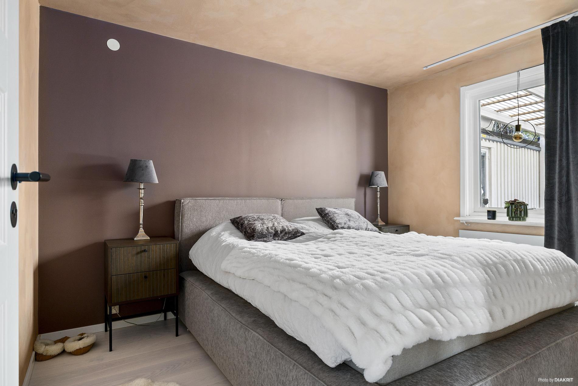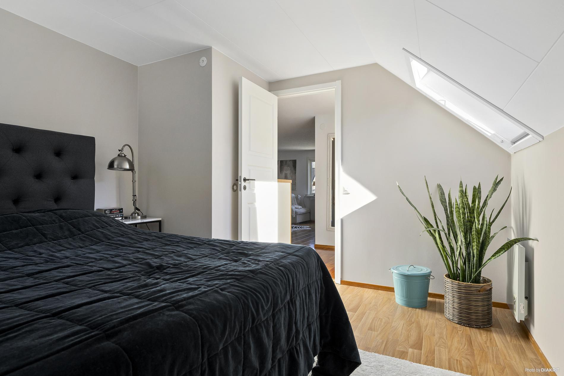 Husets master bedroom med skjutgarderob. Laminatgolv och målade väggar.