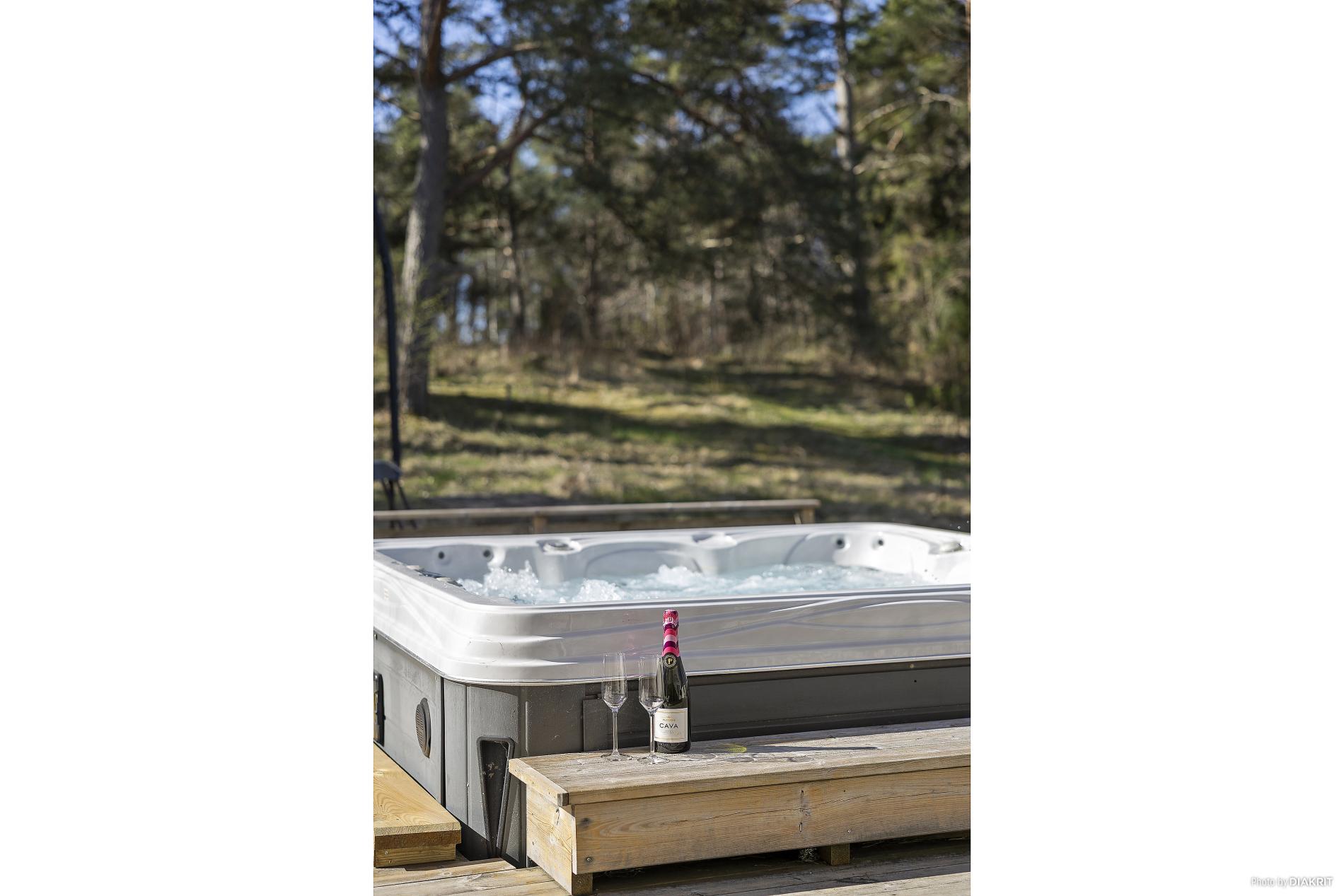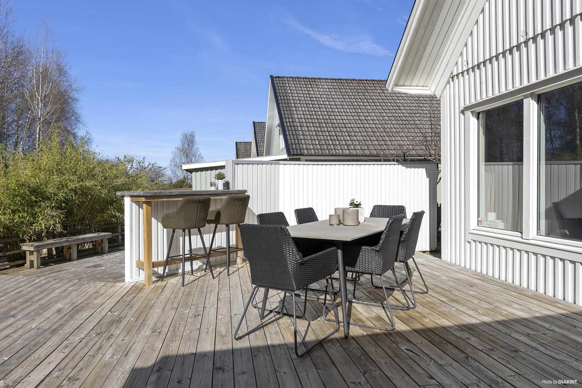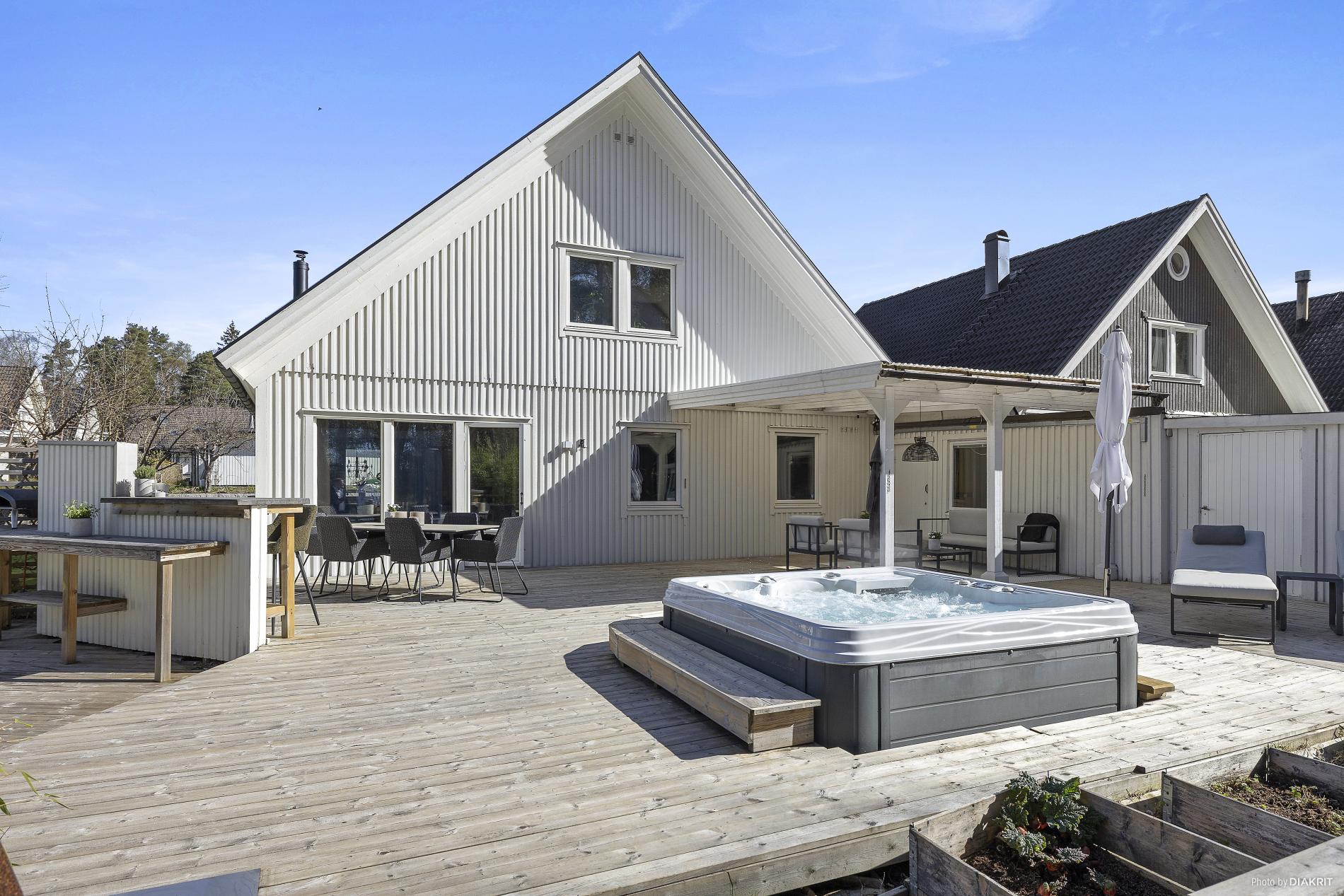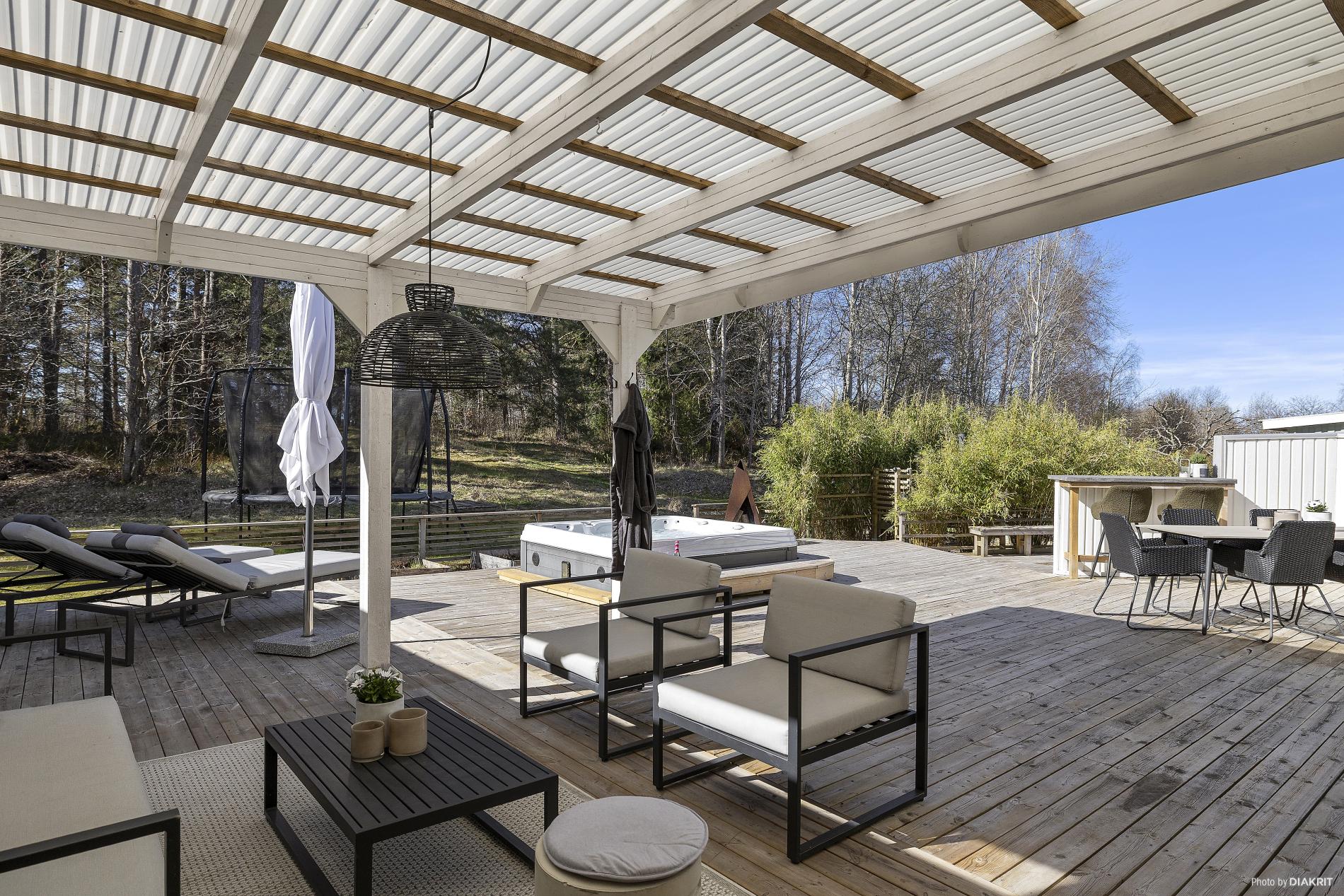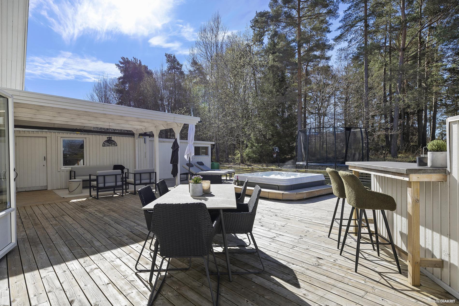 Hjärtat i detta hem är utan tvekan den fantastiska baksidan. Här suddas gränsen mellan inne och ute ut. Den generösa altanen rymmer med lätthet både en stor loungegrupp för sena sommarkvällar, ett rejält matbord för hela släkten och bekväma solsängar för lata dagar i solen. Efter en lång arbetsdag sjunker du ner i det varma spabadet, och för den rätta semesterkänslan finns även en utedusch som svalkar skönt under högsommaren.