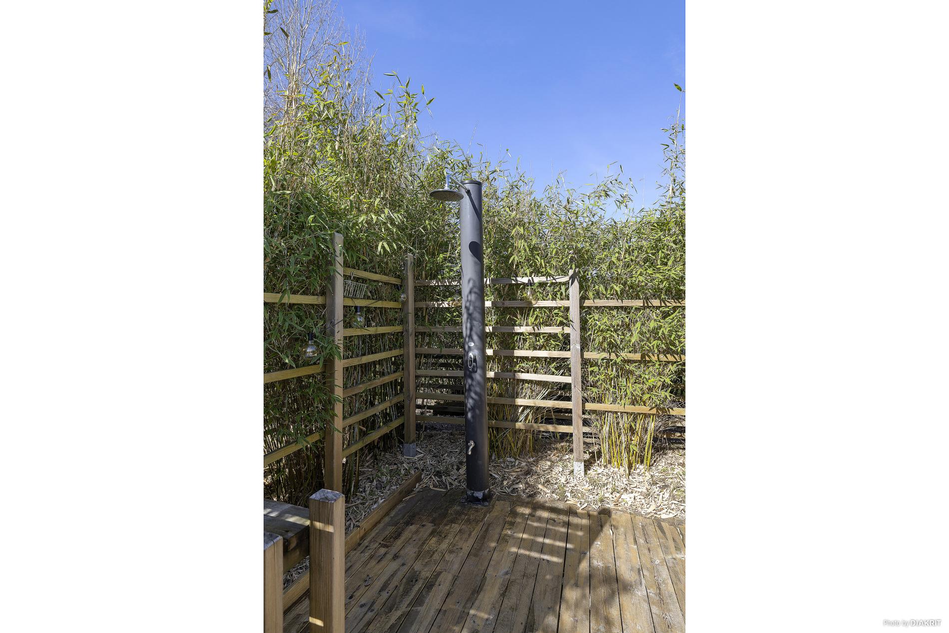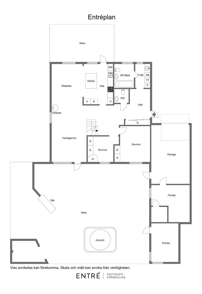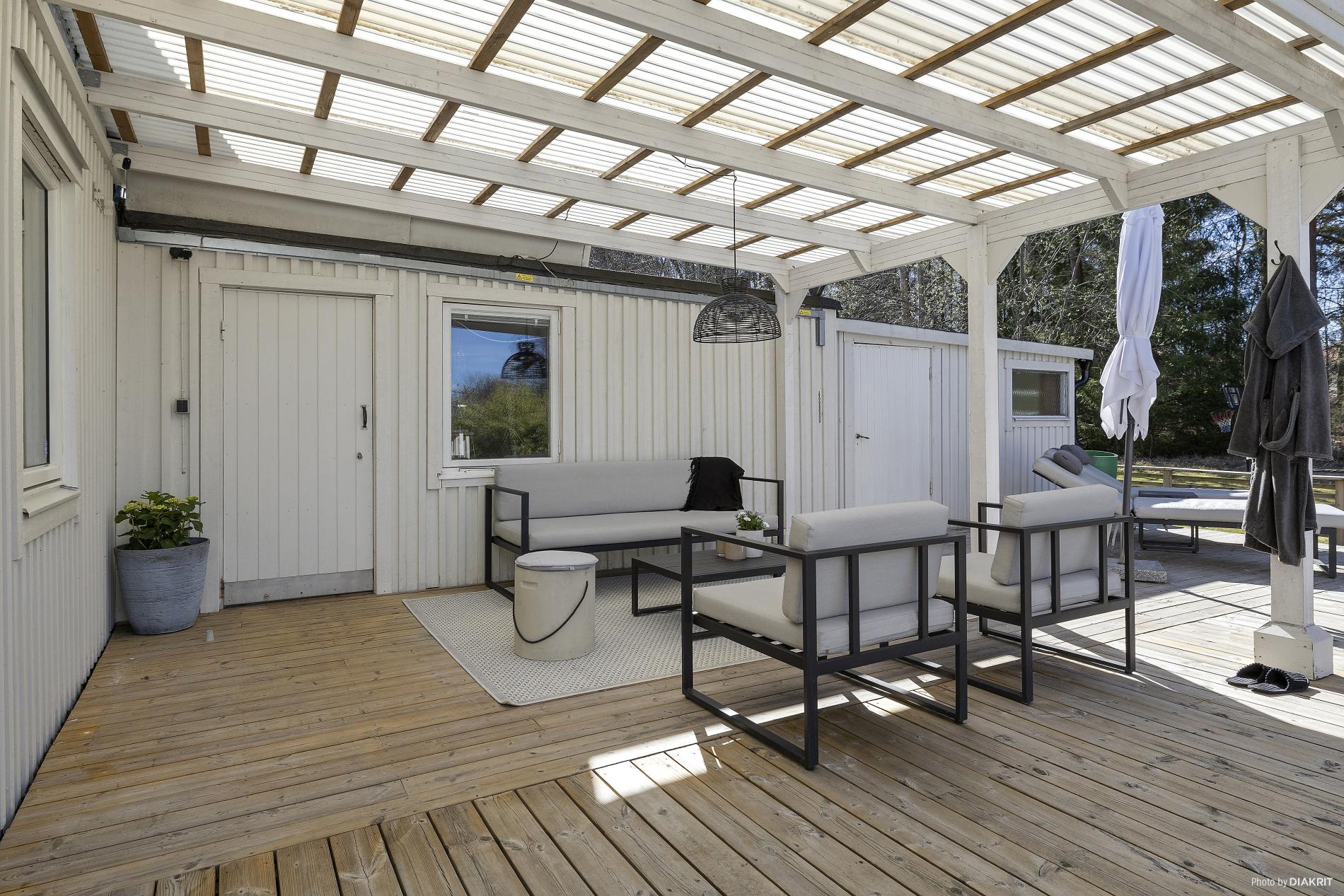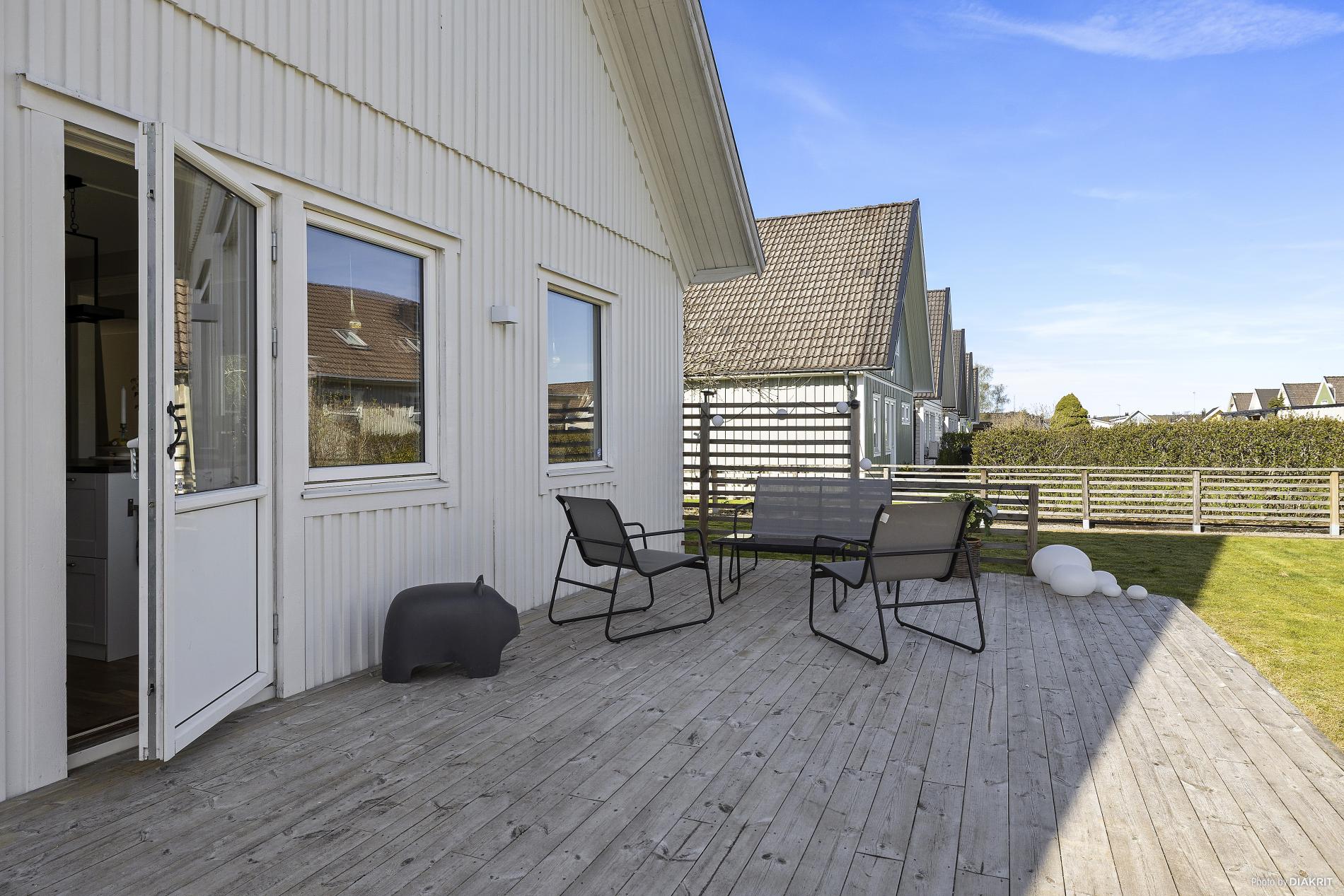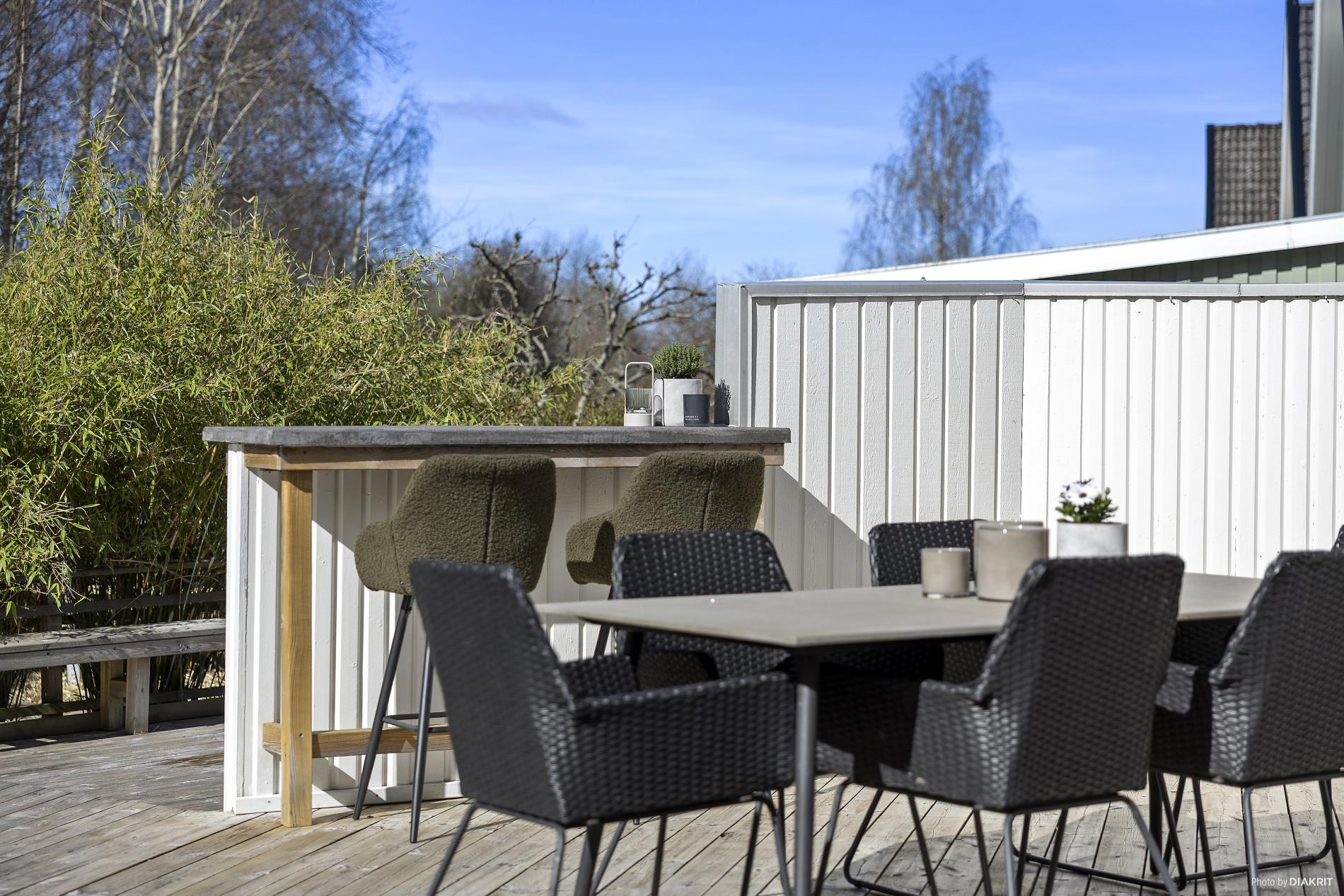 Hjärtat i detta hem är utan tvekan den fantastiska baksidan. Här suddas gränsen mellan inne och ute ut. Den generösa altanen rymmer med lätthet både en stor loungegrupp för sena sommarkvällar, ett rejält matbord för hela släkten och bekväma solsängar för lata dagar i solen. Efter en lång arbetsdag sjunker du ner i det varma spabadet, och för den rätta semesterkänslan finns även en utedusch som svalkar skönt under högsommaren.