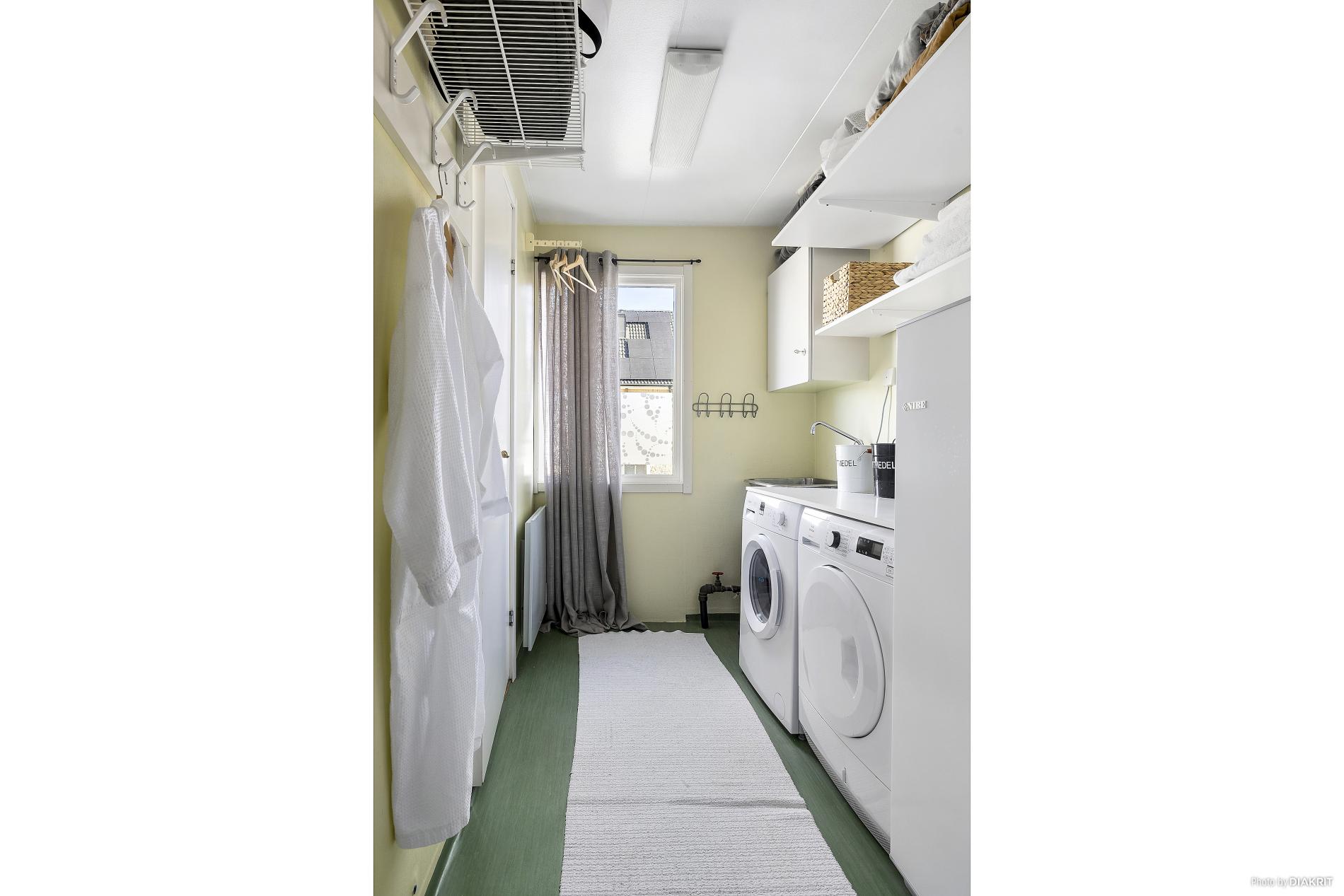 Tvättstuga med tvättmaskin, torktumlare och bra arbetsytor.