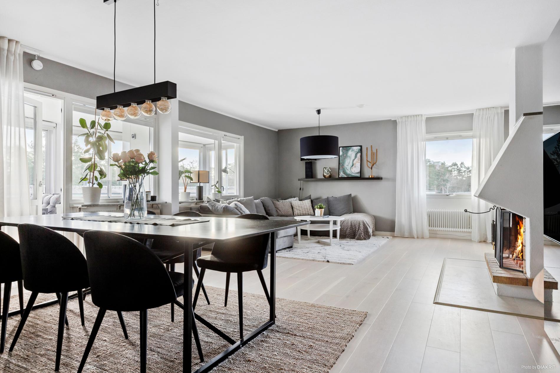 Detta är ett hem med det lilla extra – vad sägs om en stämningshöjande öppen spis för kyliga kvällar och två inglasade balkonger som förlänger säsongen från tidig vår till sen höst? Bostaden präglas av smakfulla ytskikt och ett stilrent kök från 2013, här kan du bara flytta in och bo.
