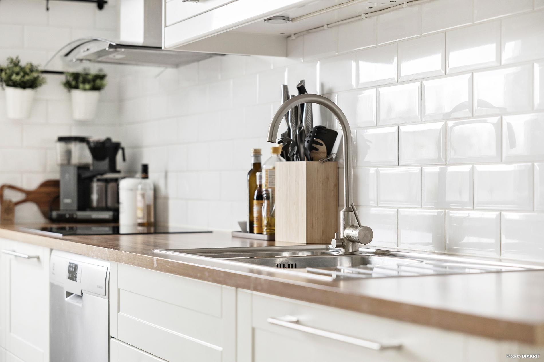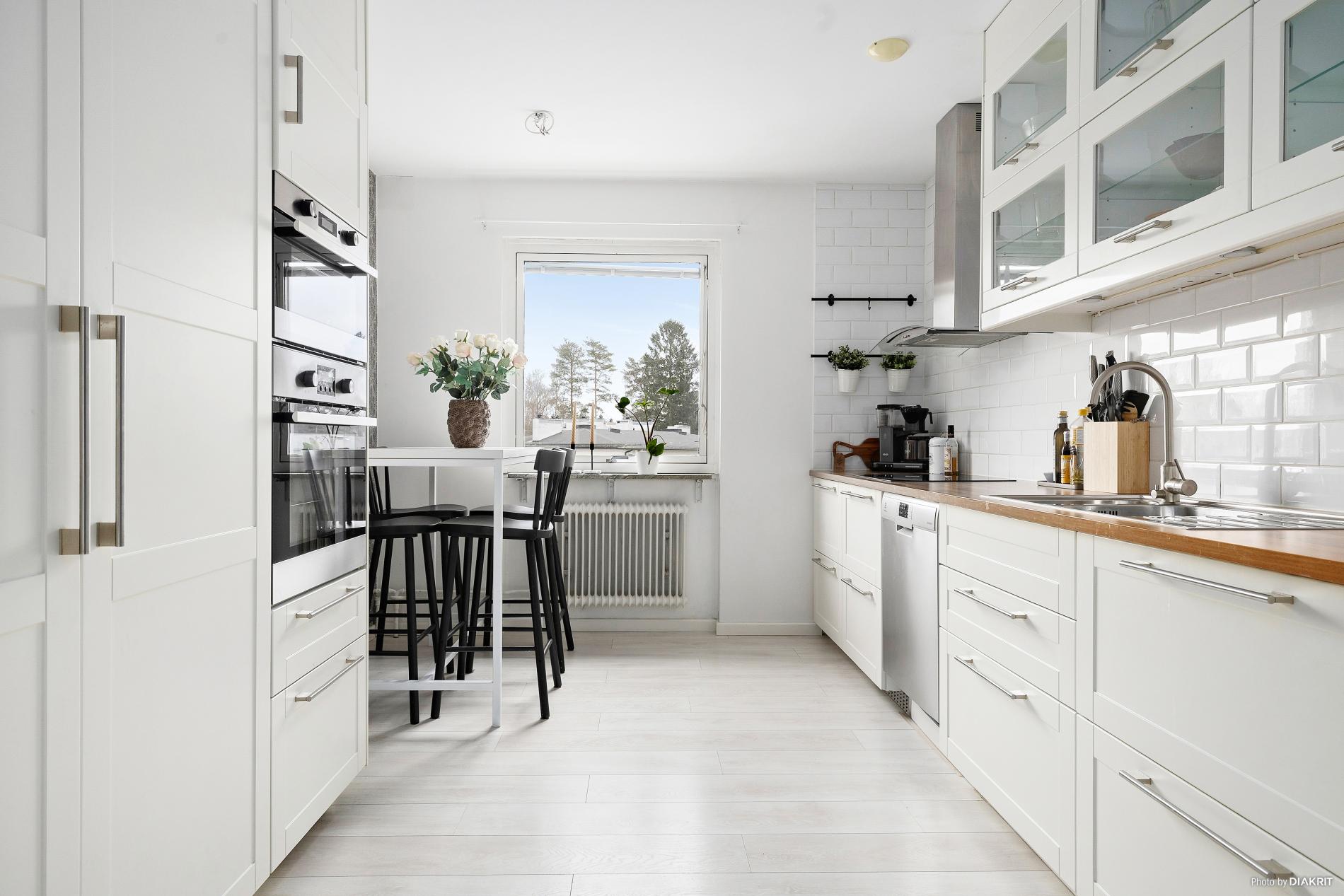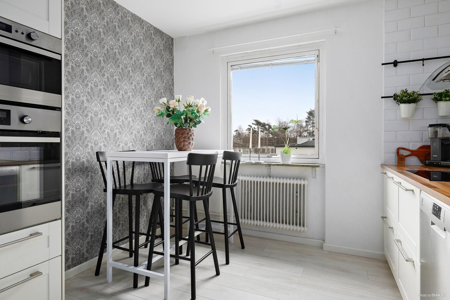 Ljust och trevligt kök i vitt med laminatgolv och tapetserade väggar. Köket är utrustat med spishäll, fläkt samt inbyggd ugn, mikro, kyl, frys och diskmaskin