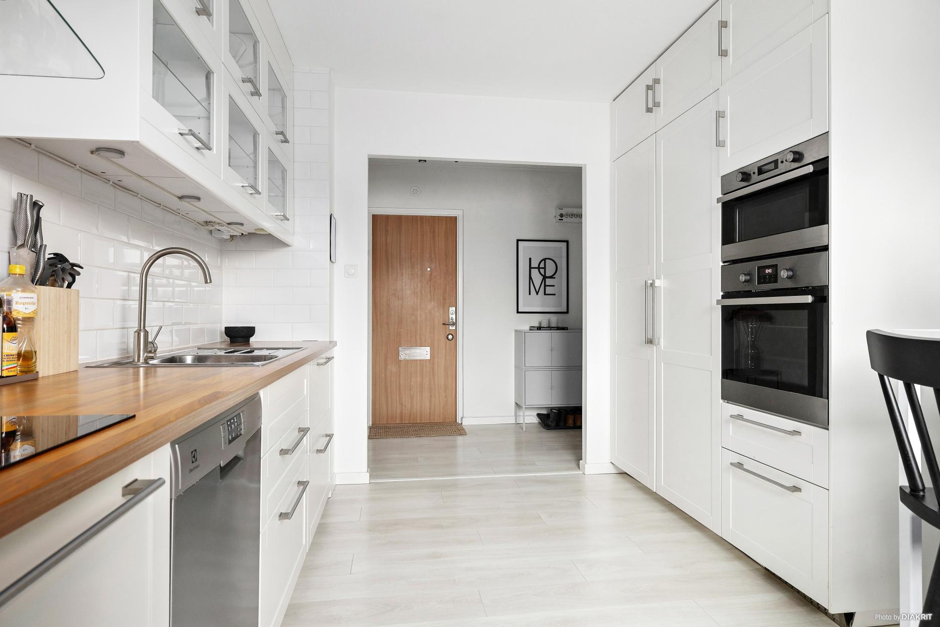 Välkommen in i hall med laminatgolv och vitmålade väggar. Här är det trevlig öppen planlösning till köket. I den inre hallen finns sex garderober till förvaring.