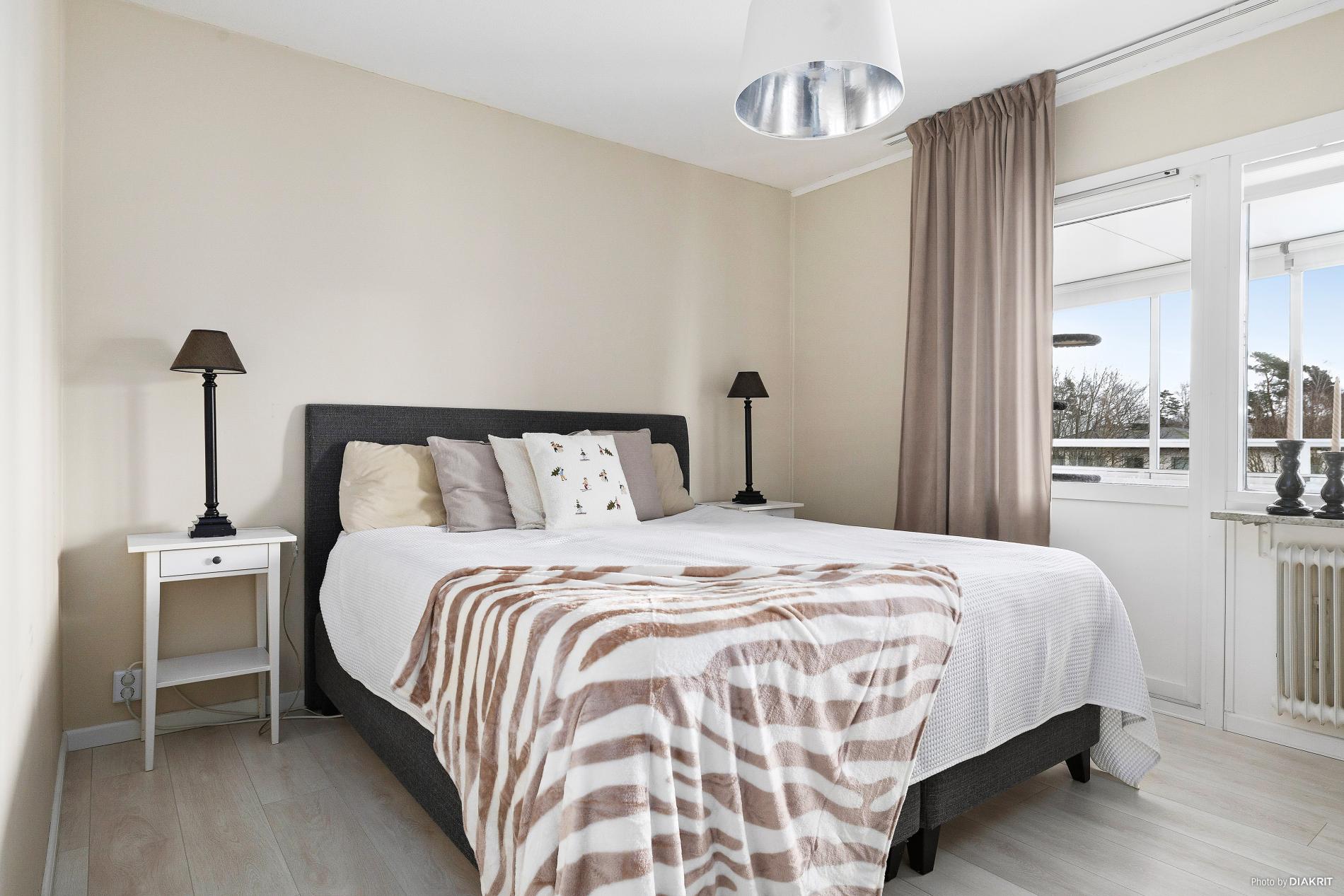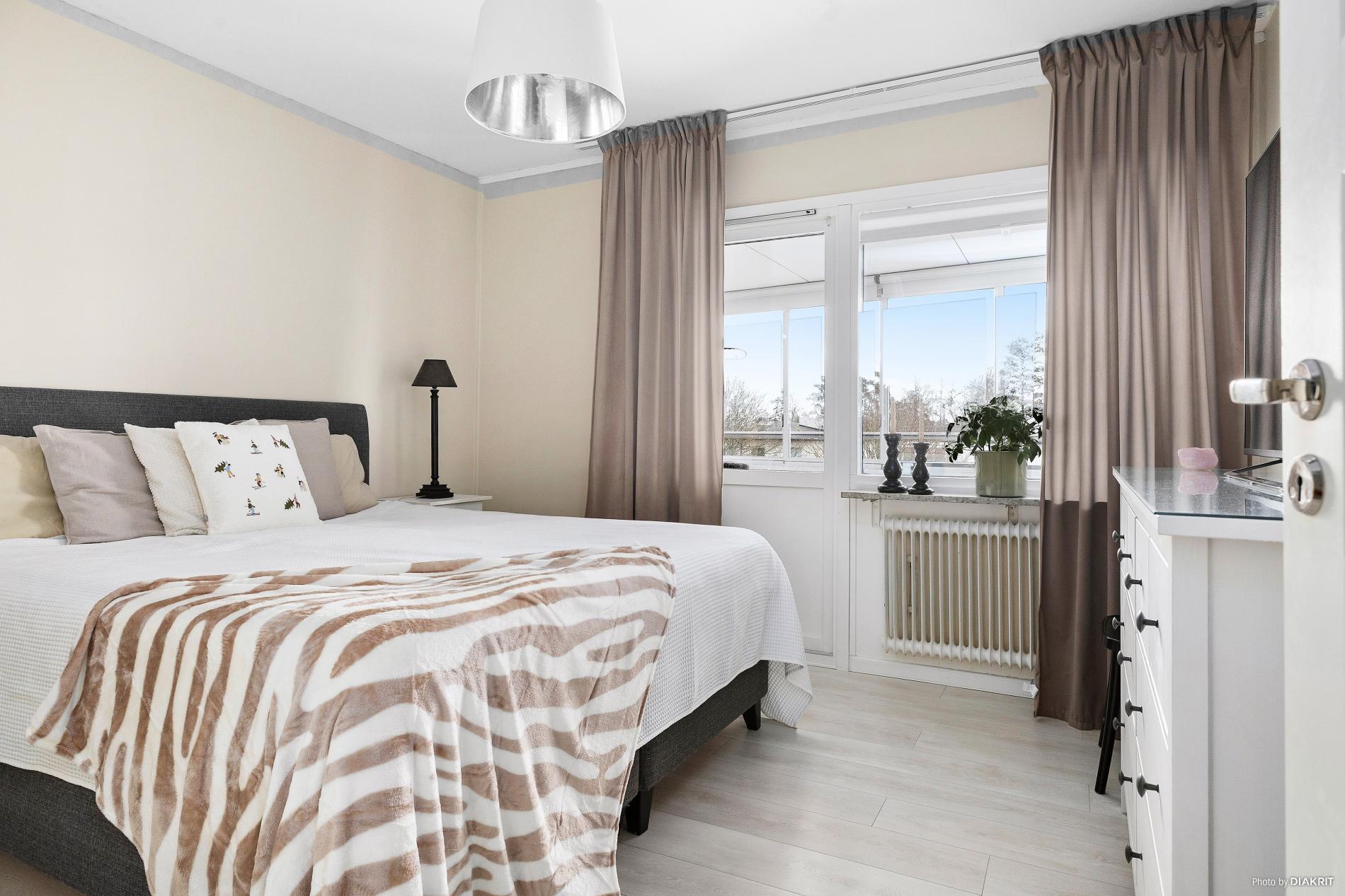 Sovrum med laminatgolv och tapetserade väggar. Här finns det utgång till den mindre inglasade balkongen.