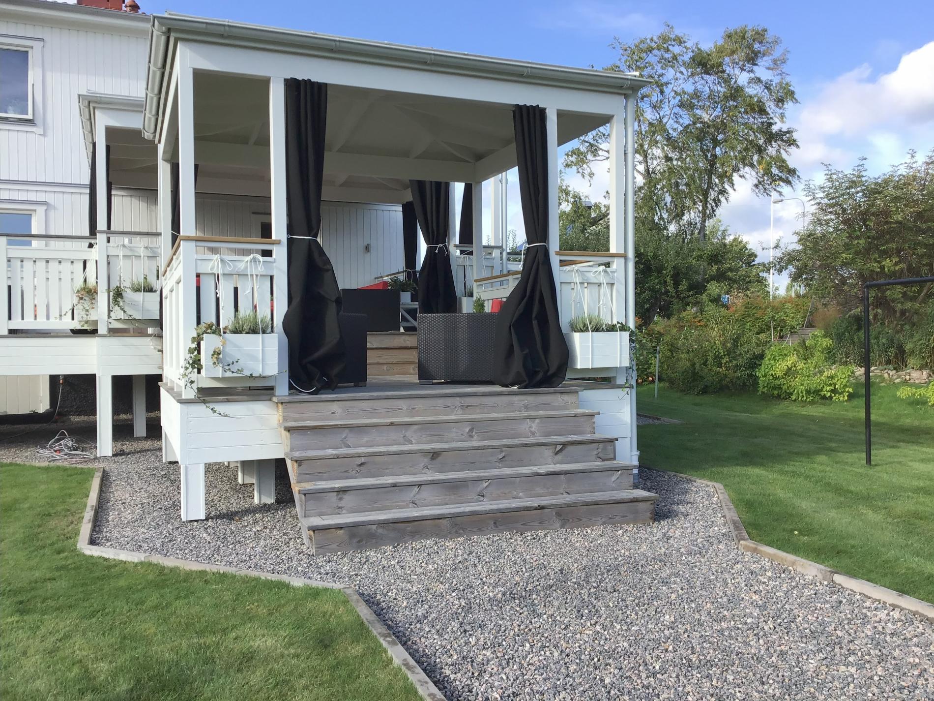 Rejäl träaltan med utgång från köket. Träaltanen är ca 60 kvm och byggd i två etage med överbyggda tak i lösvirke.