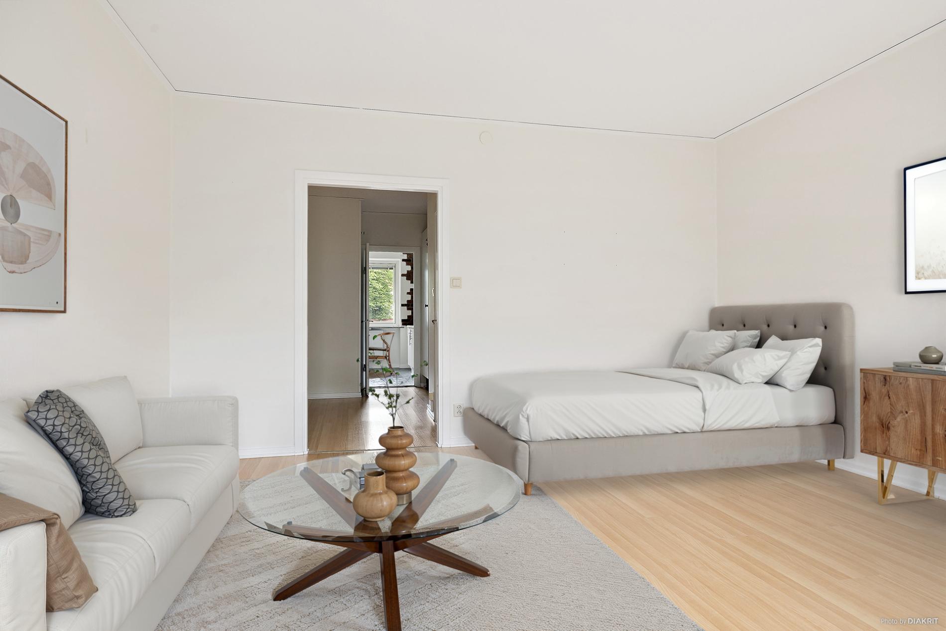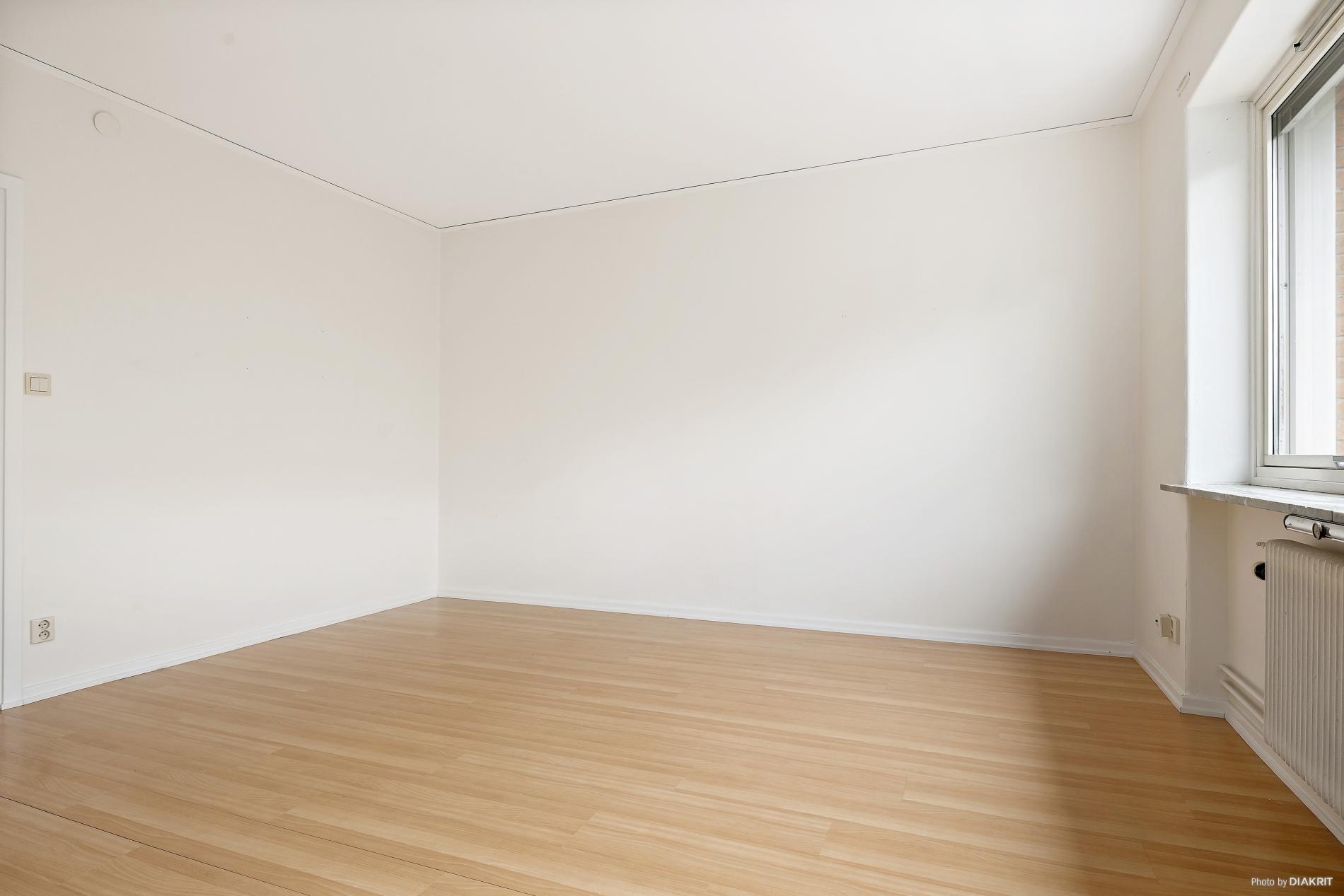 Ljust och trevligt rum med plats för såväl säng som soffa och skrivbord. Här är det laminatgolv och målade väggar.