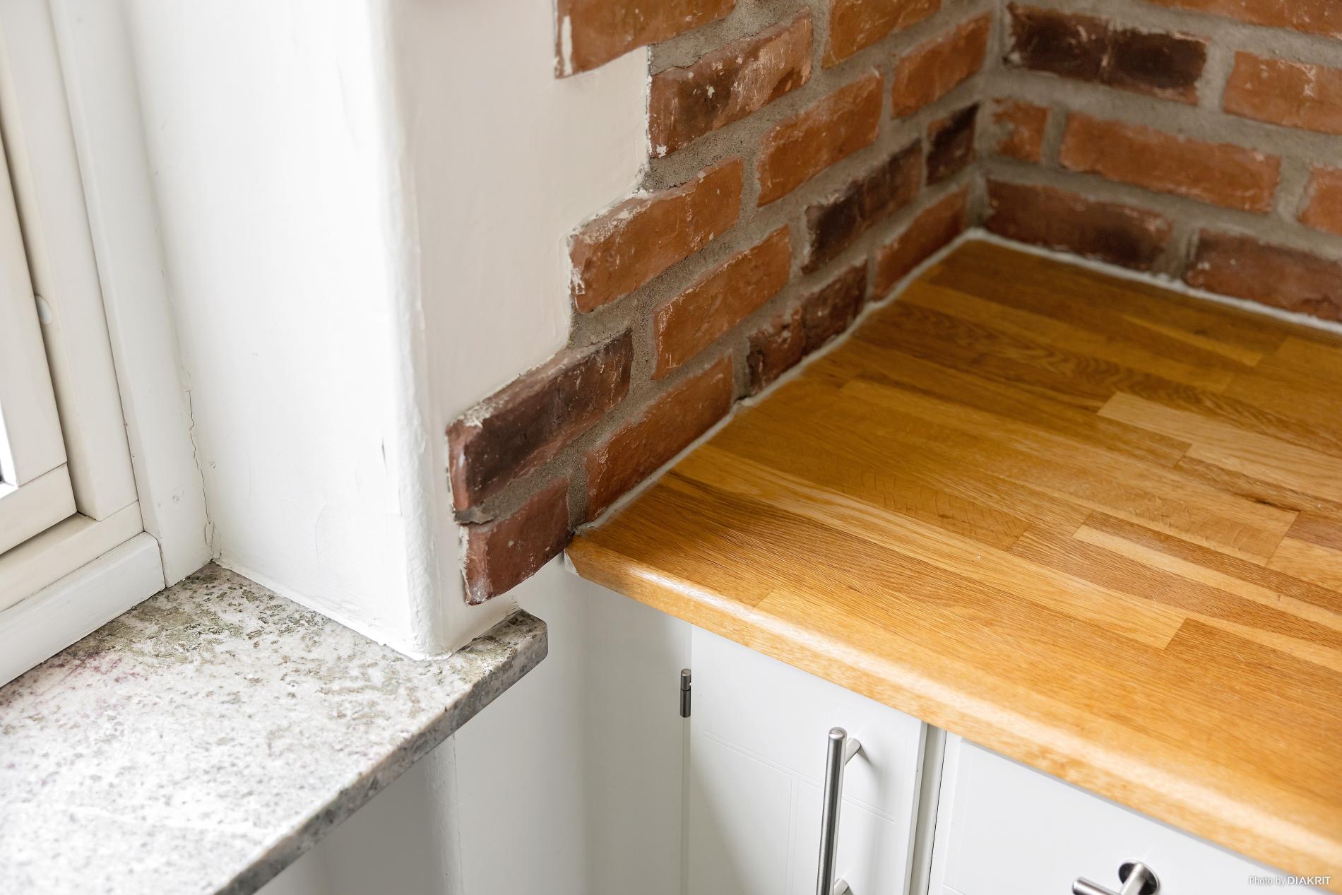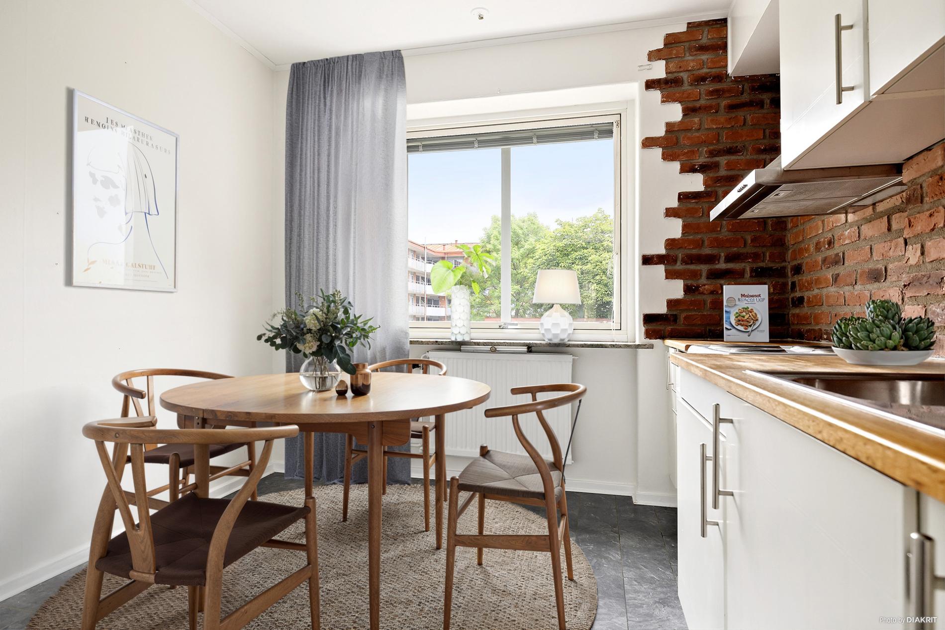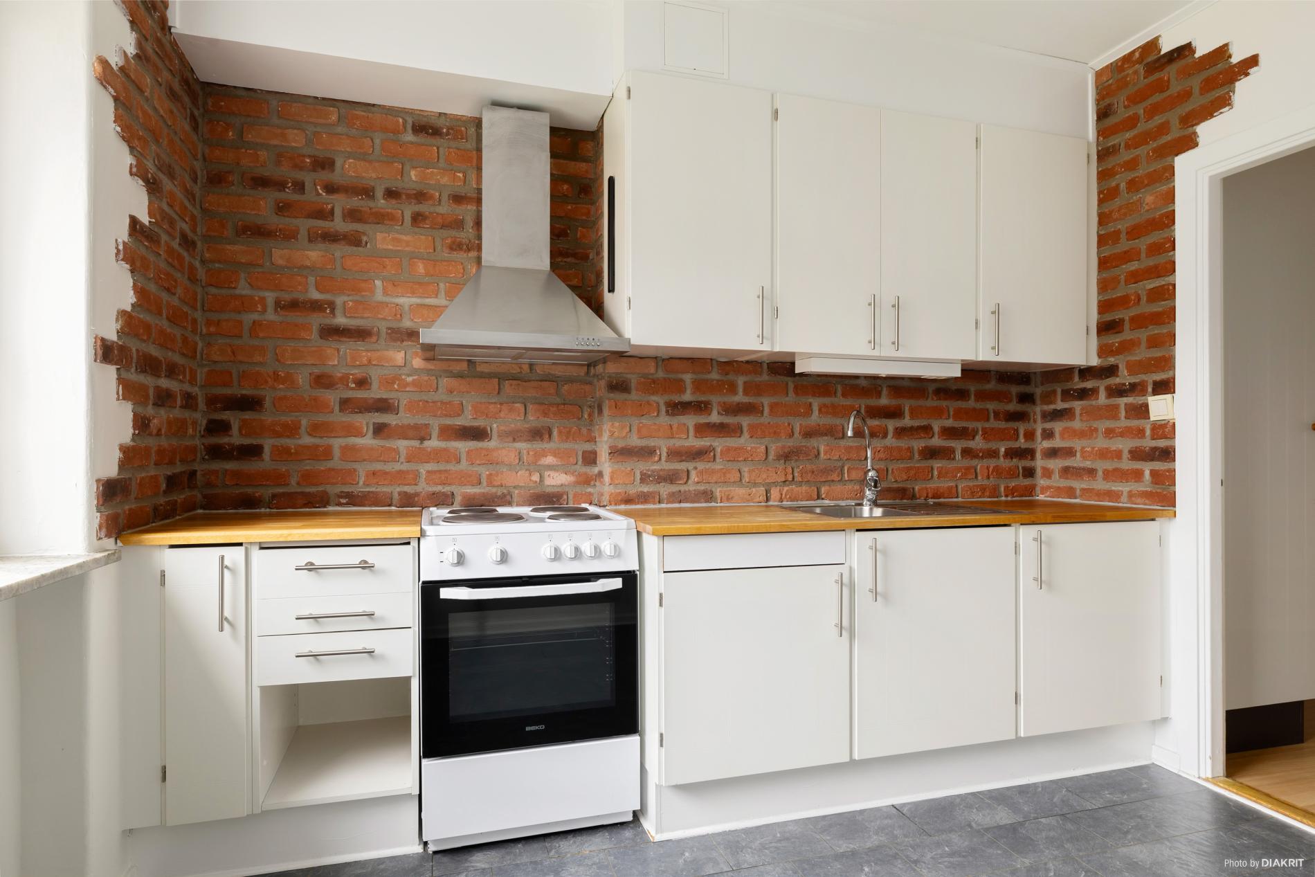 Trevligt kök med plats för matbord. Köket är i vitt med bänkskiva i trä. Här är det utrustat med kyl/frys, spis och köksfläkt. i köket är det laminatgolv och målade väggar med smakfullt tegel vid köksbänken.