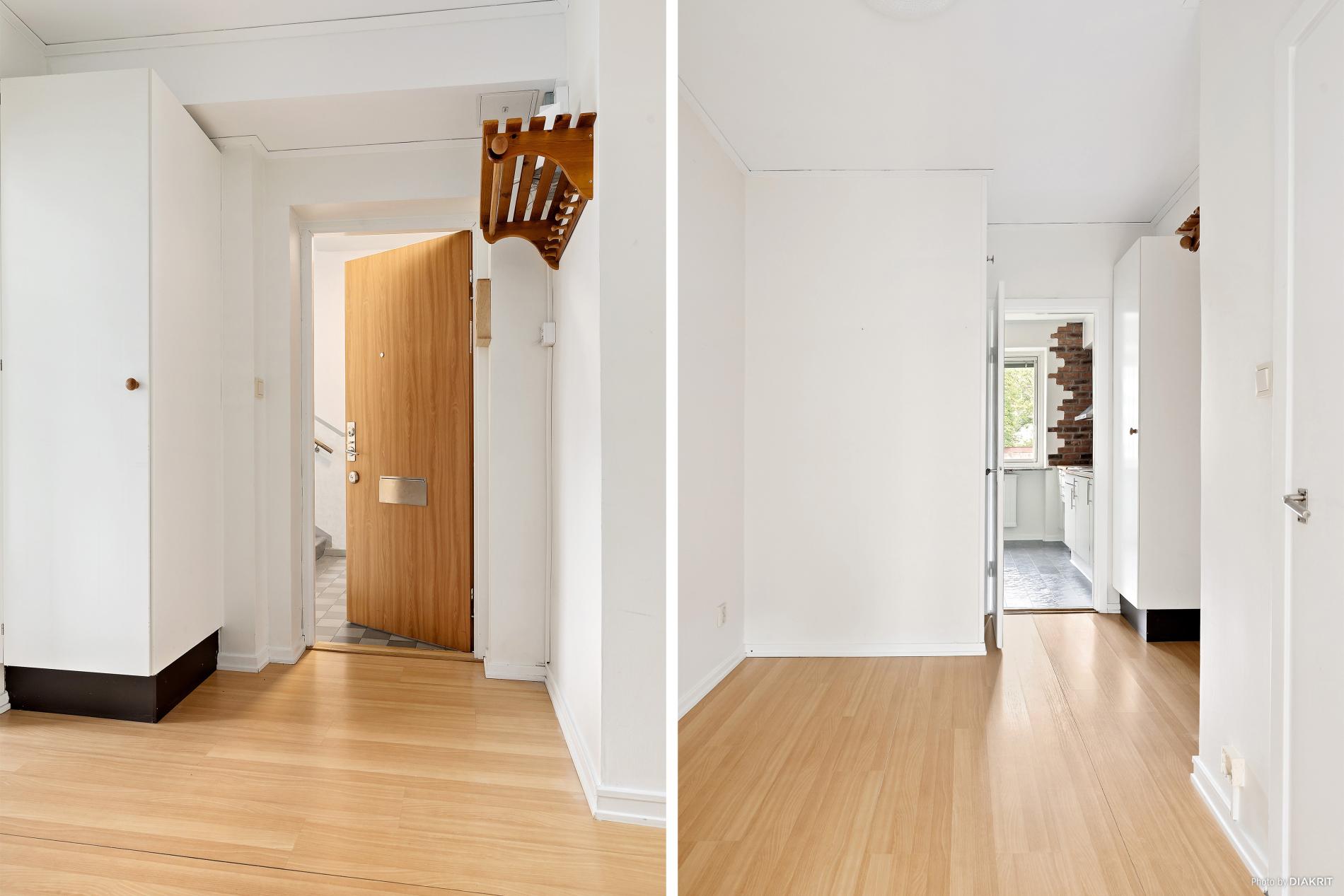 Varmt välkommen in i hallen! Här finner ni en möblerbar hall. Hallen har laminatgolv och målade väggar. Här finner ni praktisk förvaring i två större garderober.