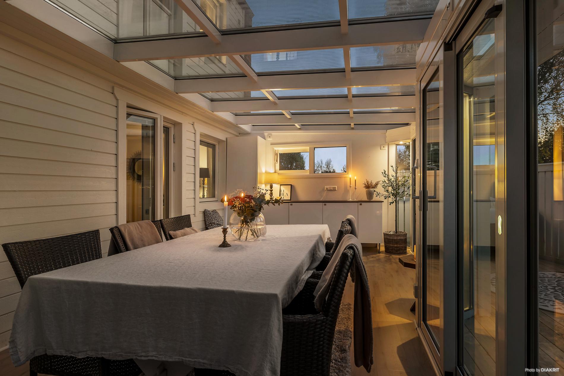 Gediget uterum (vinterbonat) från 2007 med plats för ett större matbord. Här finner ni förvaringsskåp, arbetsbänk, samt kyl. Trägolv och Fönsterpartier i tre solstreck! Uterummet värms upp med hjälp av en luft/luftvärmepump. Utanför finns altan med plats för mindre soffgrupp och solstolar.