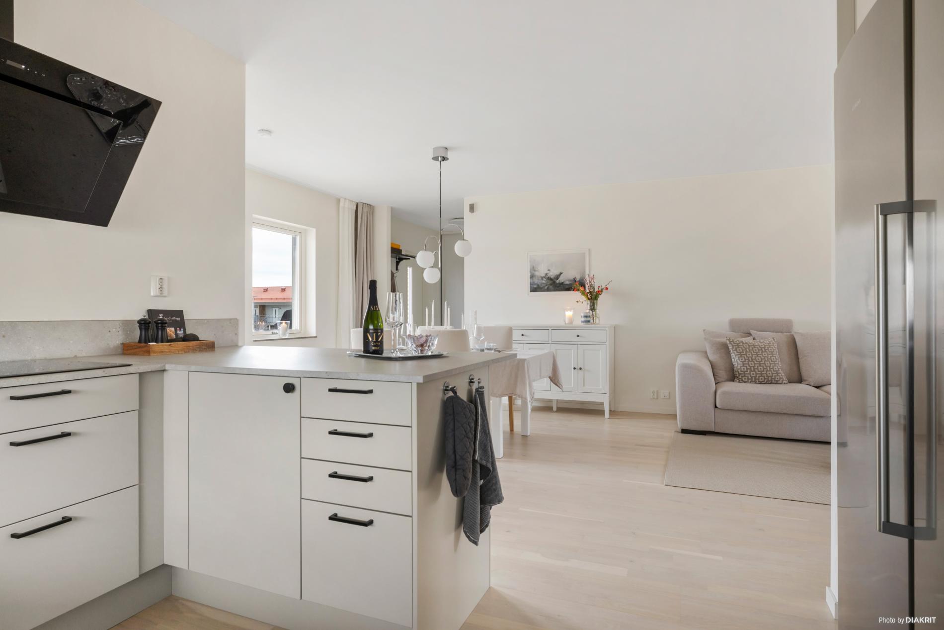 Modern och ljus fyrarummare med två balkonger. Välkommen in i en trevlig hall med klinkergolv samt garderober med skjutdörrar längs ena väggen. Vardagsrummet har stora fönster som ger fint ljusinsläpp och utgång till två balkonger. Fräscht och påkostat Marbodalkök med exklusiva vitvaror från Siemens och integrerad diskmaskin. Lägenheten har genomgående 3-stavs ekparkett, vitmålade tak och målade väggar. Bostaden har justerbar golvvärme i samtliga rum. Fina fönsterbänkar i kalksten. Vita innerdörrar. Tre stycken bra sovrum med garderober. Dessutom är det helkaklat badrum med tvättmaskin och torktumlare. I avgiften ingår parkeringsplats och ett rymligt förråd i markplan.