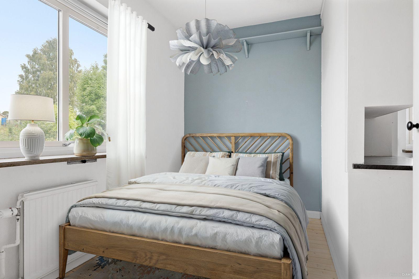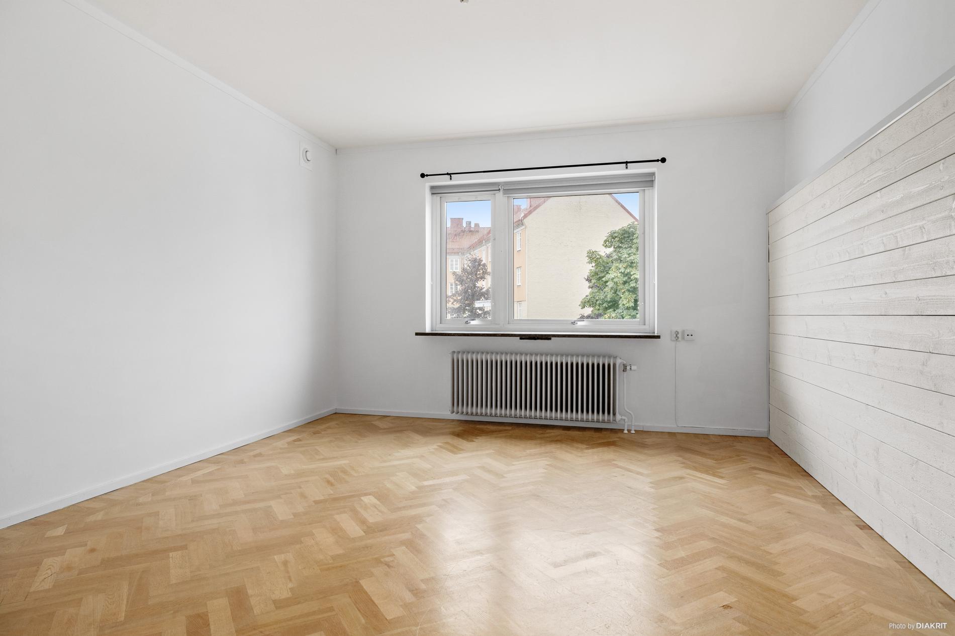 Sovrum alternativt matrum med vitmålade väggar och trägolv.